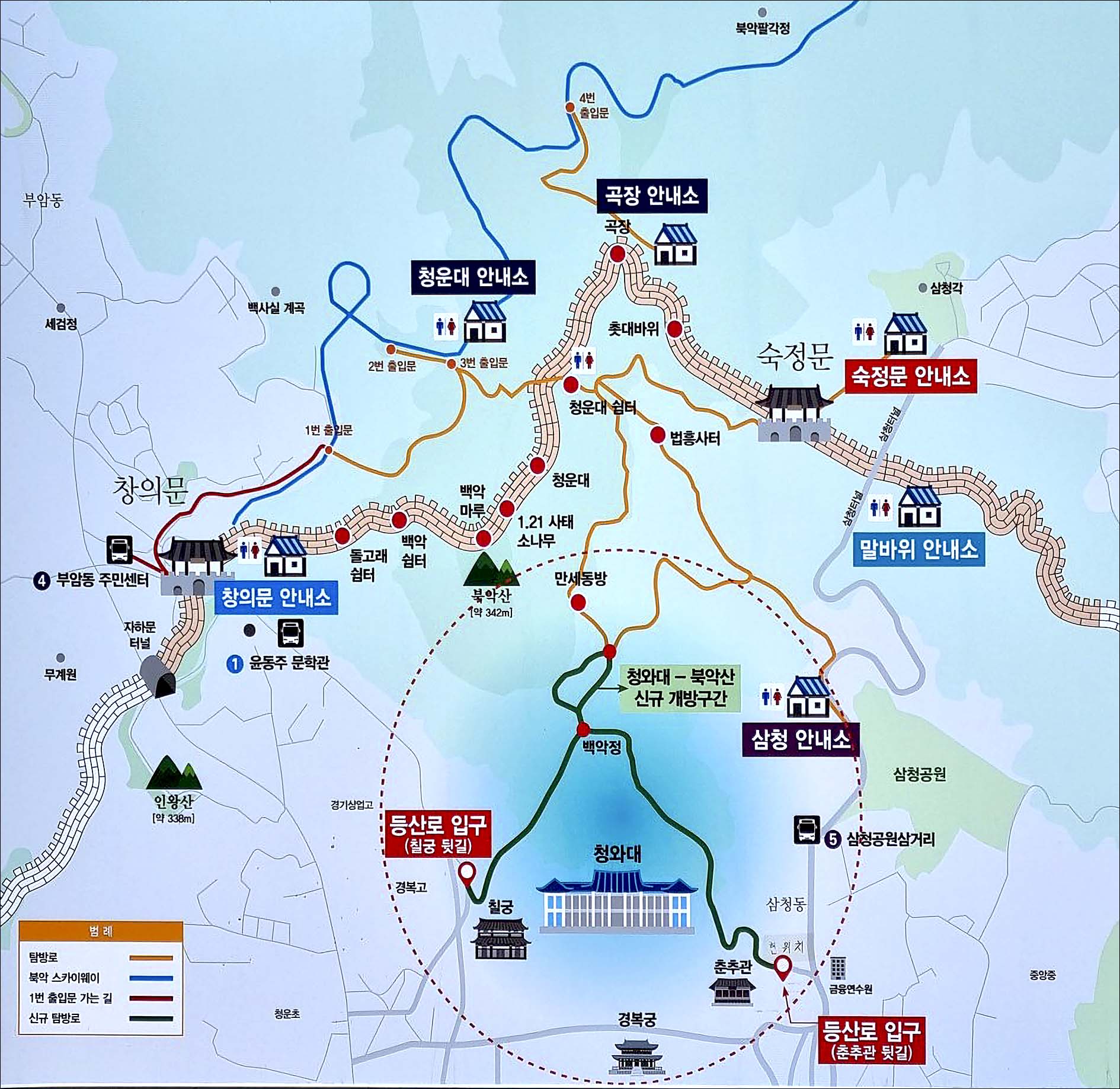 창의문안내소 - 백악산 - 청운대 - 곡창 - 숙정문 - 말바 위안 내소 - 와룡공원