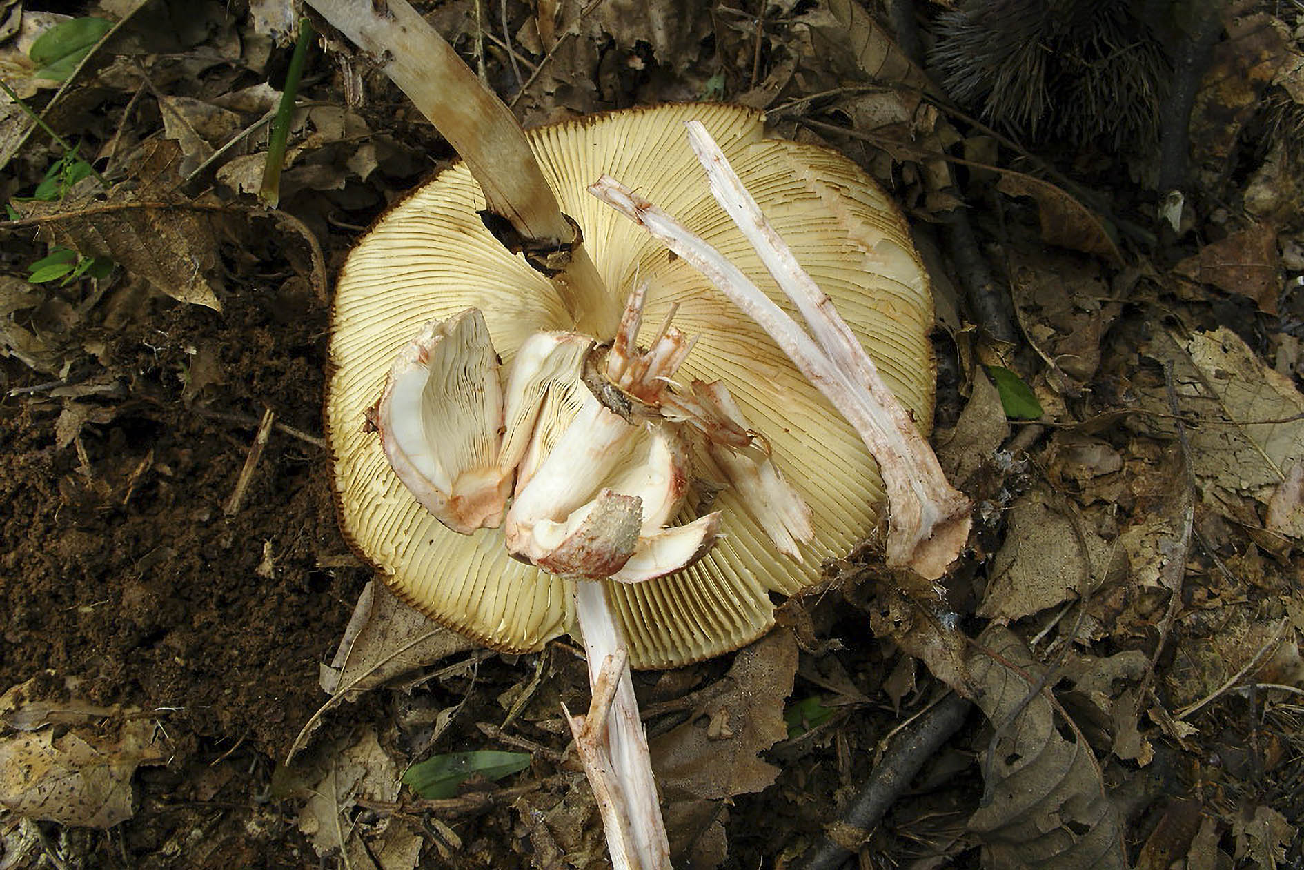 흰 독 큰 갓버섯은 버섯을 쪼개거나 상처를 내면 상처부위가 적갈색에서