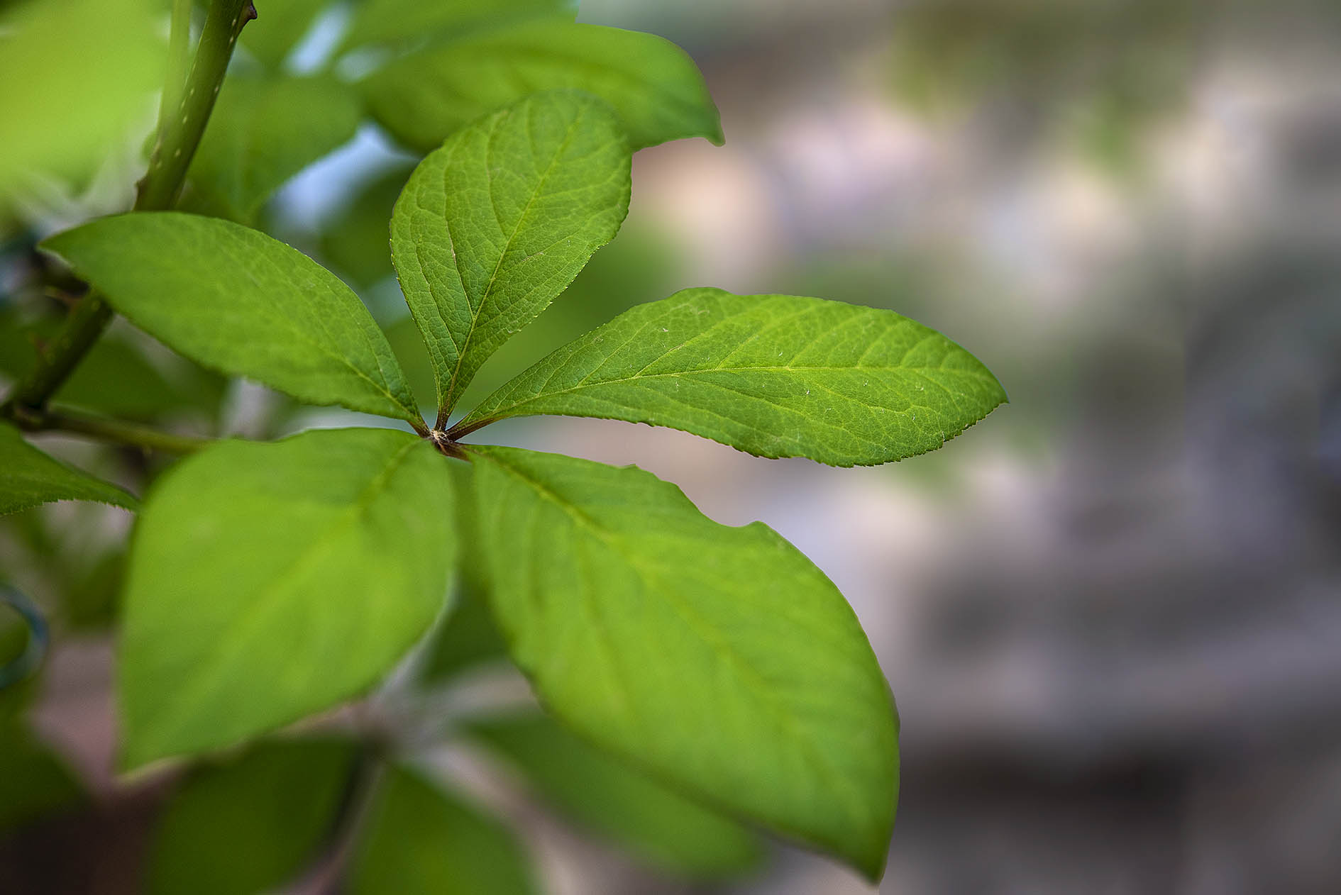 잎은 장상으로 다섯 개의 소엽은 거꿀달걀꼴 타원형이다.