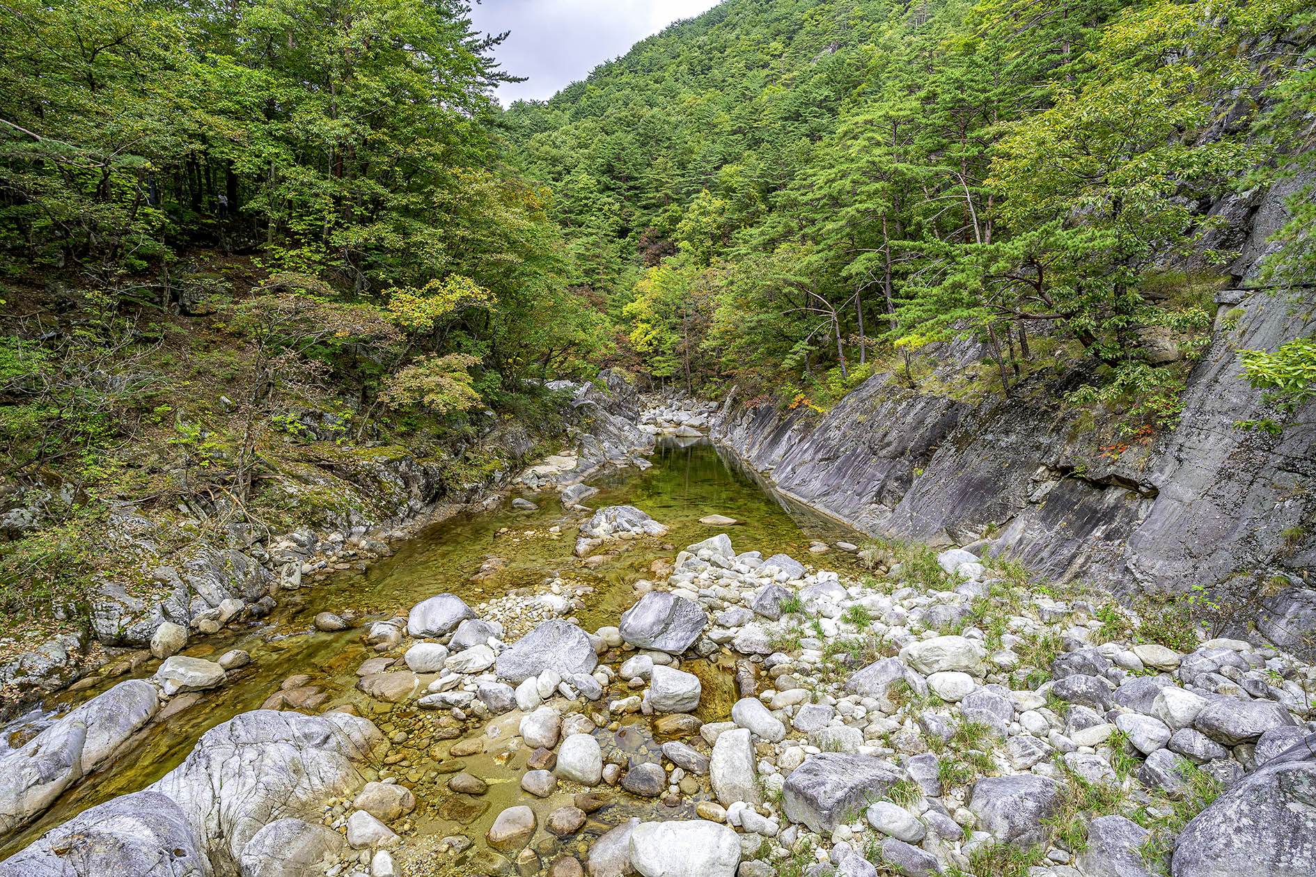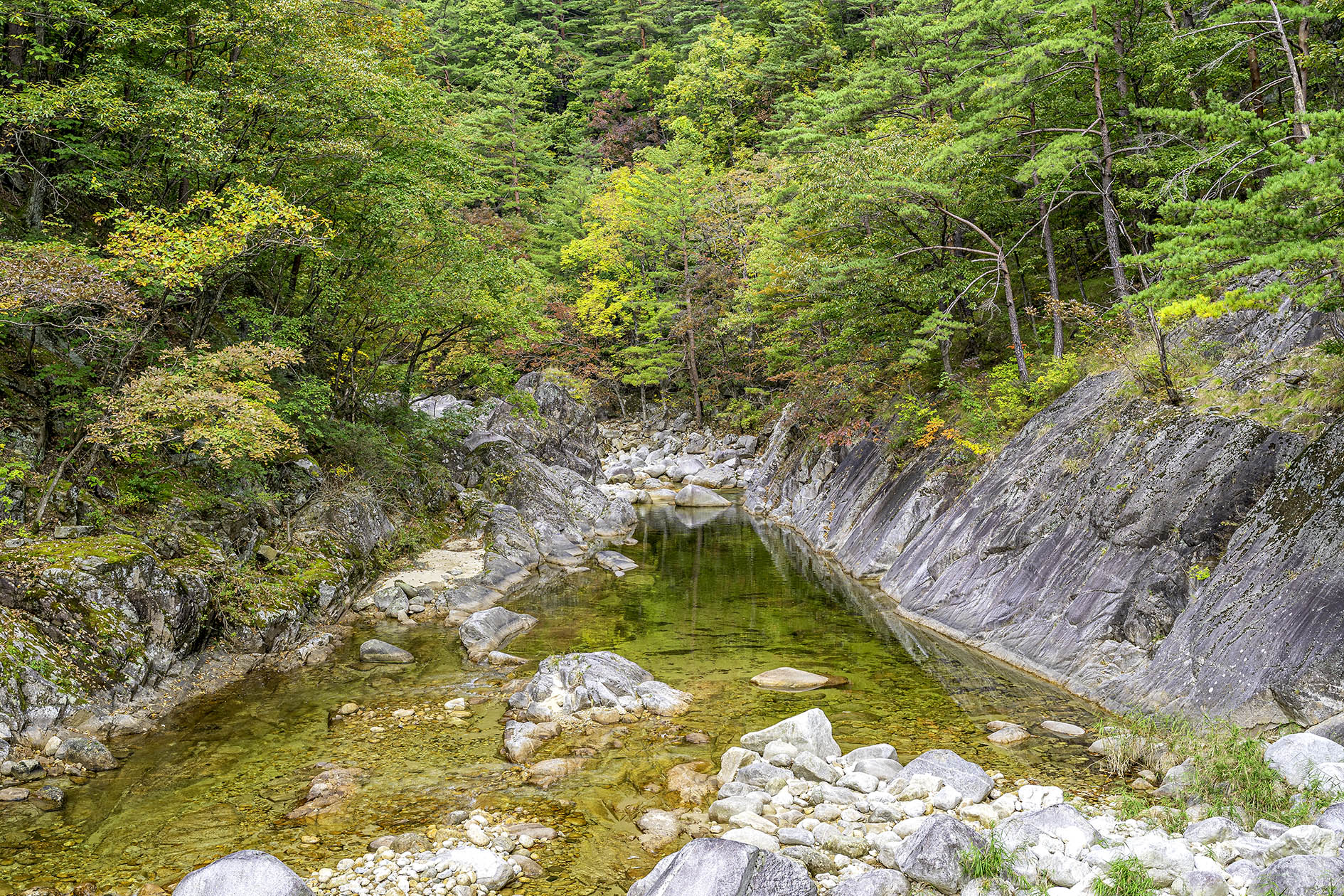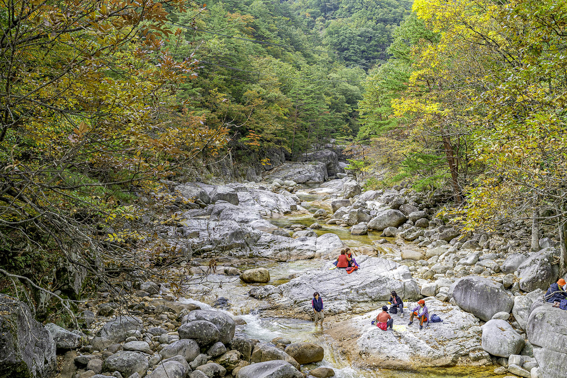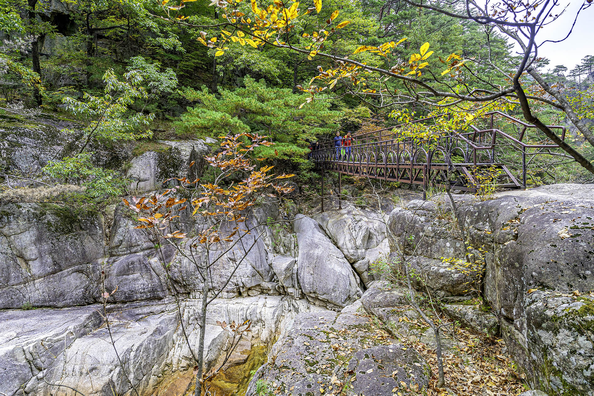 낙영폭포에서 무릉계까지 7km가량 이어지는 소금강계곡은 30여 개의 다리를