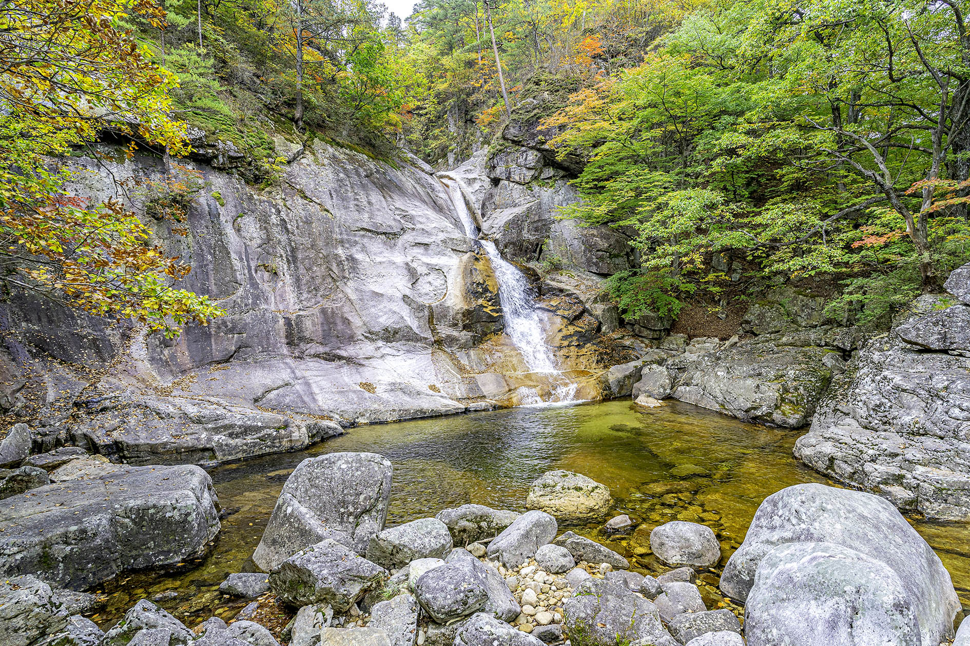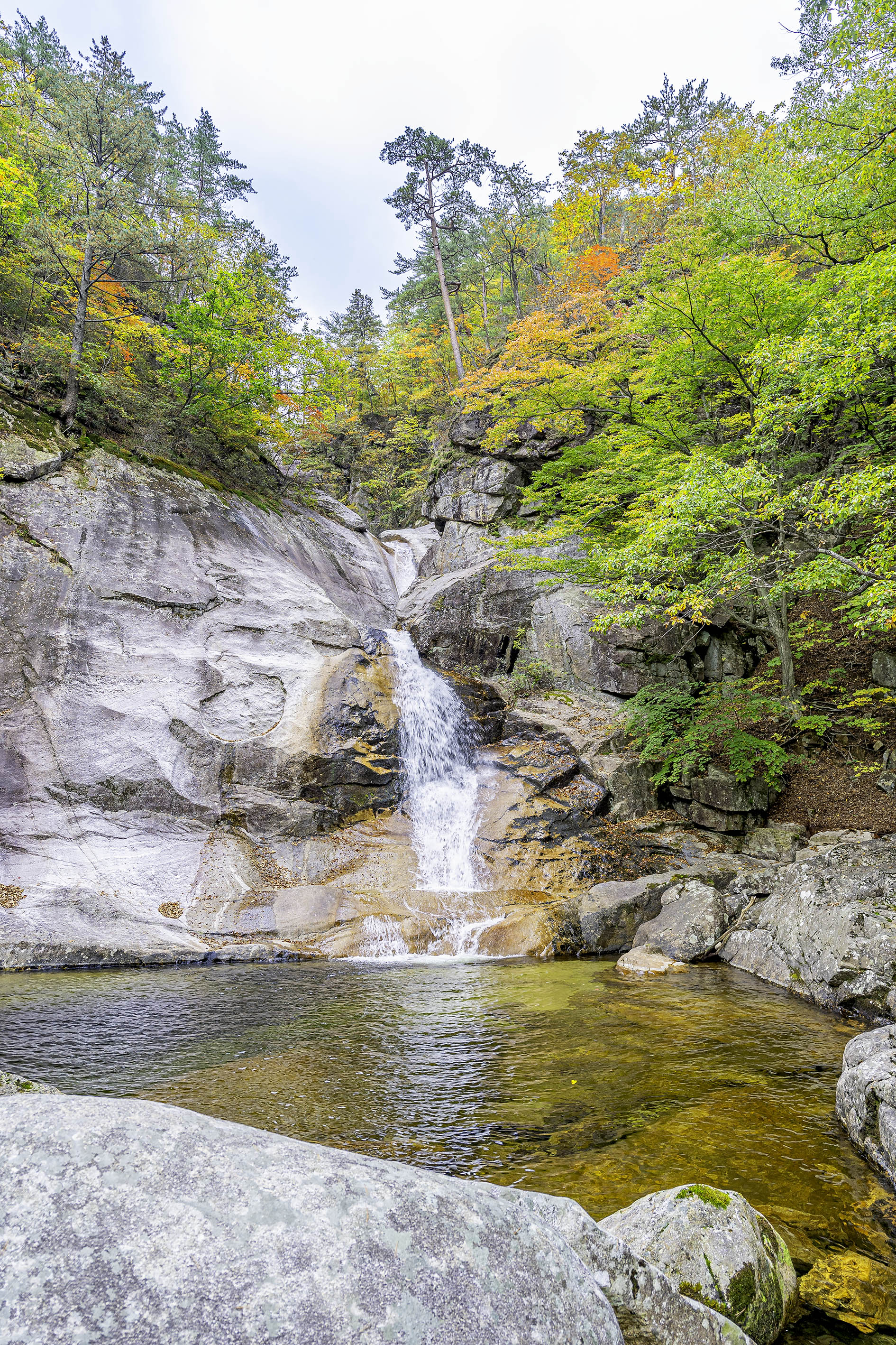 노인봉에서 소금강계곡으로 내려서면 낙영폭포가 나타난다.