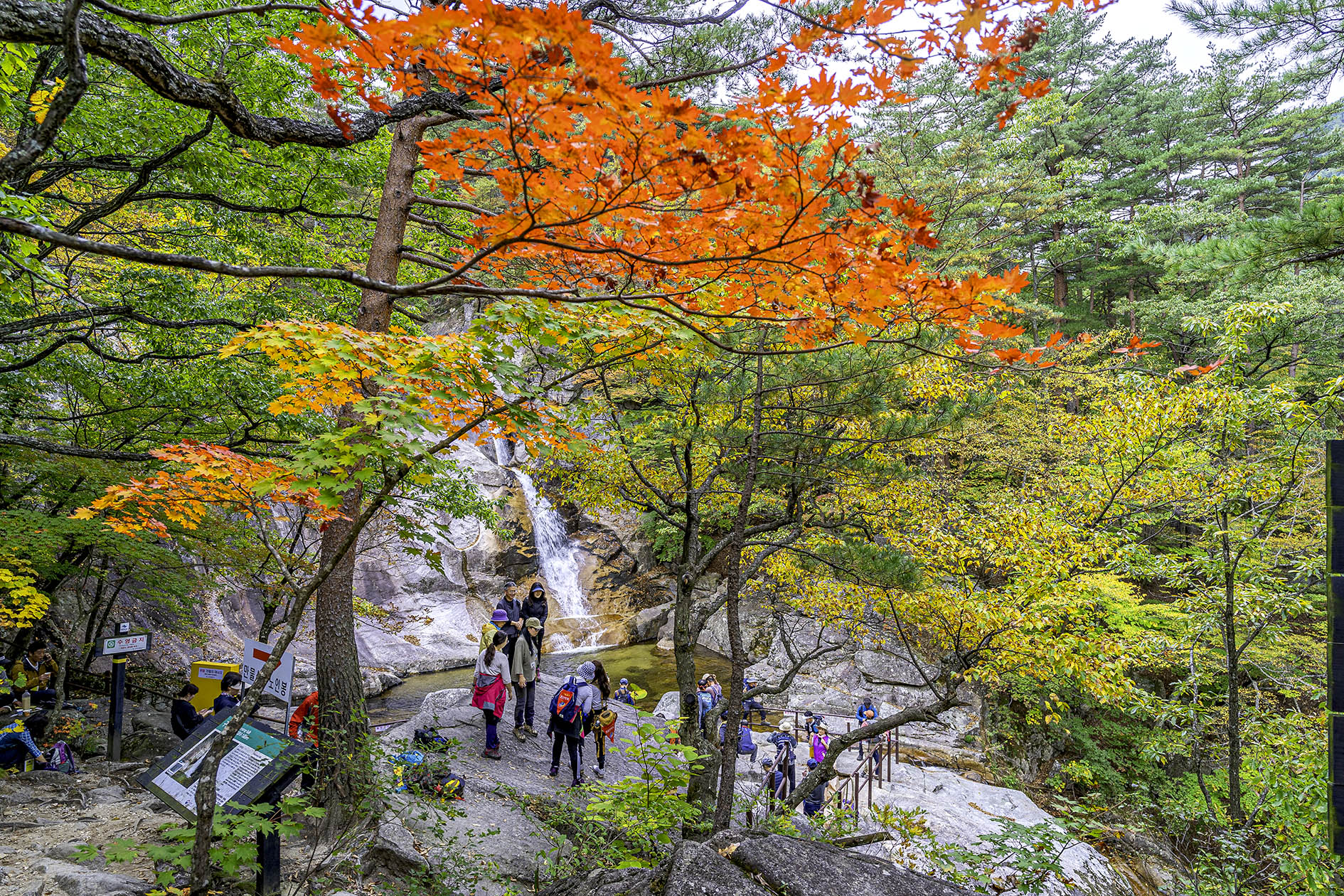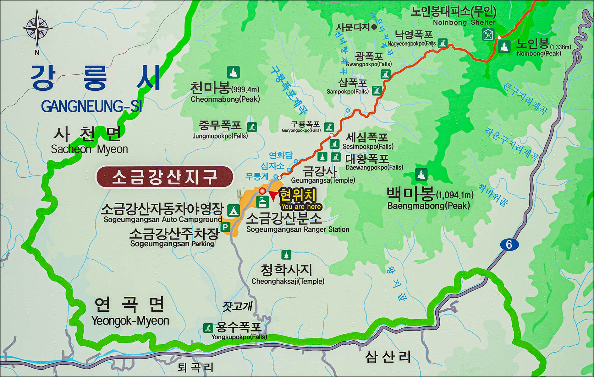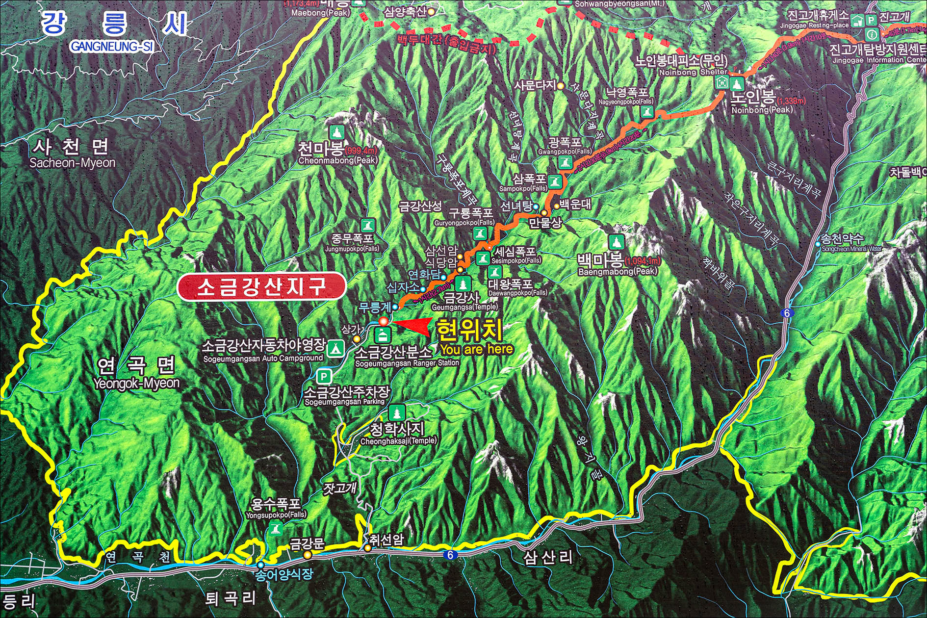 • 진고개 휴게소→매표소→노인봉→대피소→폭포→만물상→소금강 (약 5~6시간)