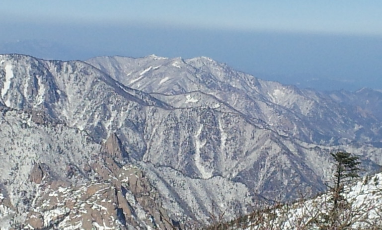 멀리 보이는 것이 가리봉(해발1,518m) 그 옆에 있는 것이 주걱봉(해발1,401m)