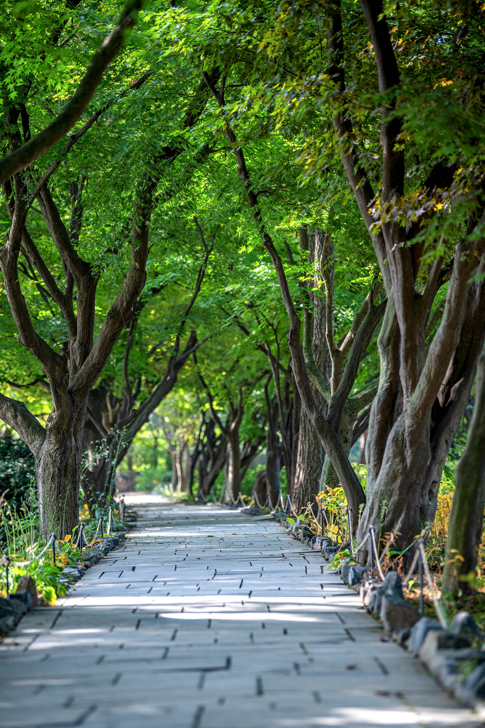 운치가 있는 나무 그늘, 그늘 사이로 드리워진 빛줄기, 푸른 이끼 사이로 흘러가는 물.
