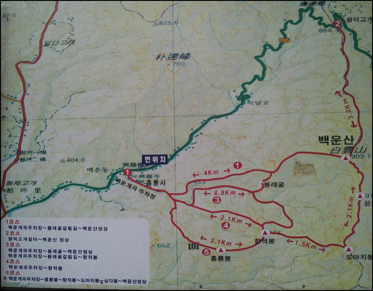 주차장 -흥룡사 -백운계곡 -남쪽능선 - 봉래굴 -정상 -남서능선 -흥룡사 -주차장