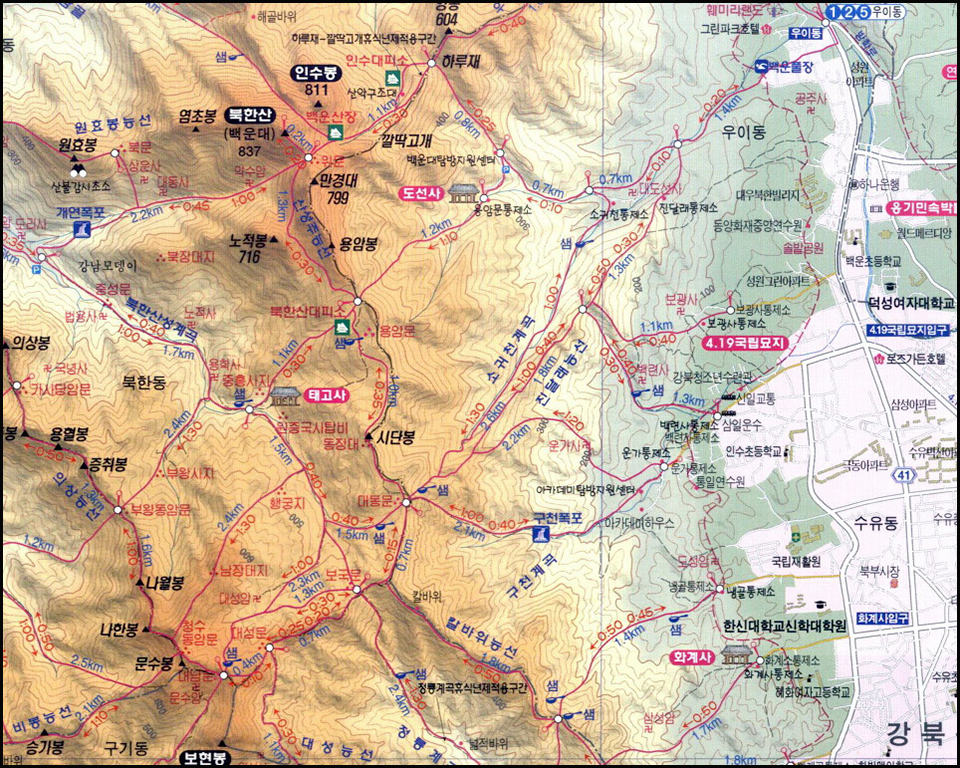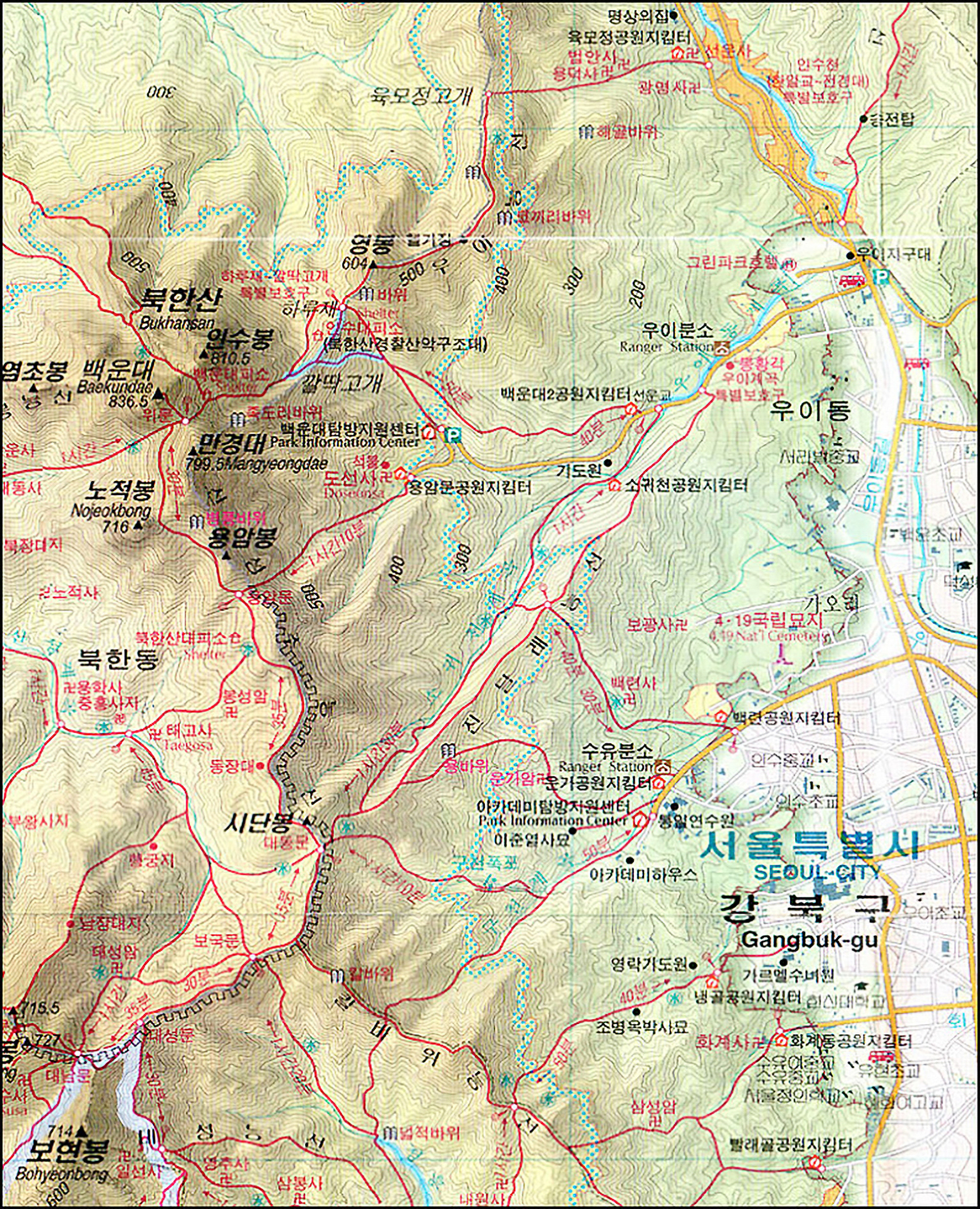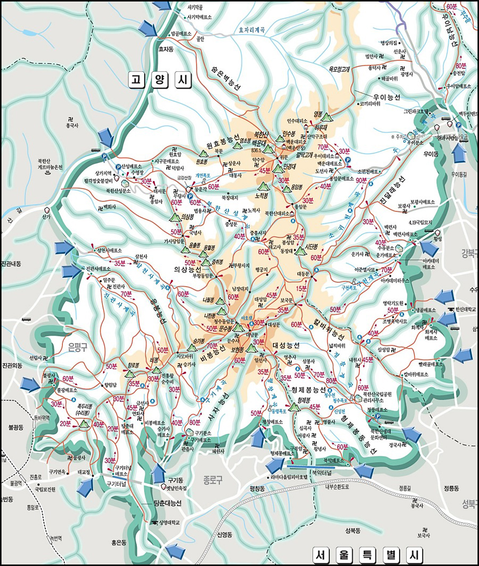 암봉들 사이에는 수려한 계곡이 발달했는데 정릉계곡, 산성계곡, 구기계곡, 진관사 계곡이