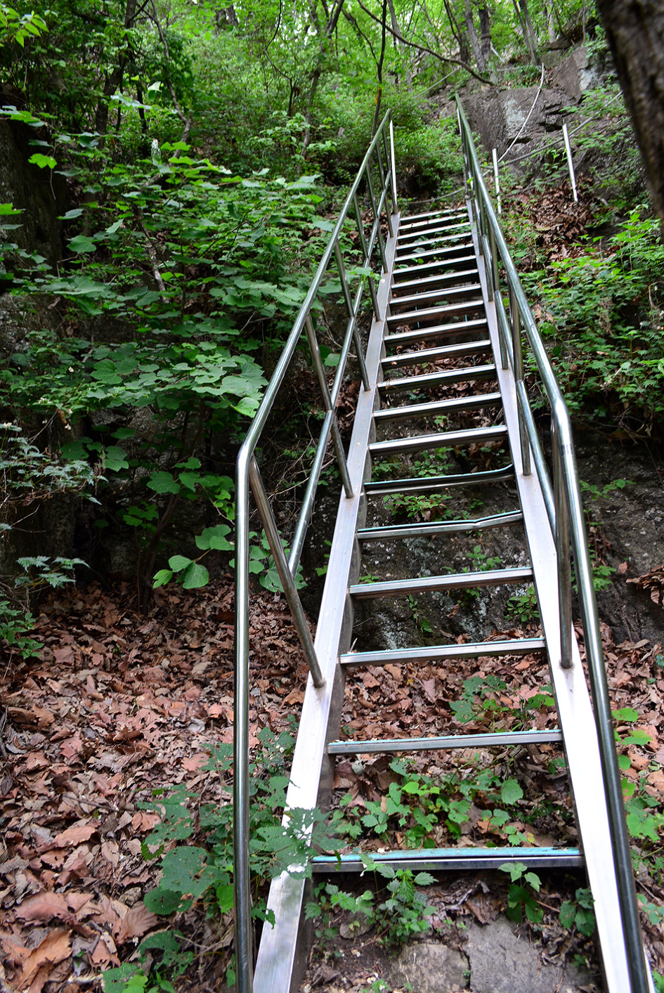 등산로를 따라 오르면 이정표와 함께 경사진 바위벽에 사다리가 걸려 있다.