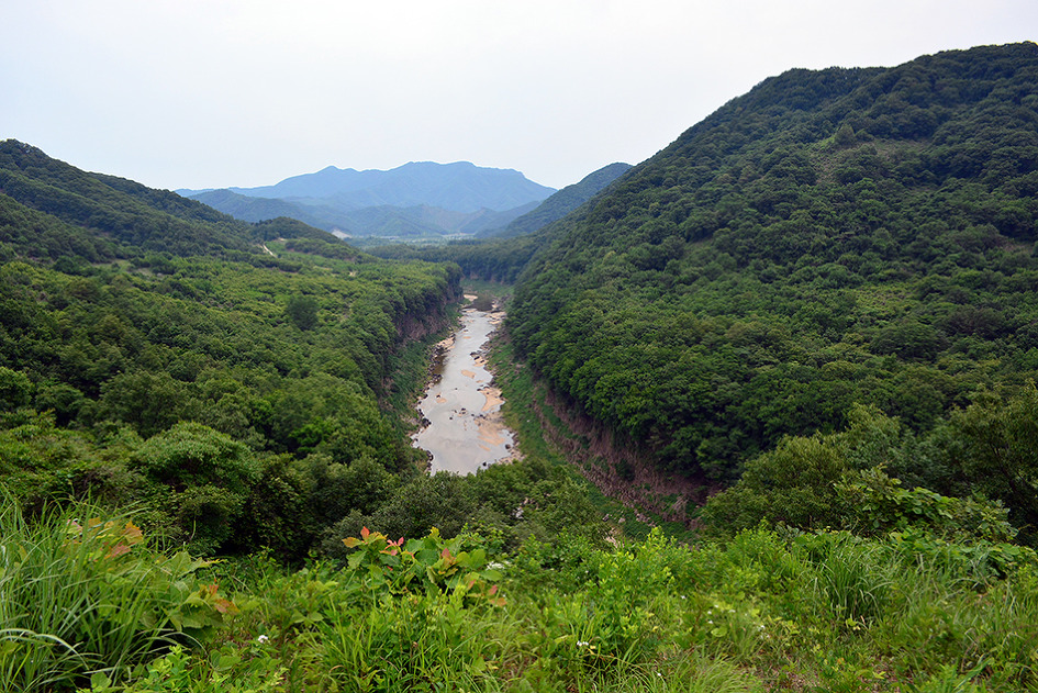 푸른 물결 굽어 도는 한탄강의 산허리가 보인다.