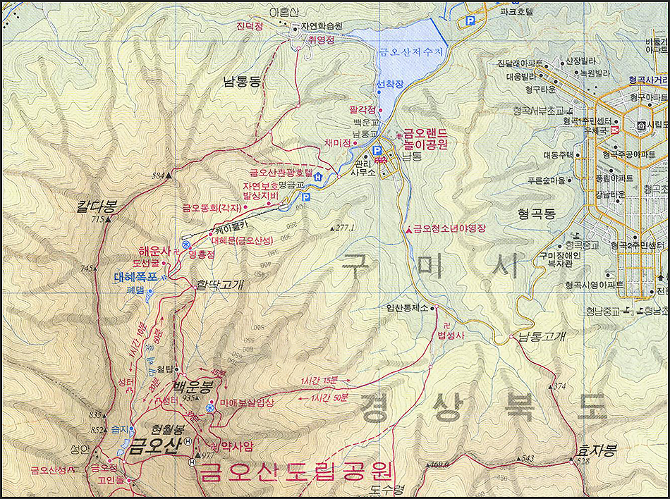 높이: 금오산(현월봉) 976m. (100대 명산)