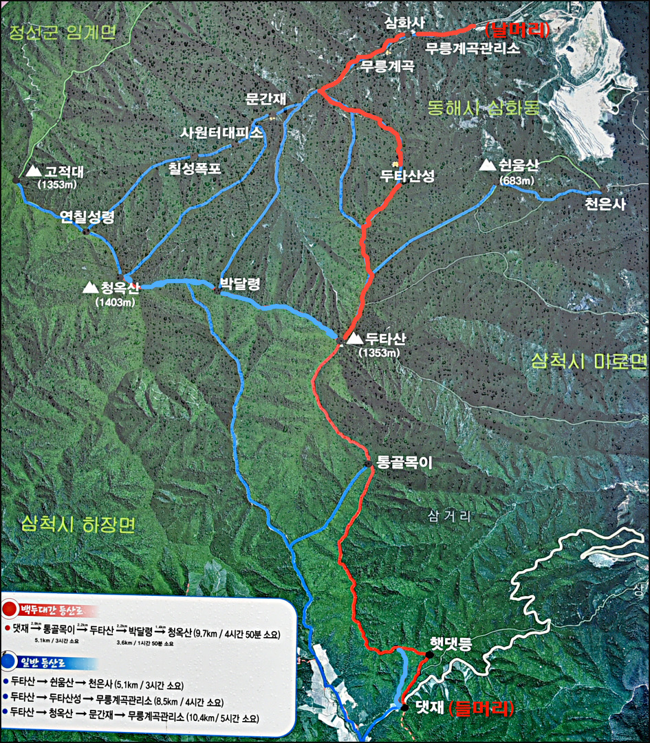 등산코스: 댓재(산신각) → 통골목이 → 두타산 6.1Km (3시간 소요)