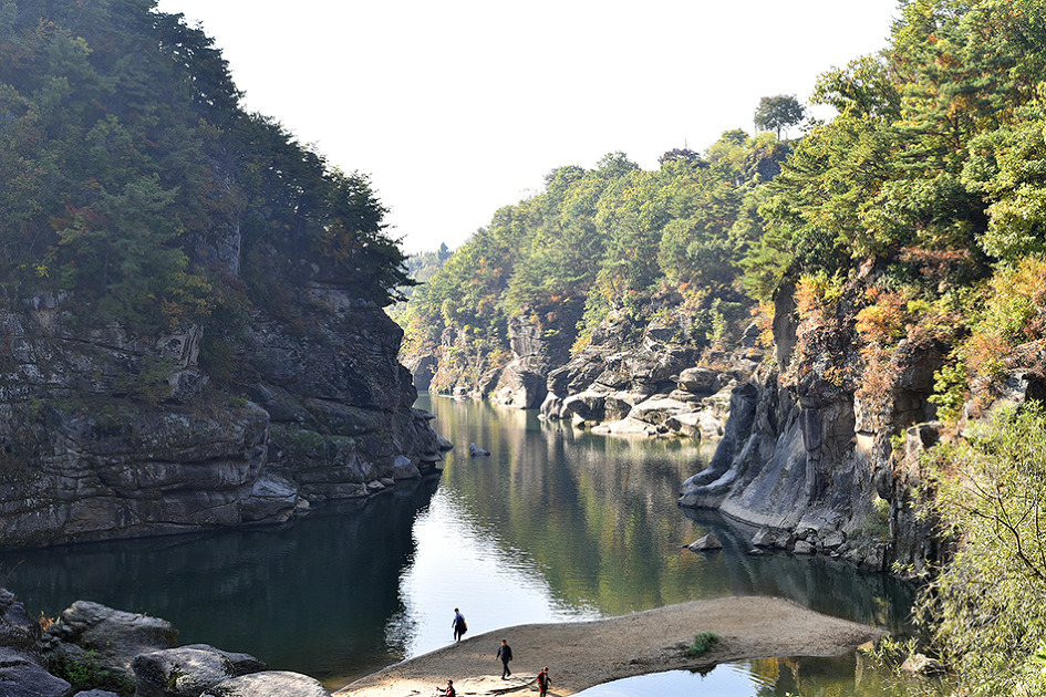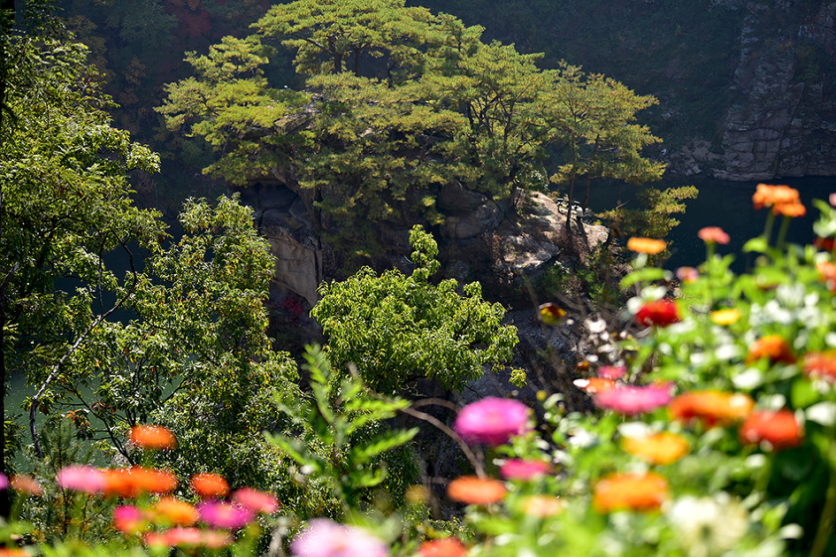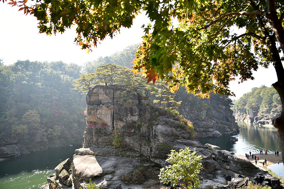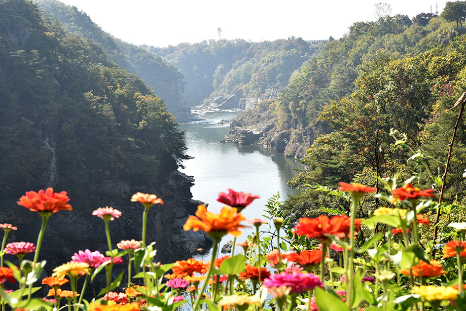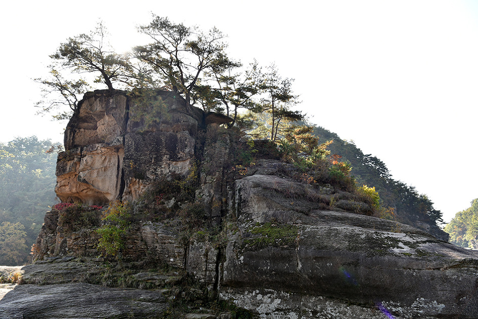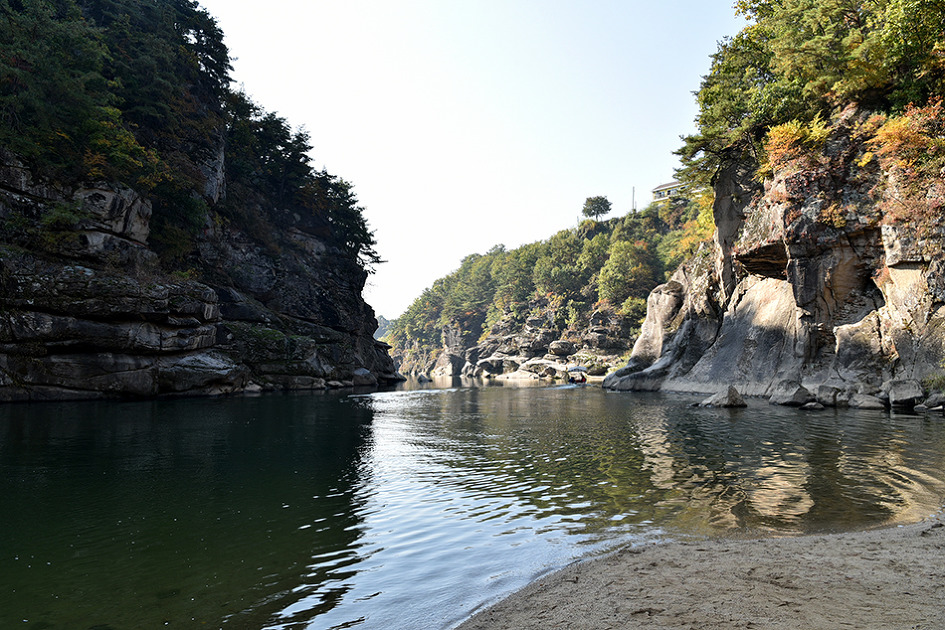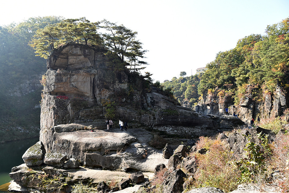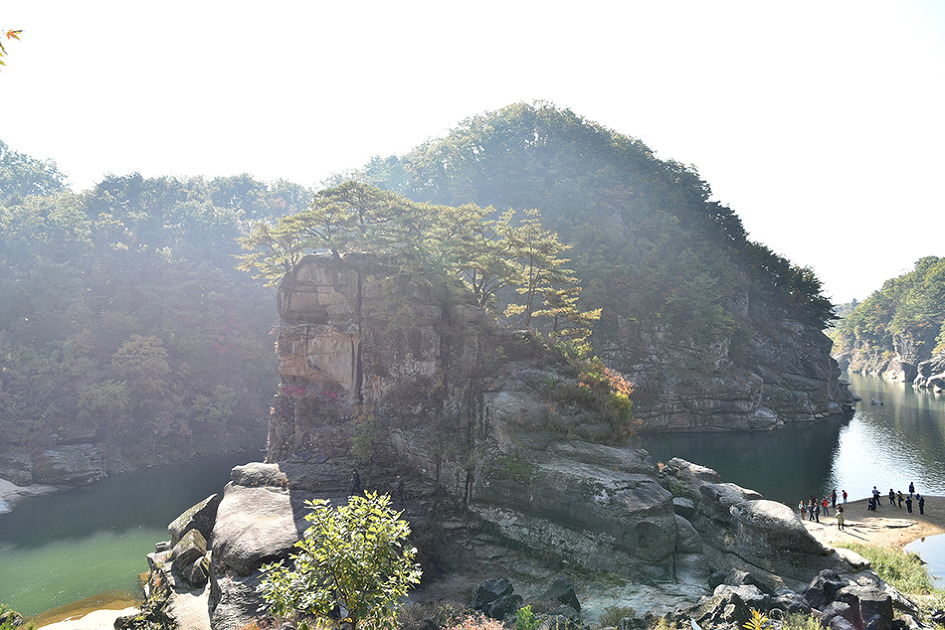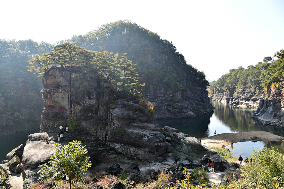 강 중앙에 10m 높이의 거대한 기암이 우뚝 솟아 있는 것이 특이한 남한대륙의 유일한 현무암