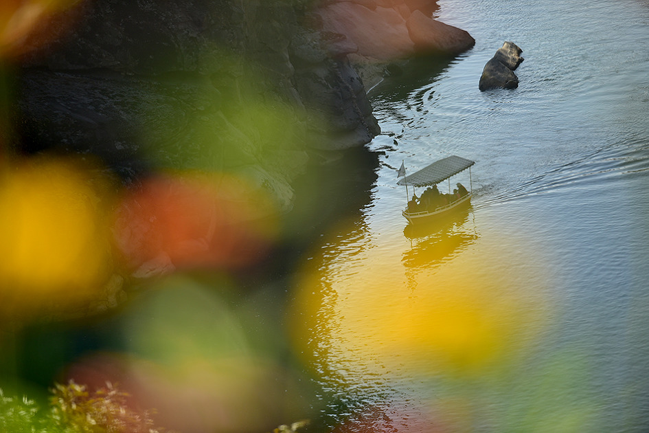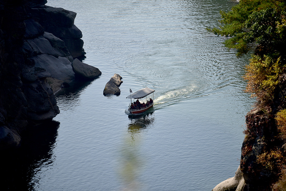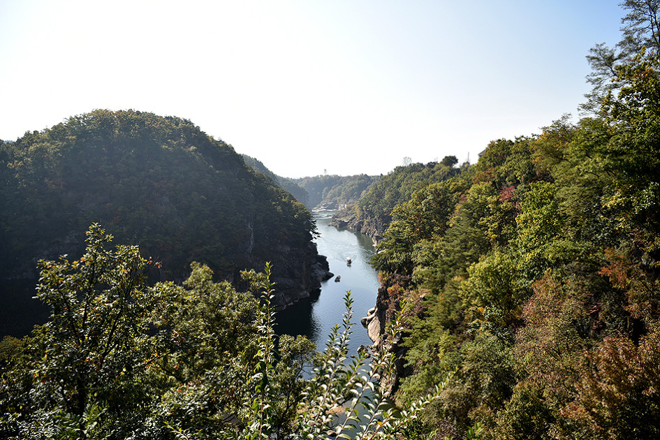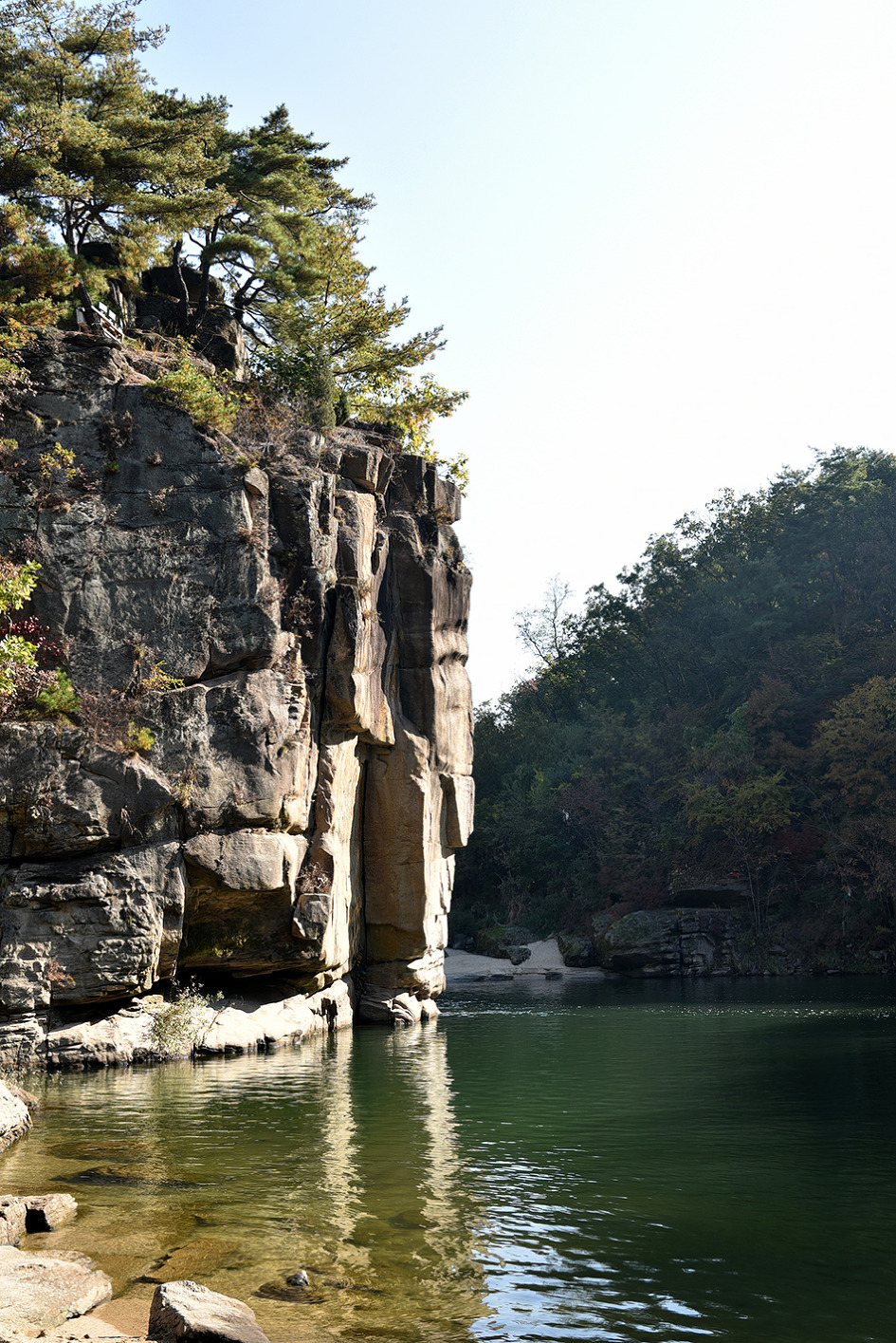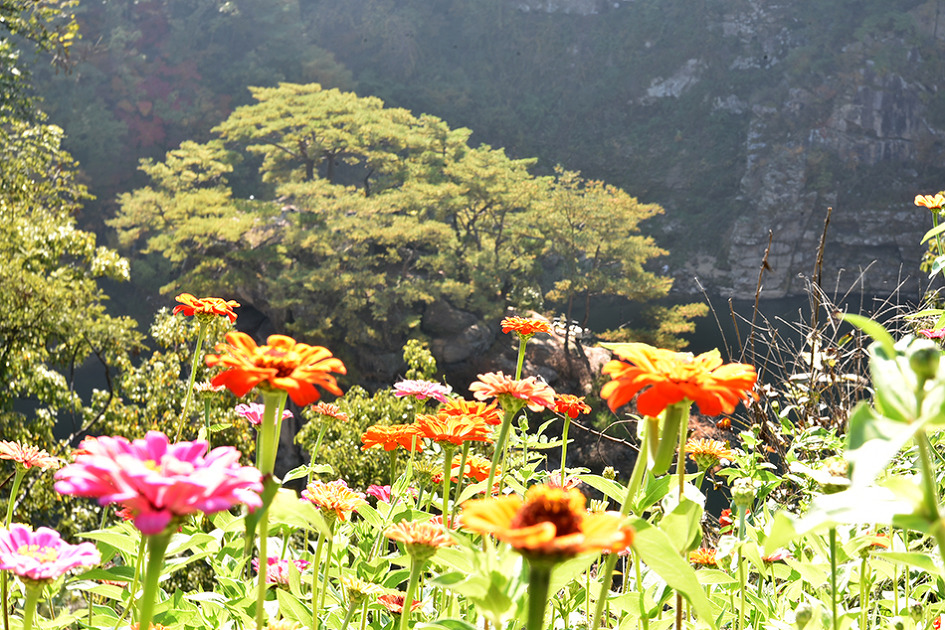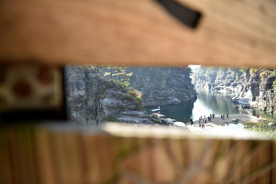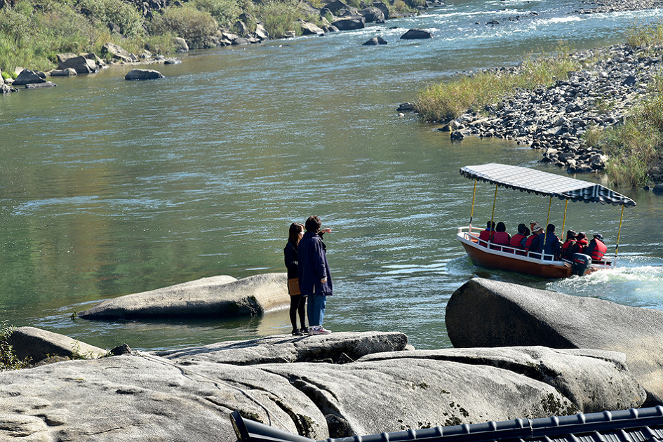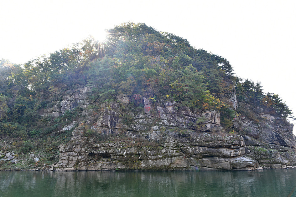 강 중앙에 10m 높이의 거대한 기암이 우뚝 솟아 있는 것이 특이한 남한대륙의 유일한 현무암