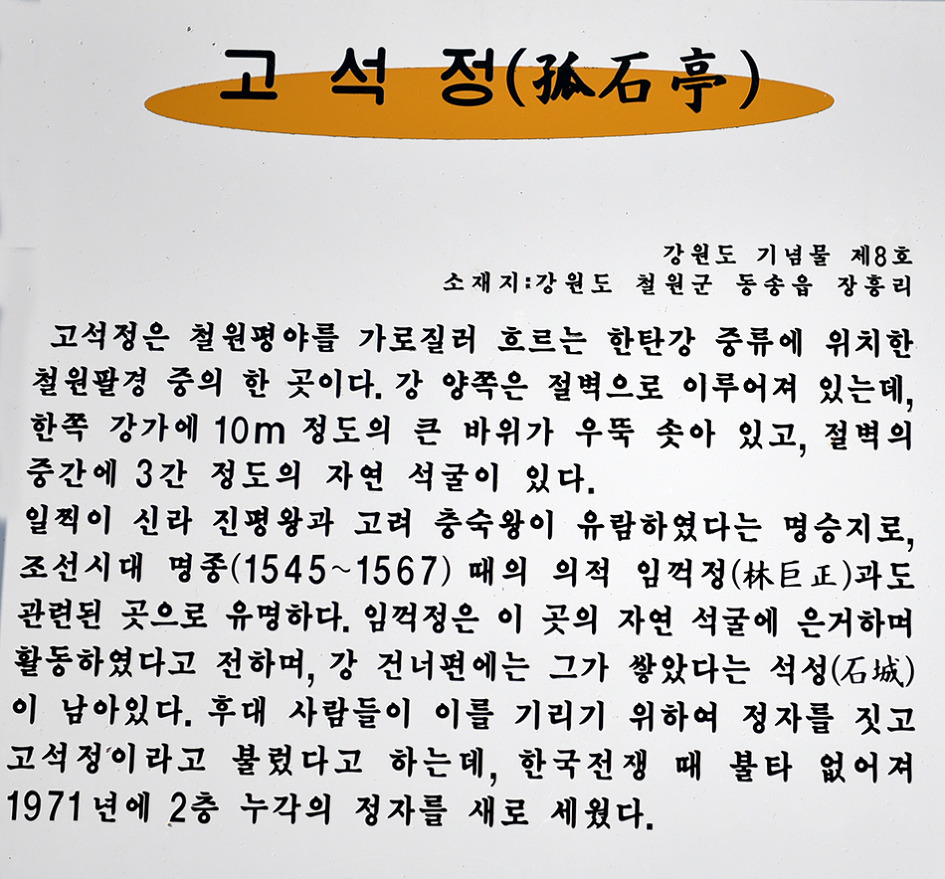 1977년 국민 관광지로 지정된 고석정은 한탄강 중류에 위치한 철원구경의 하나로