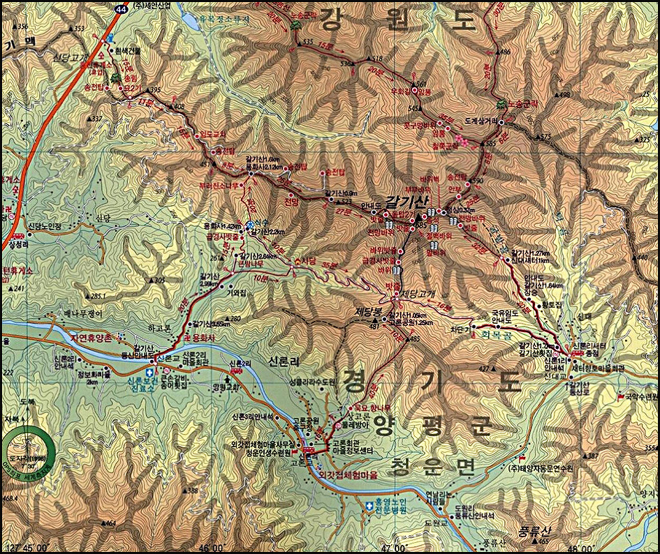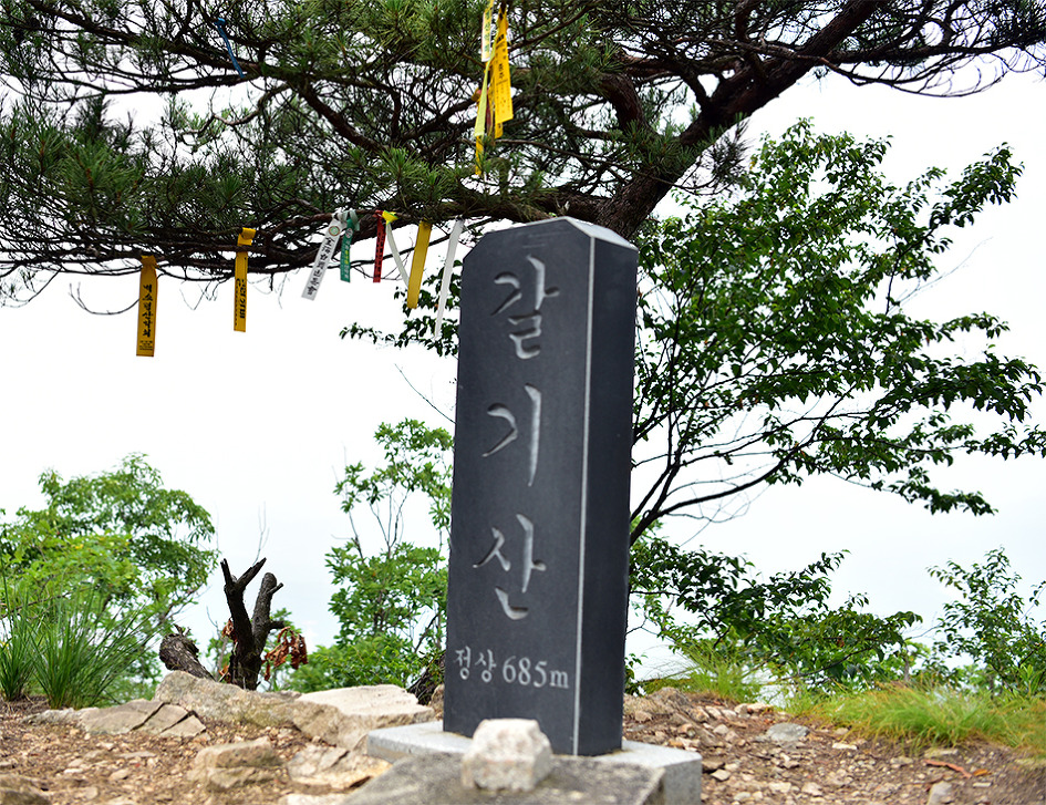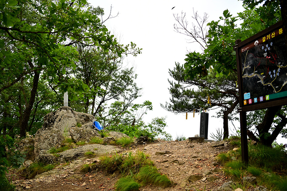 특징: 갈기산은 강원도 홍천군과 경기도 양평군 경계에 있는 산으로 정상에는 정상석 2개가 있다.