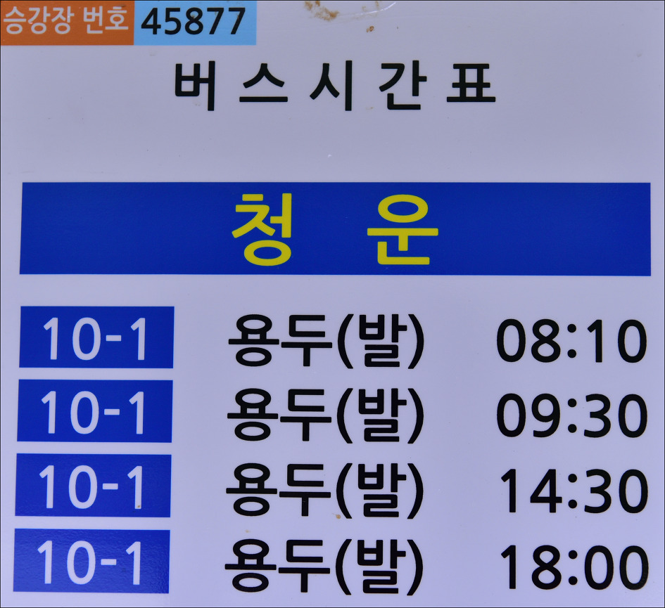 3. 신론리/새터종점에서 용두리버스터미널 행: 08:10, 09:30, 14:30, 18:00 (15분 소요)