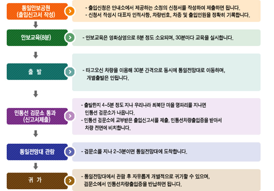 통일전망대관광이란 차량 출입증을 받으며 나올 때 다시 반납해야 한다.