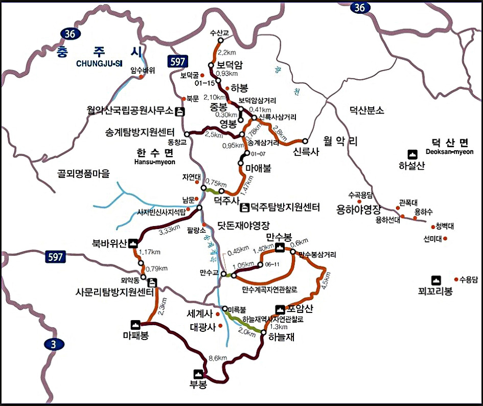 월악리 - 신륵사 - 삼거리 - 영봉(정상) - 중봉 - 하봉 - 보덕암 - 수산리