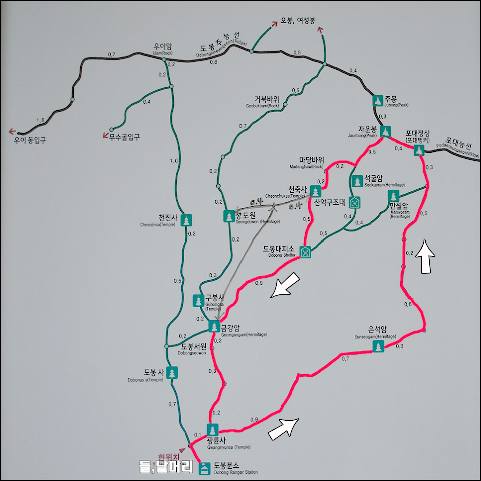 도봉 탐방안내소 -도봉서원 -도봉산장 -마당바위 -신선대 -칼바위 -우이암 -우이동