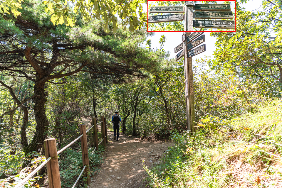 성불사에서 올라오는 길과 만나는 삼거리 이정표.
