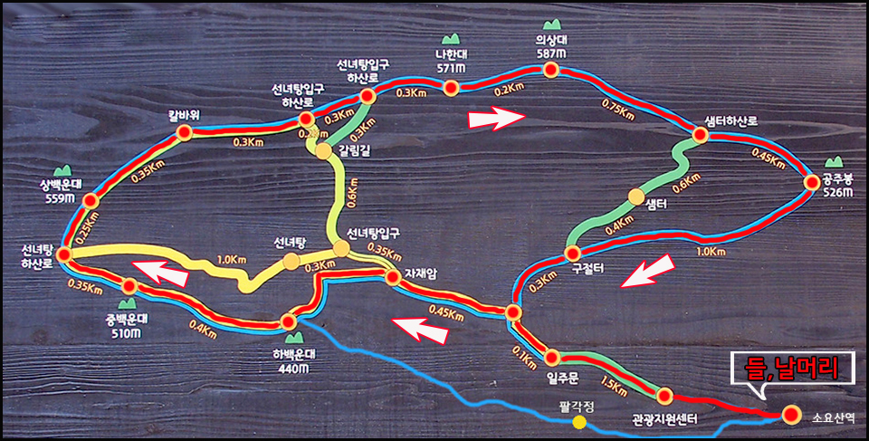 일주문 -자재암 - 하.중.상백운대 - 칼바위 -나한대 -의상대 -공주봉 - 일주문