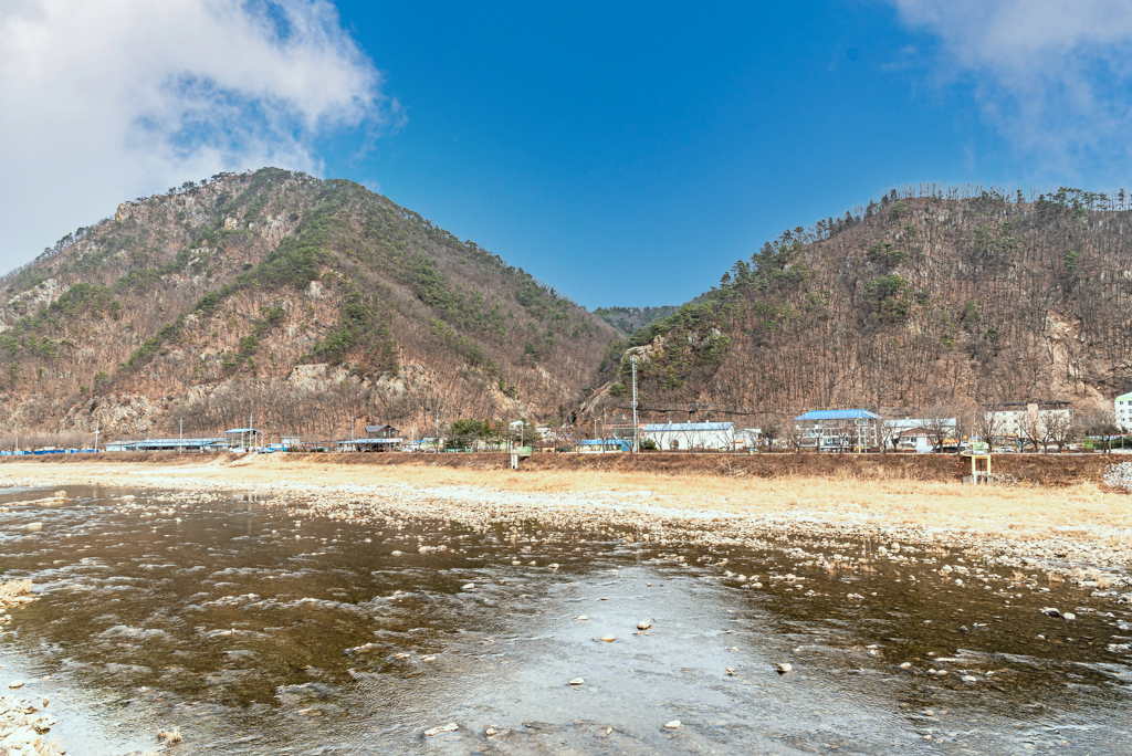 가평천 넘어 보납산 정상이 보인다.