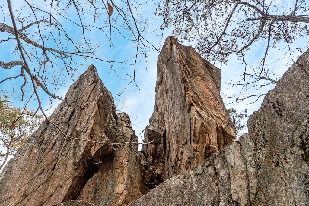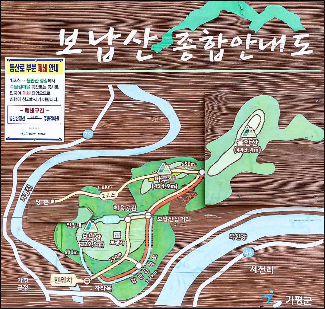 등산코스: 1. 자라목 - 보광사 - 보납 삼거리 - 물안 능선 - 물안산 - 주흘길 (6.7km)