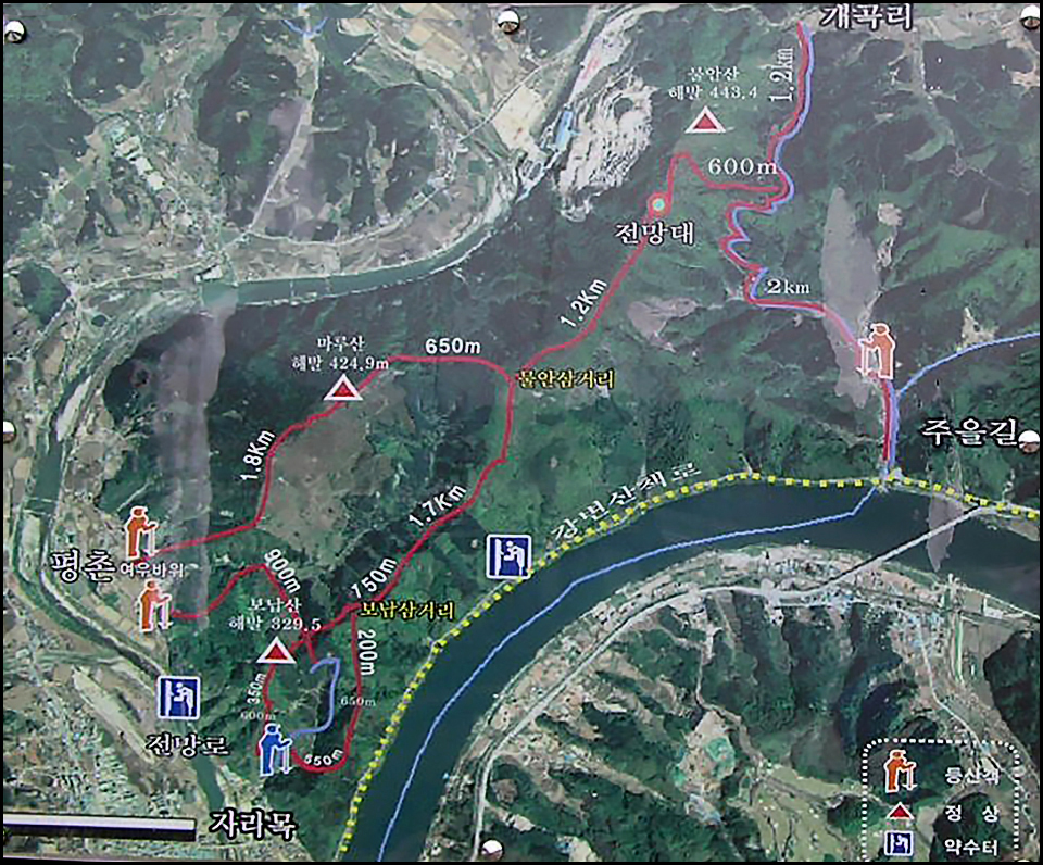그리고 경춘선 철도와 경춘가도를 통과하여 굽이굽이 흐르는 강물과 푸른 숲이 만나