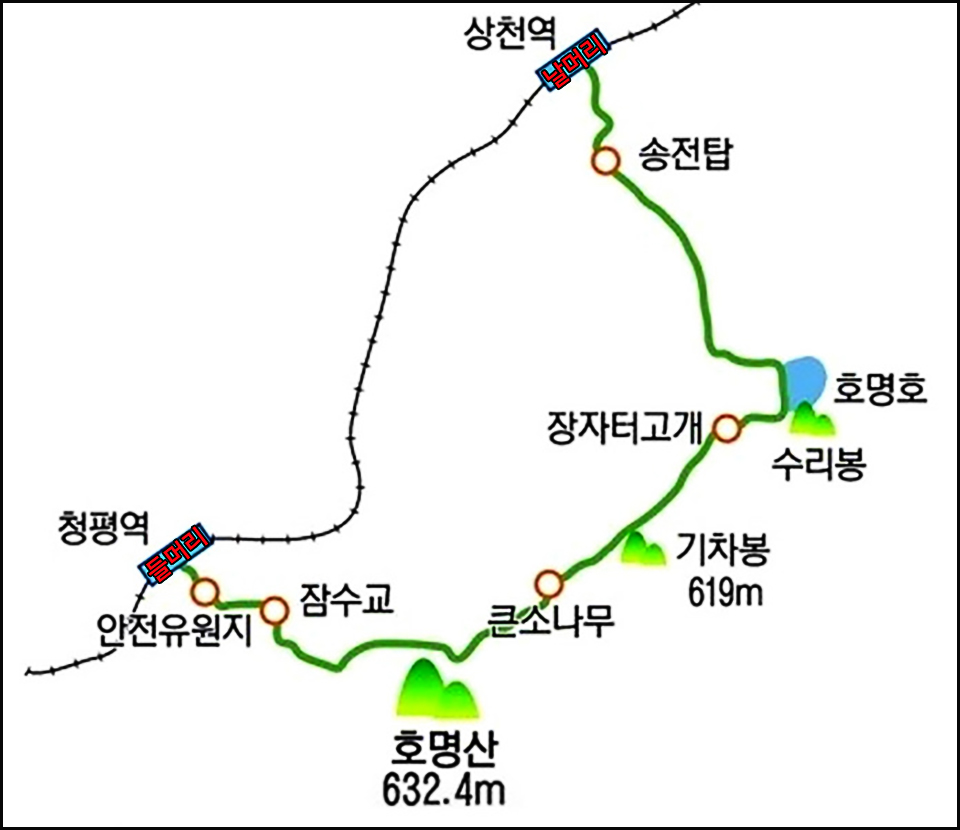 등산코스: 청평역 ~ 전망대 ~ 호명산 ~ 대성사 (2시간 30분)