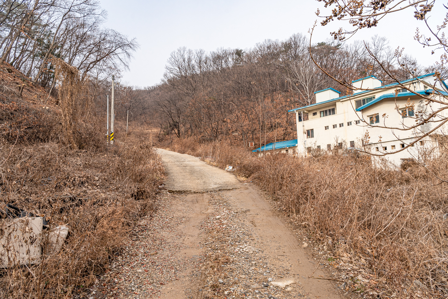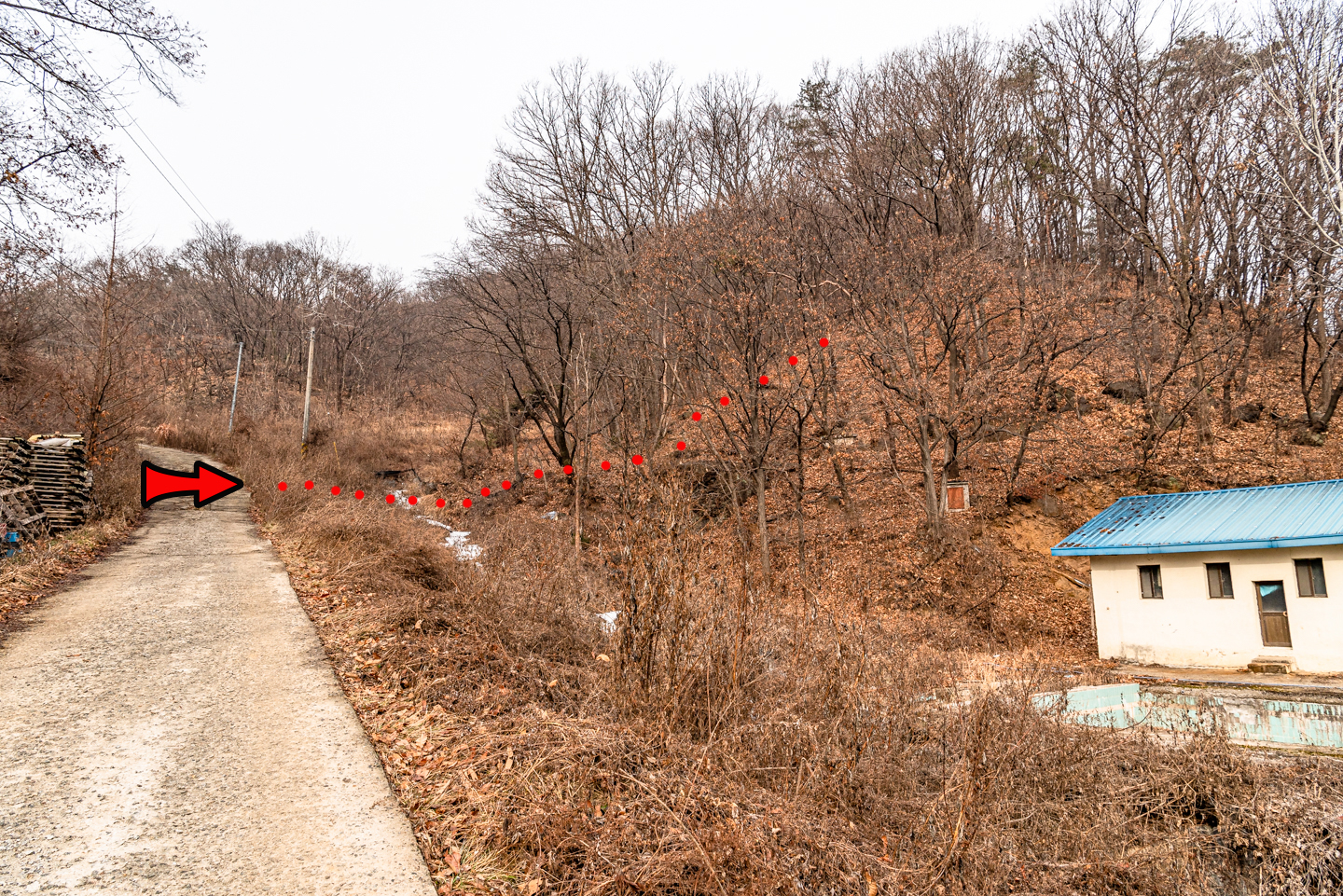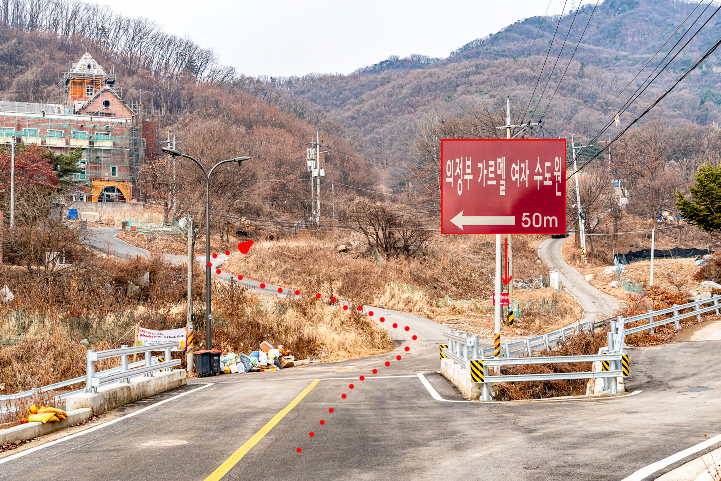 우측 건물이 끝나는 지점에 오르는 길이 있으며 이정표는 없다.
