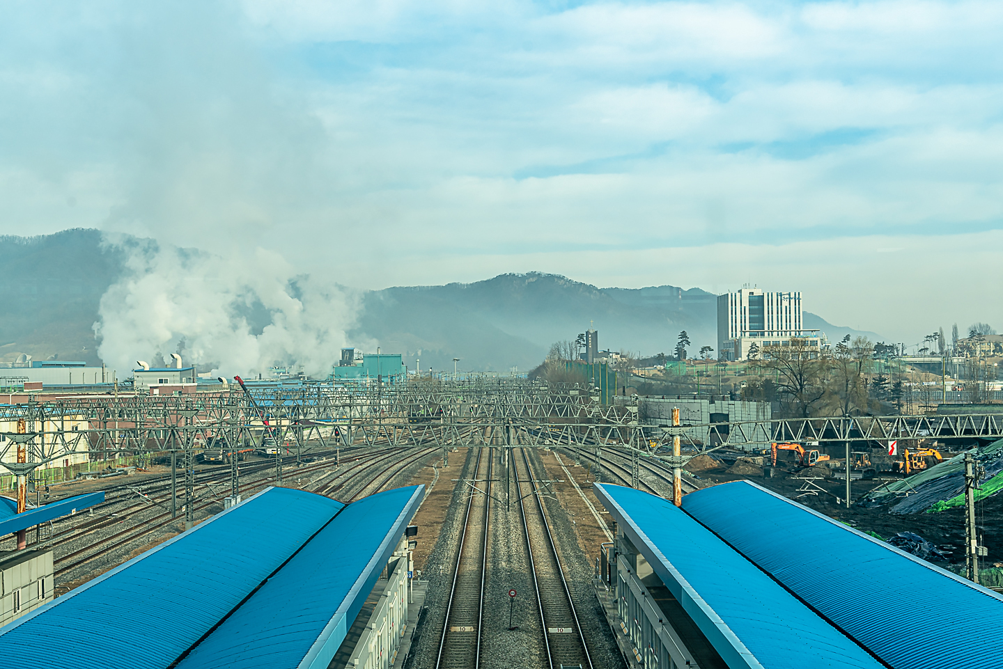 시가지 일 때가 안개와 수증기로 덮여있다.