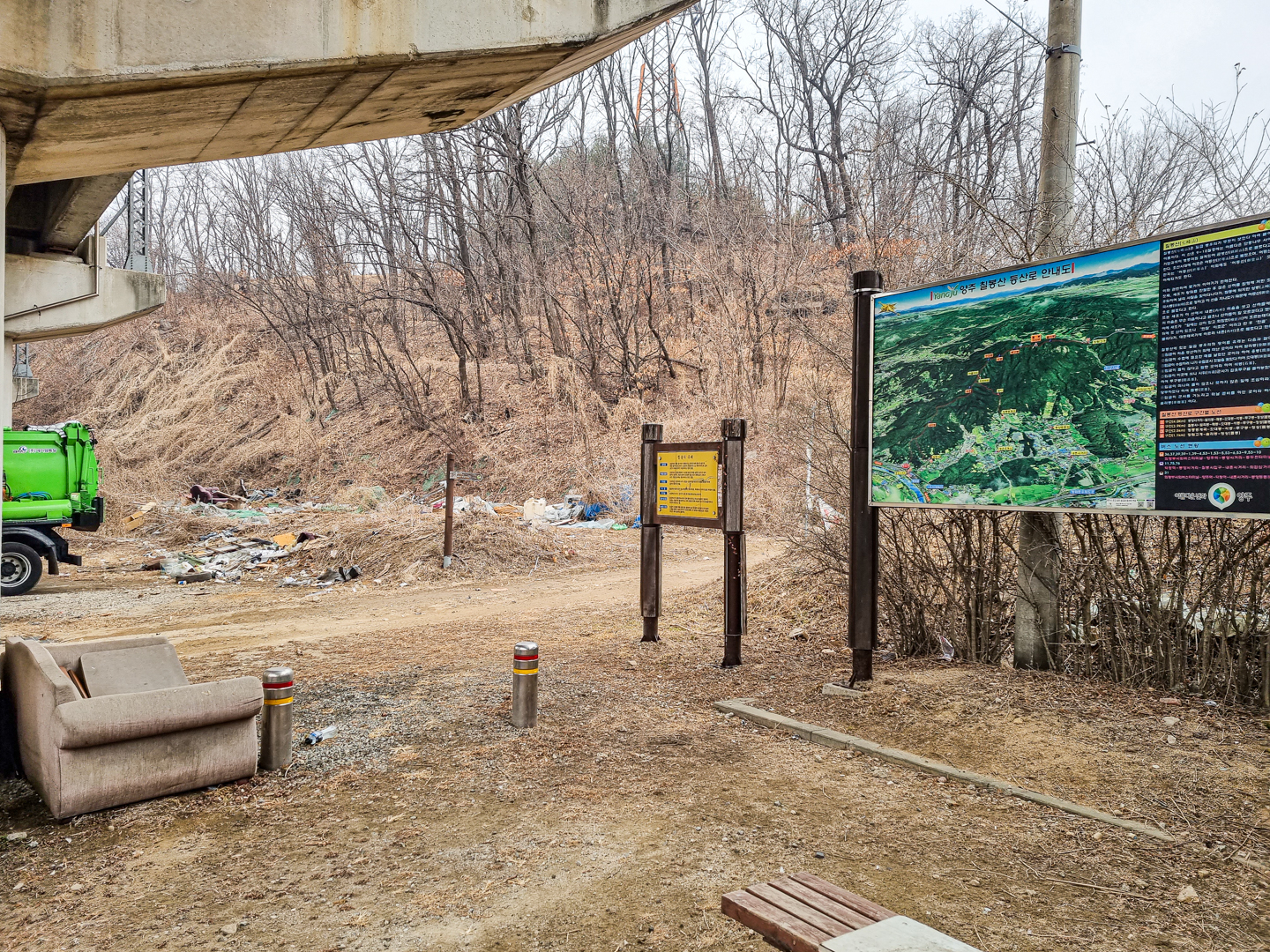 전철 교각밑에 있는 등산 안내도와 이정표.