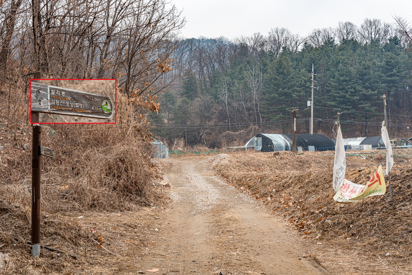 마을 표지석에서 좌측으로 전철 길을 20m 정도 따라가면 등산 안내도와 함께 이정표가 있다.