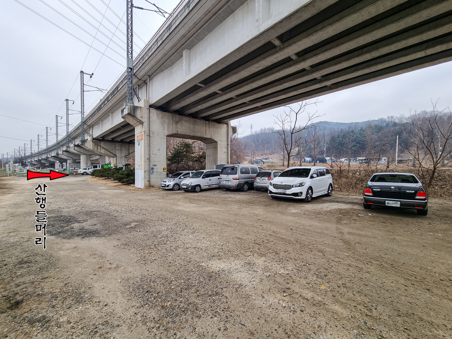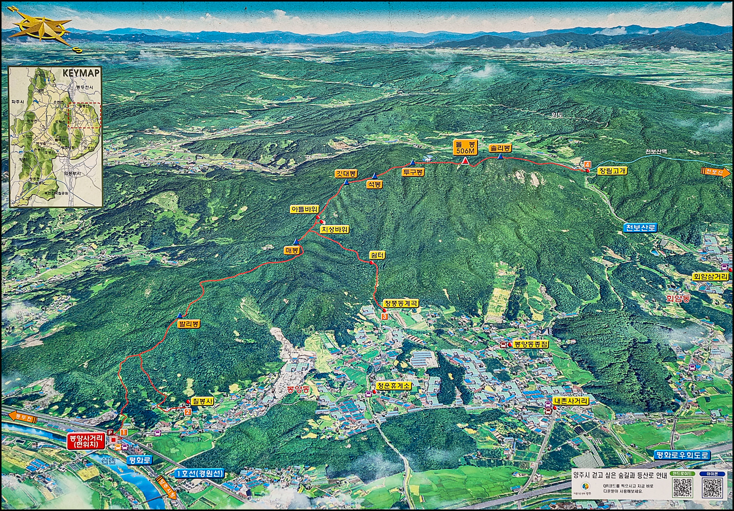 버스에서 내려 좌측 횡단보도를 건너면 전철 아래로 마을 표지석과 등산 안내도가 있다.