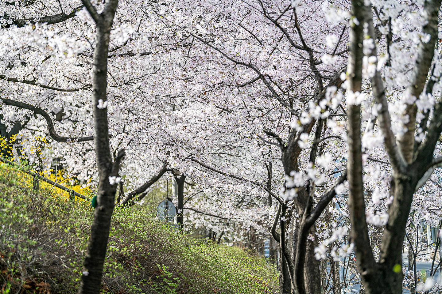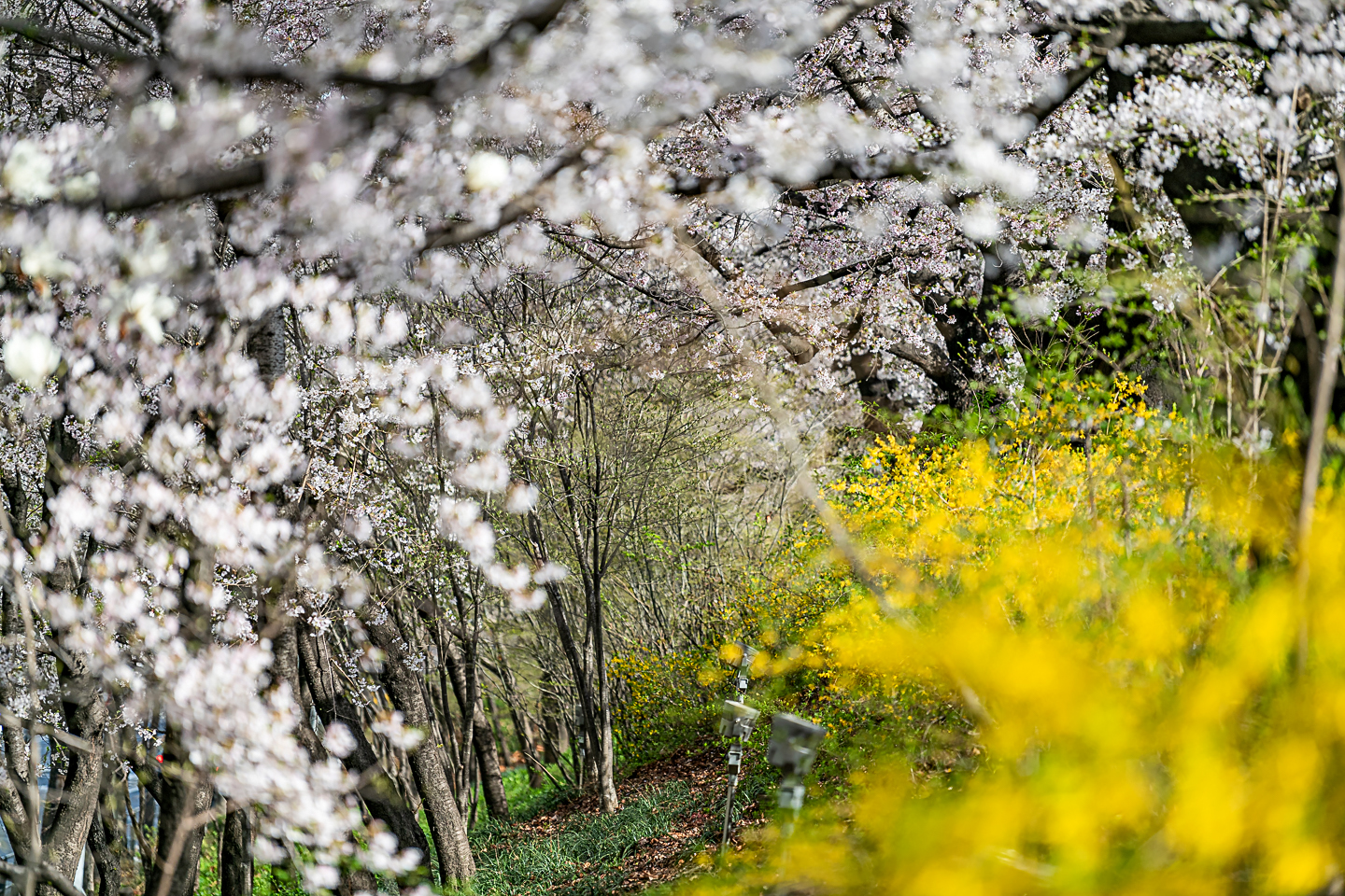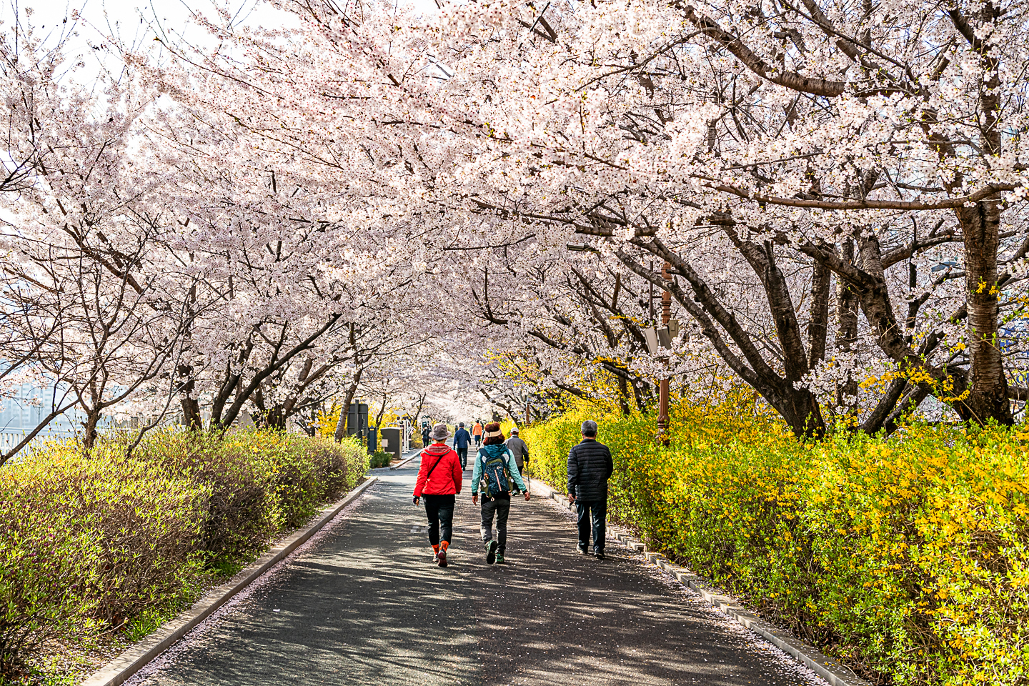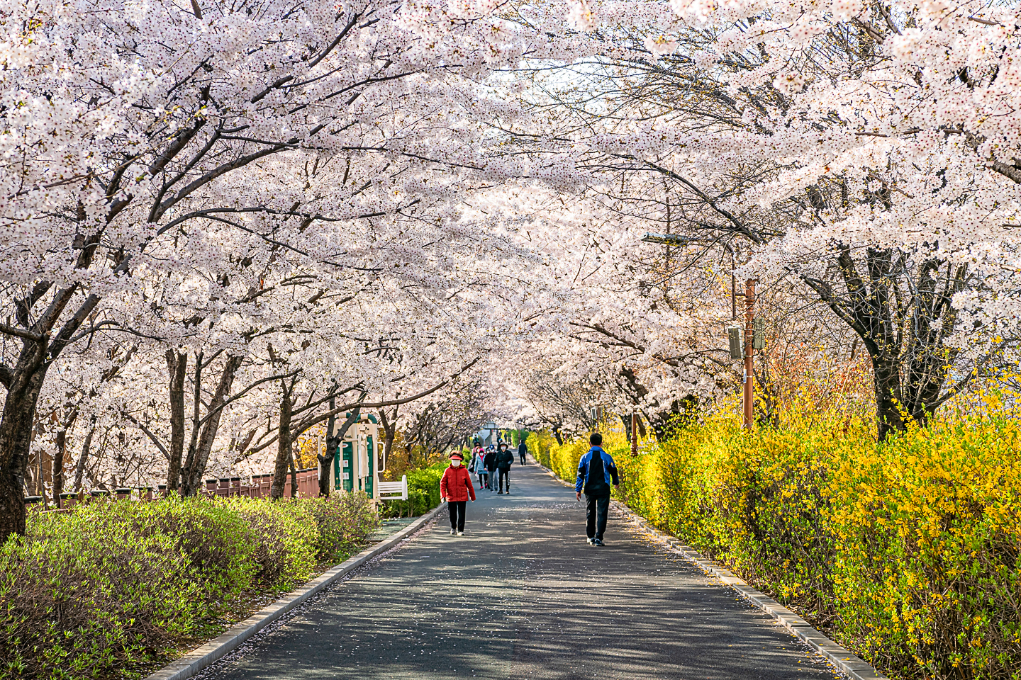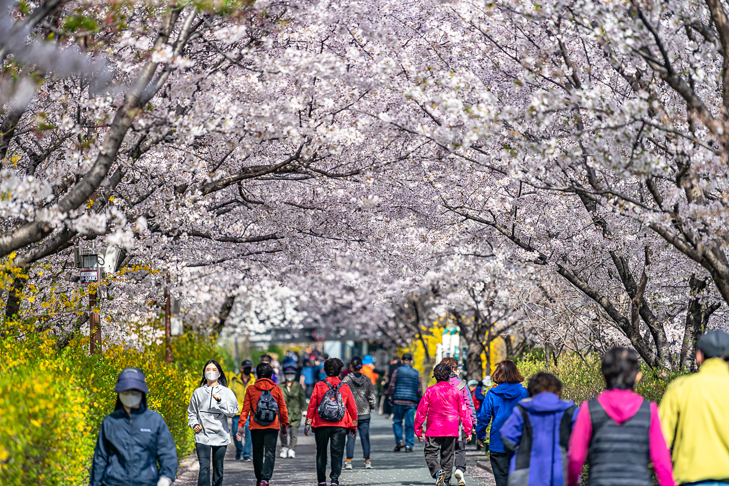장안동 중랑천 벚꽃길에 벚꽃 터널과 함께 개나리, 목련, 철쭉, 산수유 등
