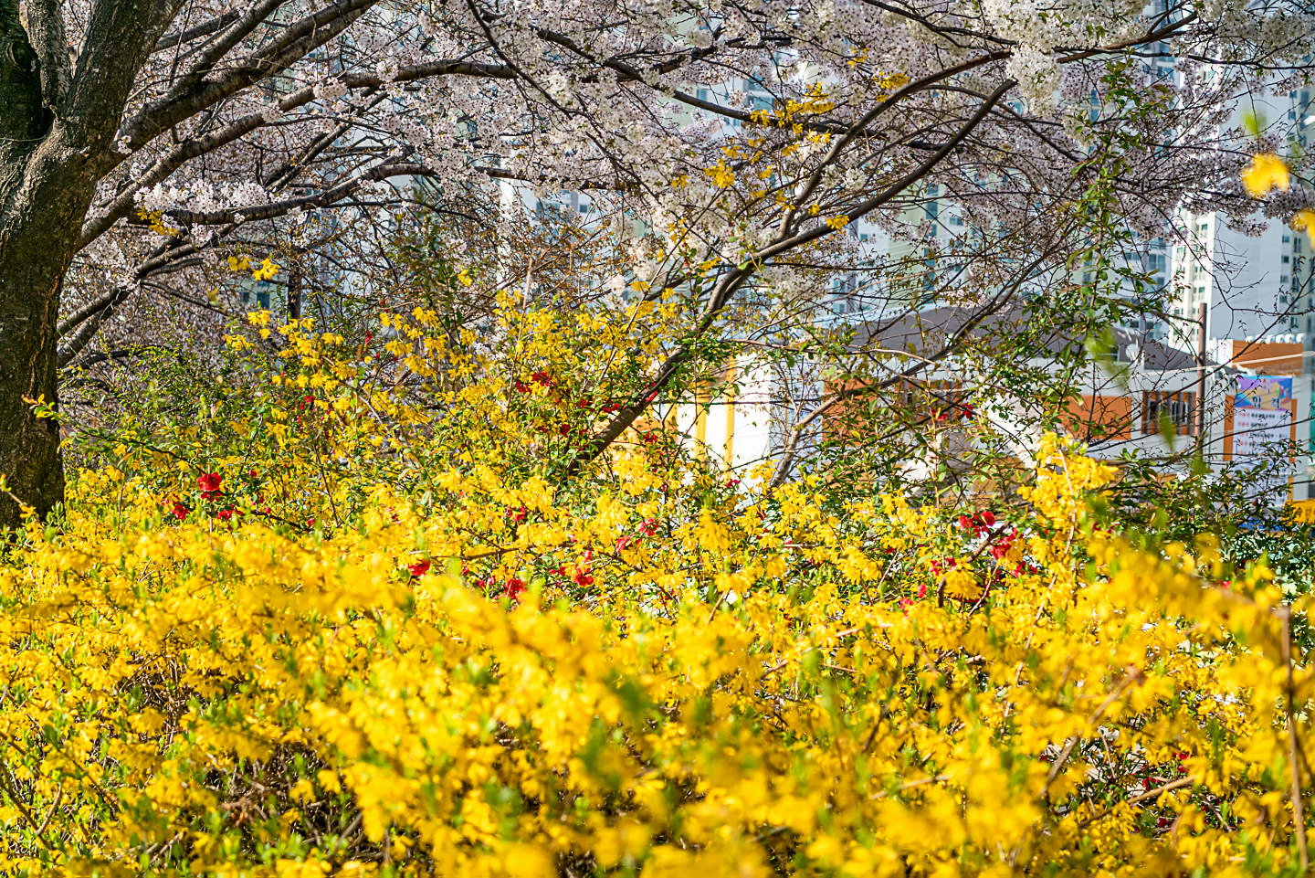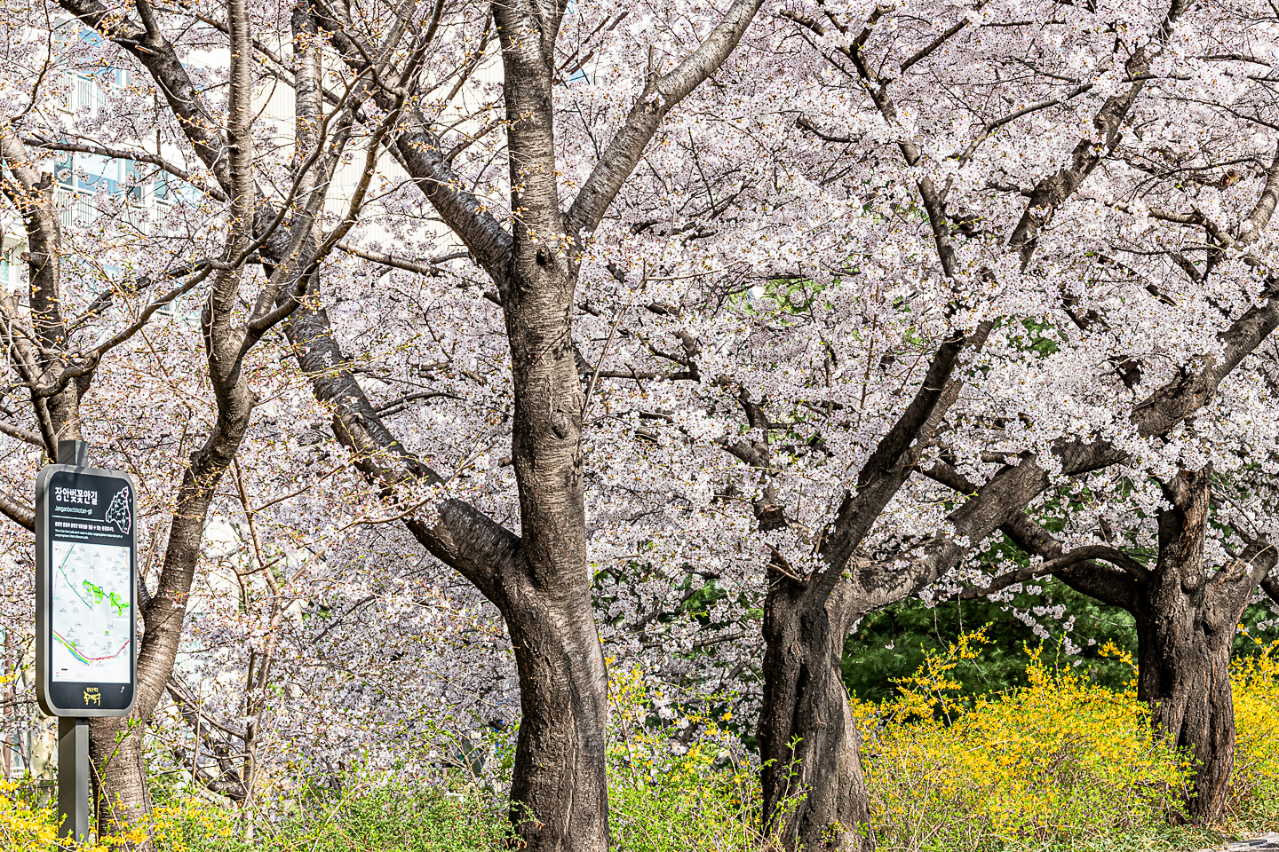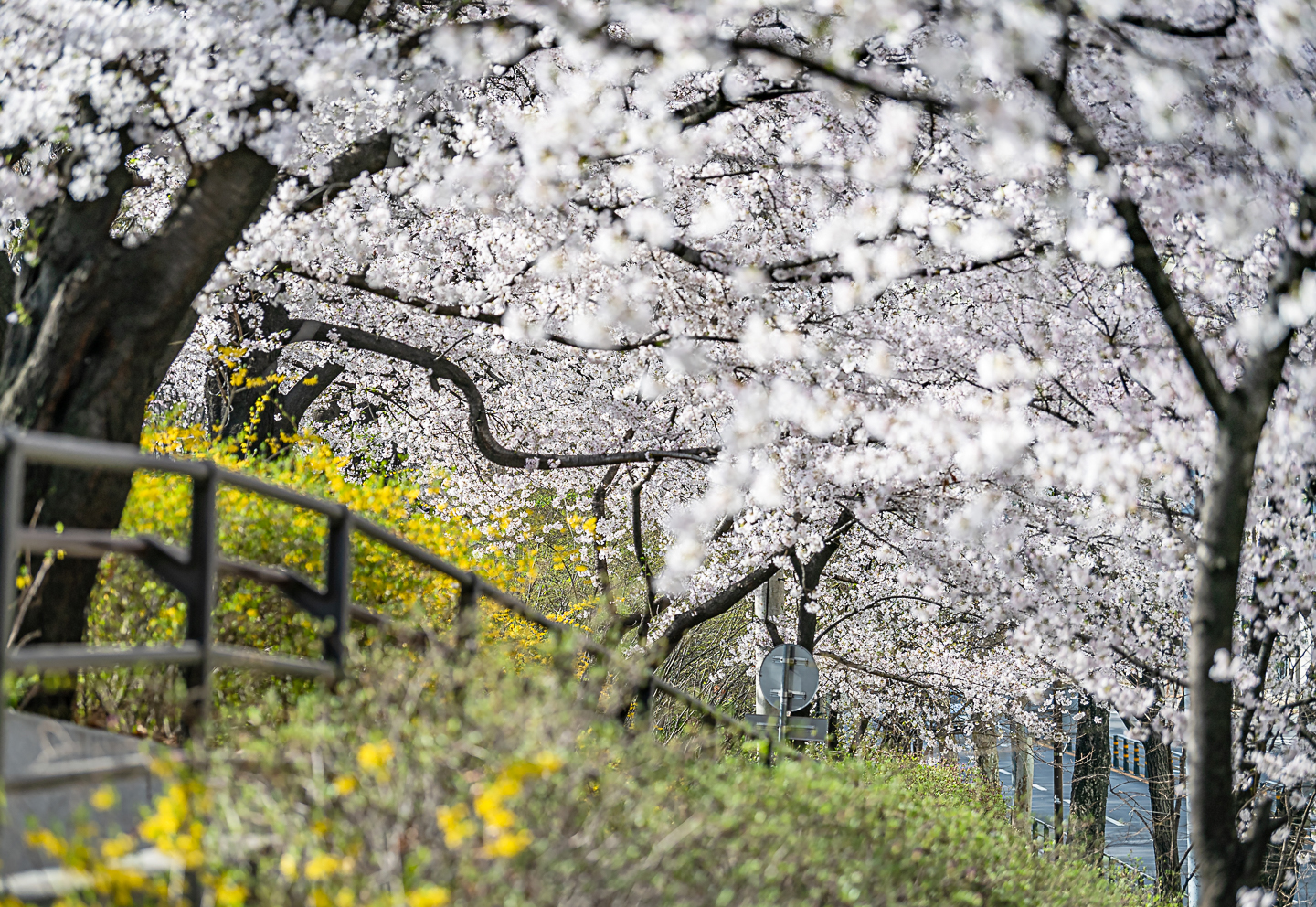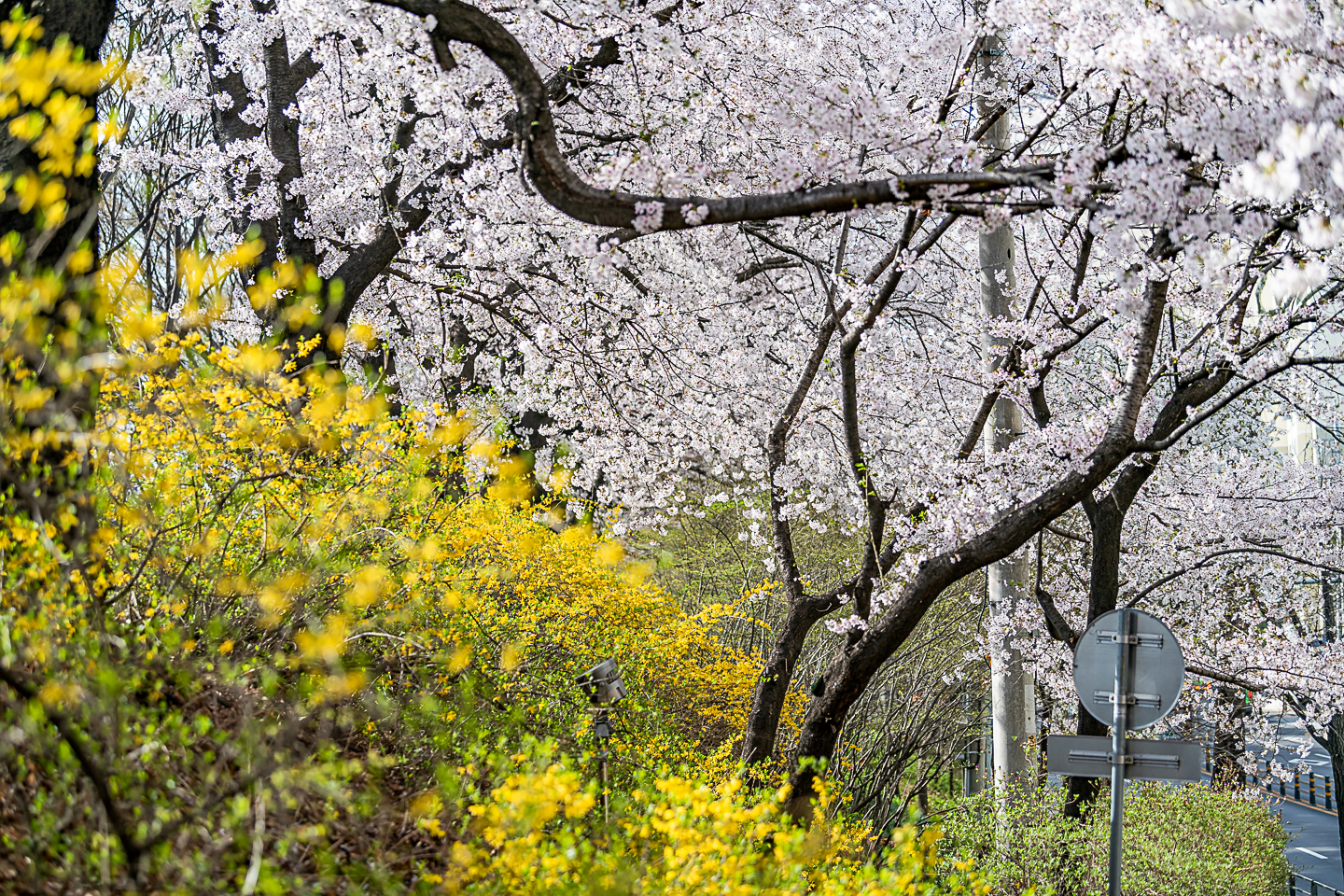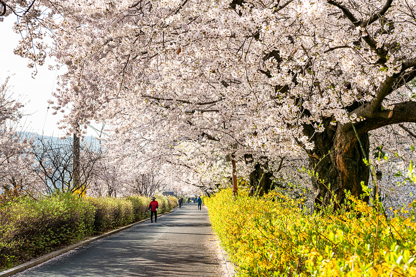 장안동 중랑천 벚꽃길에 벚꽃 터널과 함께 개나리, 목련, 철쭉, 산수유 등