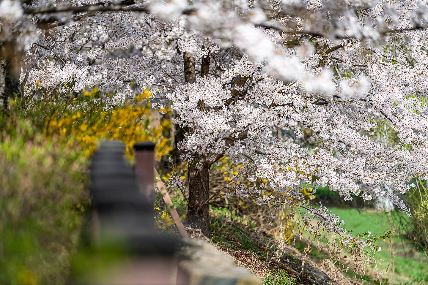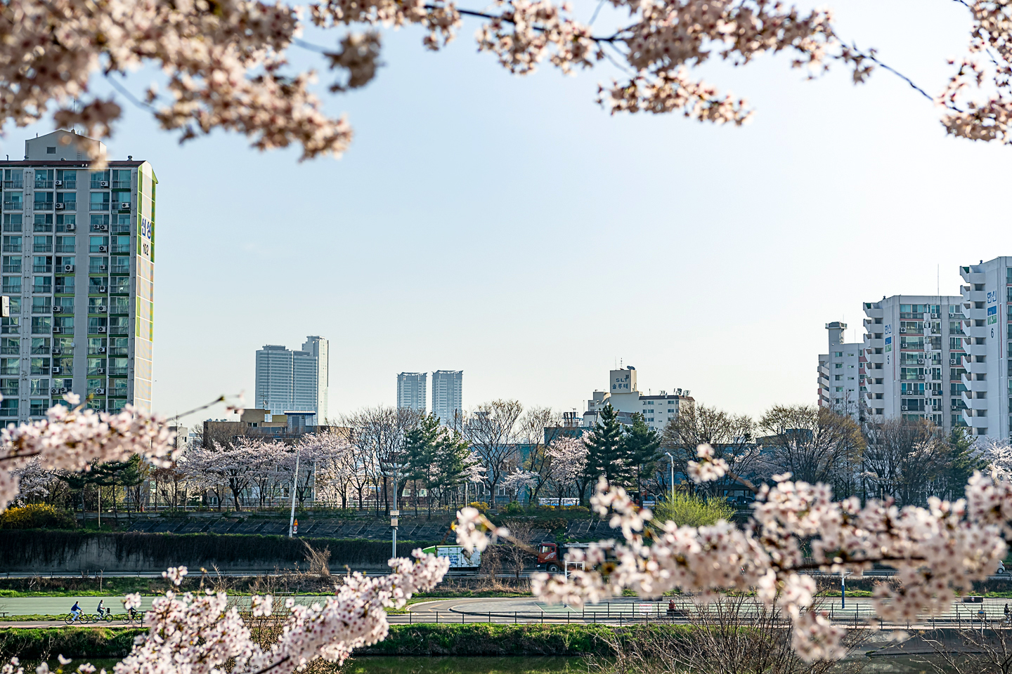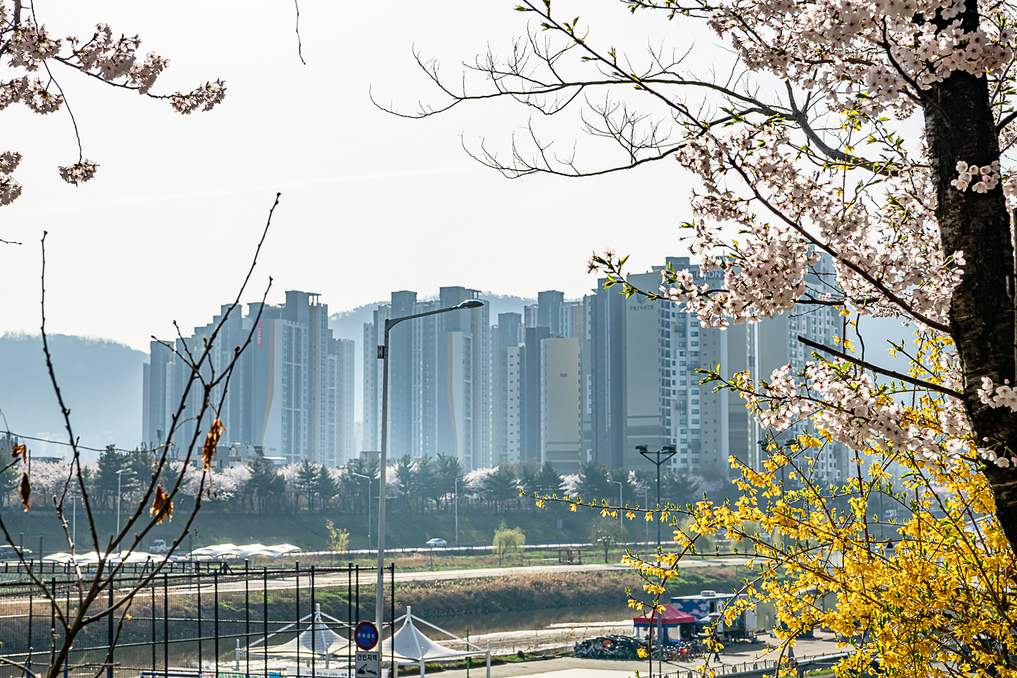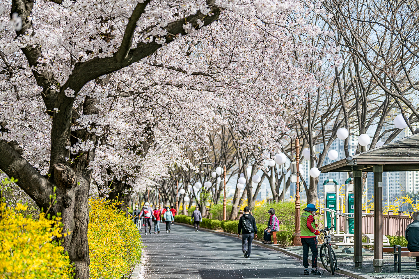 장안동 중랑천 벚꽃길에 벚꽃 터널과 함께 개나리, 목련, 철쭉, 산수유 등