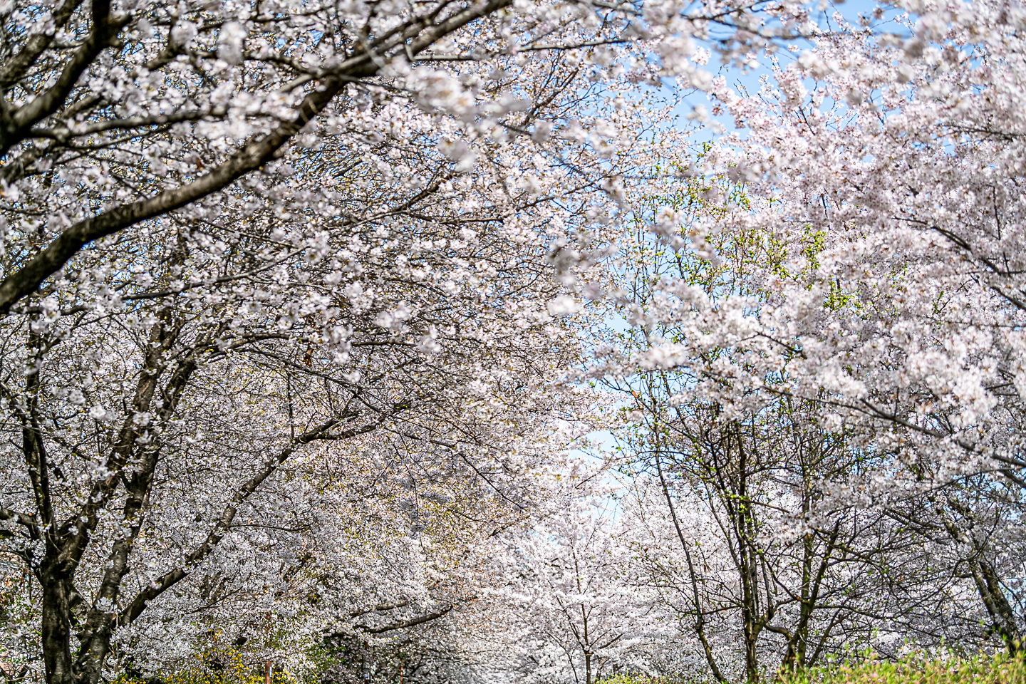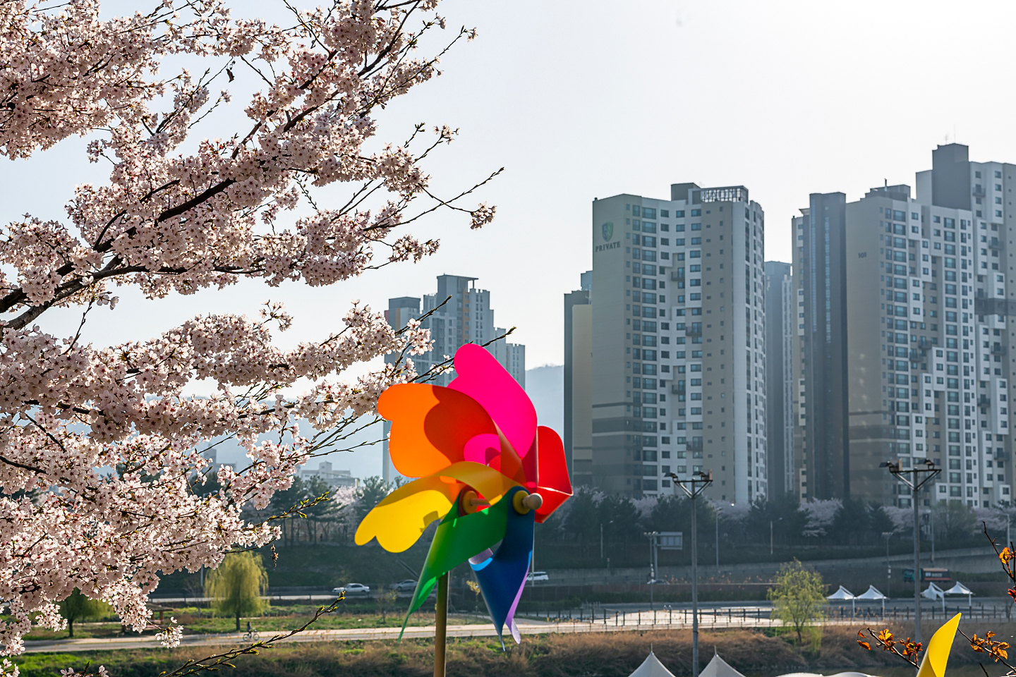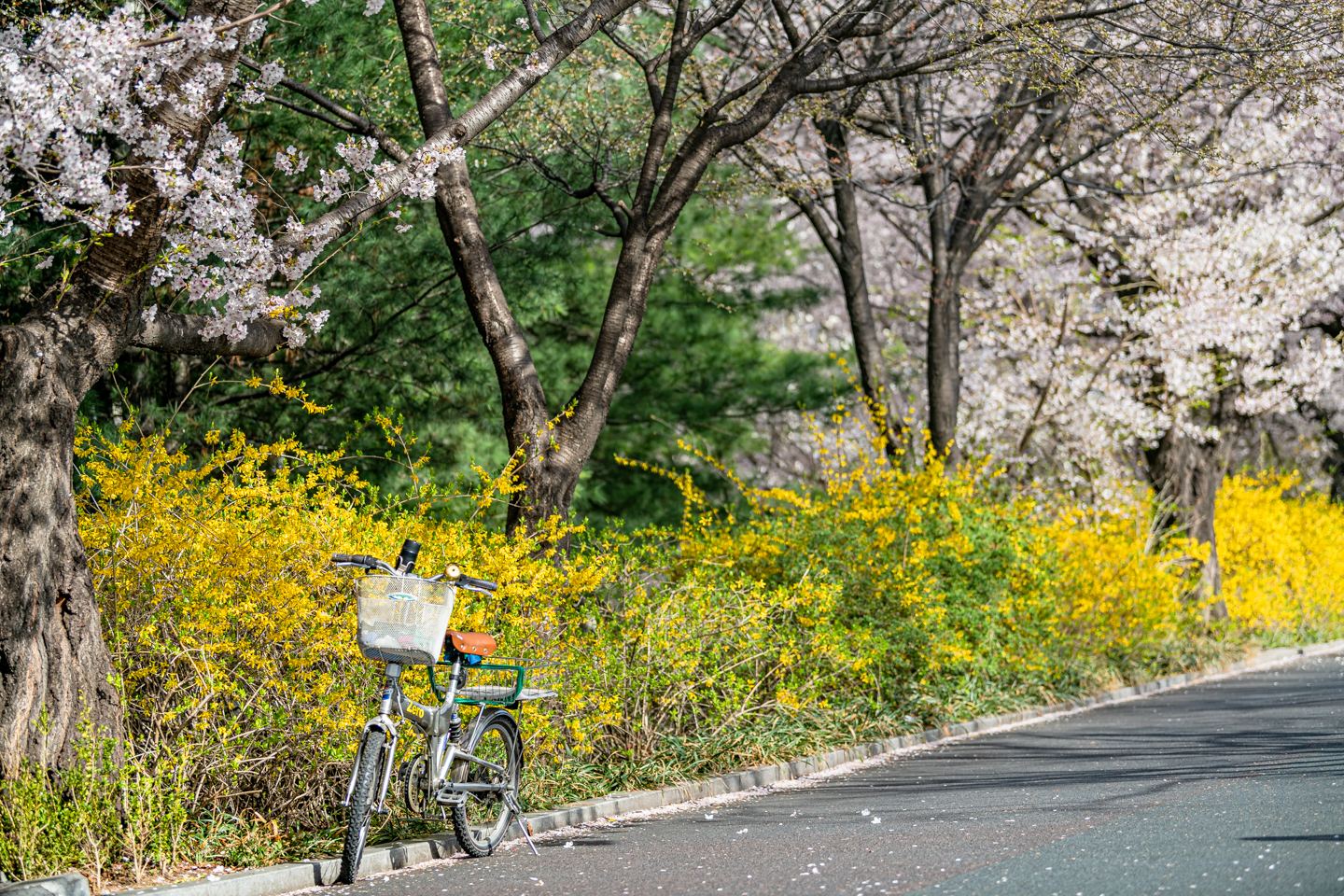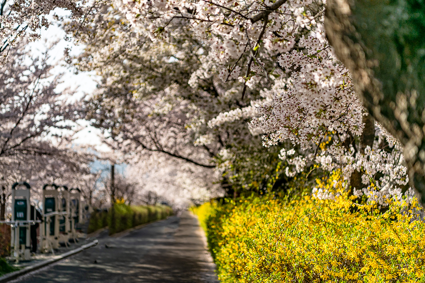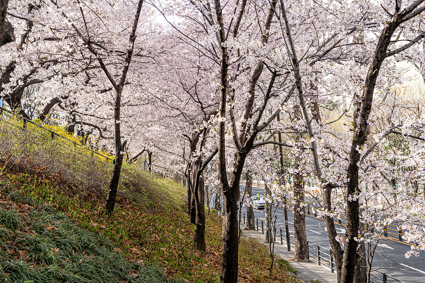 장안동 중랑천 벚꽃길에 벚꽃 터널과 함께 개나리, 목련, 철쭉, 산수유 등