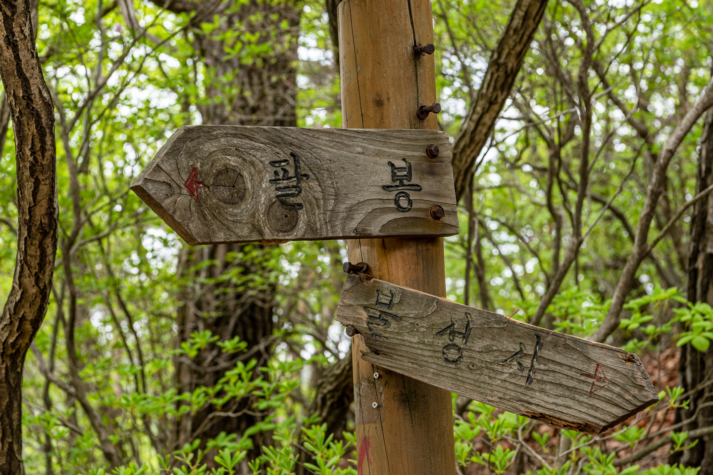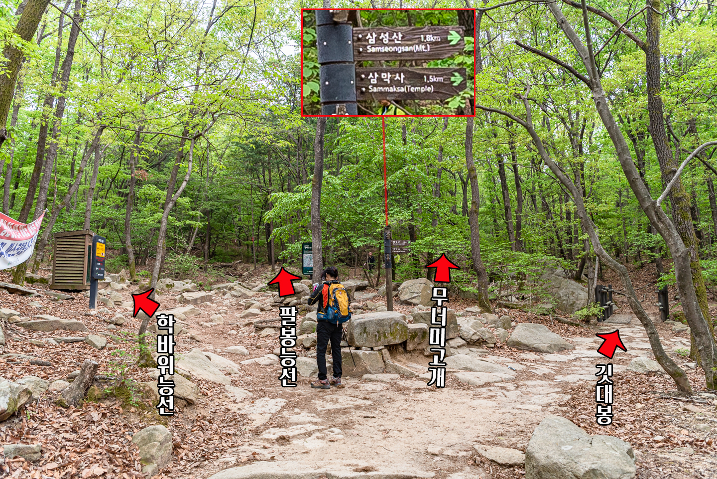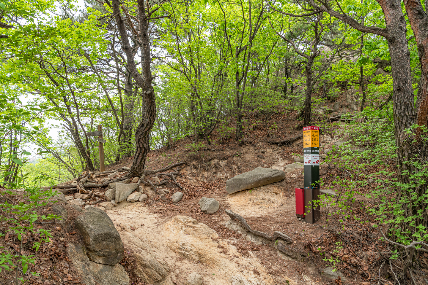 등산로를 따라 올라오다 보면 만나는 학봉 능선 삼거리 이정표.