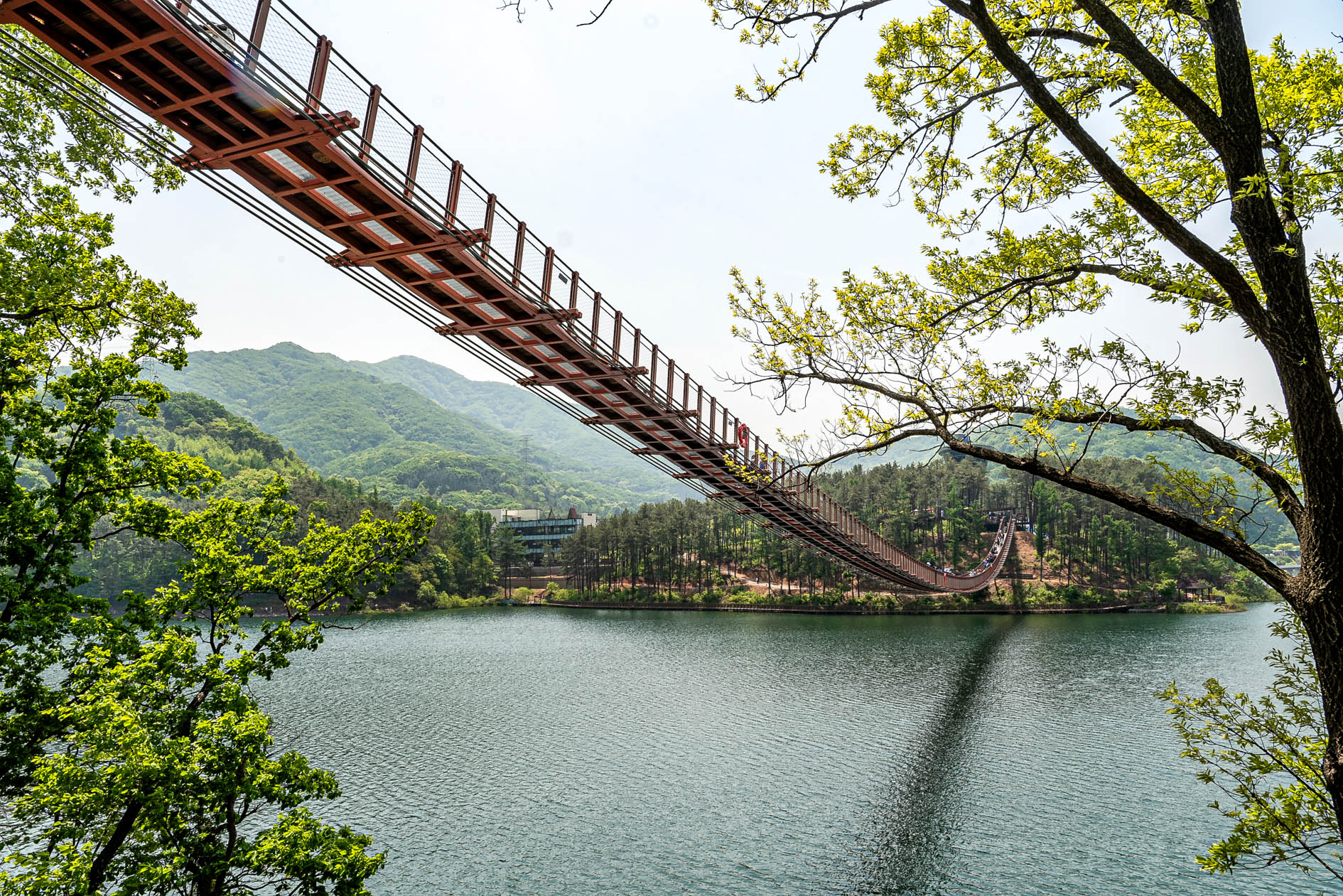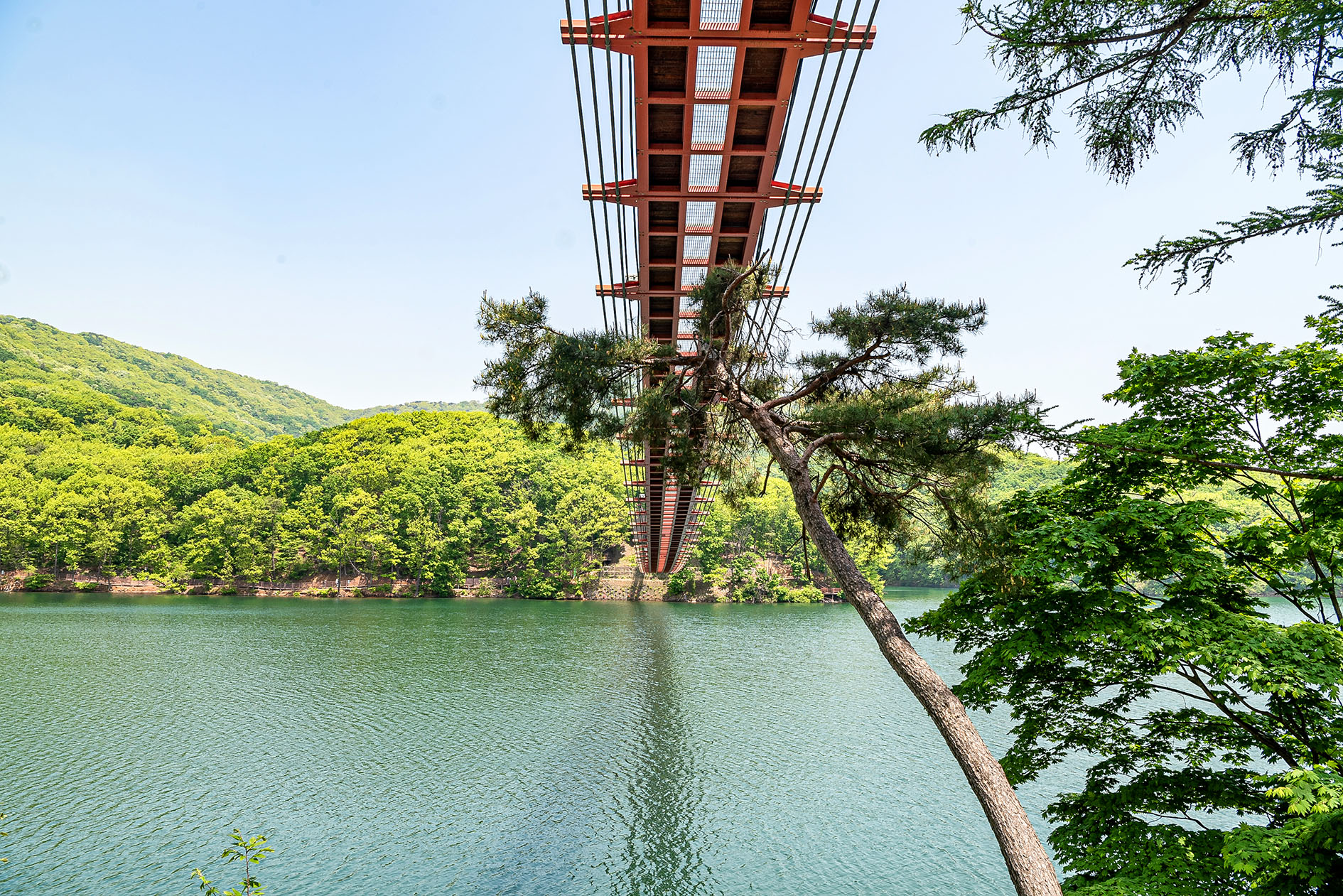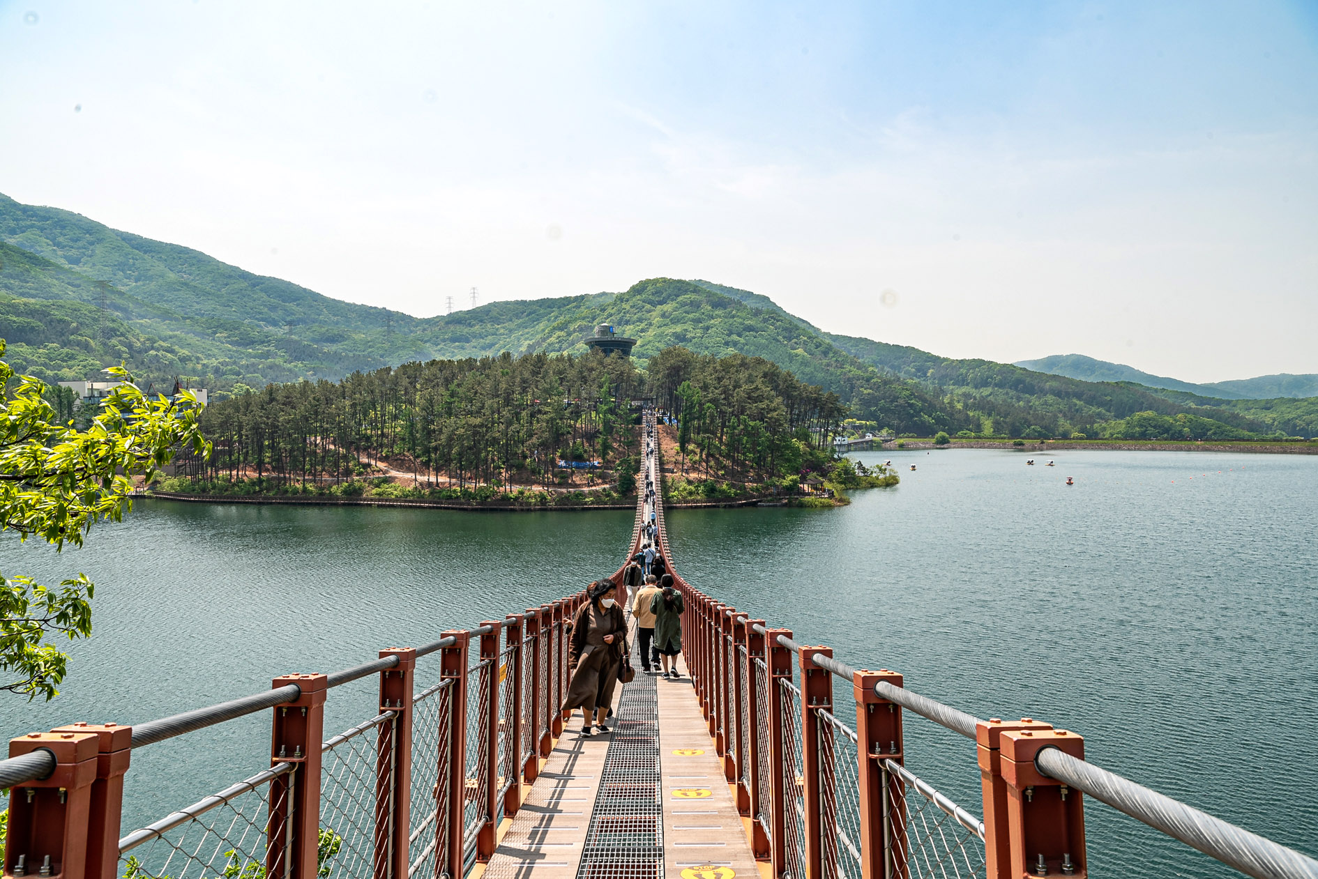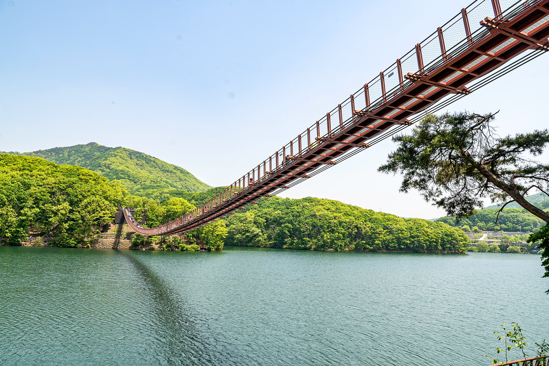 길이 220m, 폭 1.5m로 국내 최장 보도용 현수교인 마장호수 출렁다리.