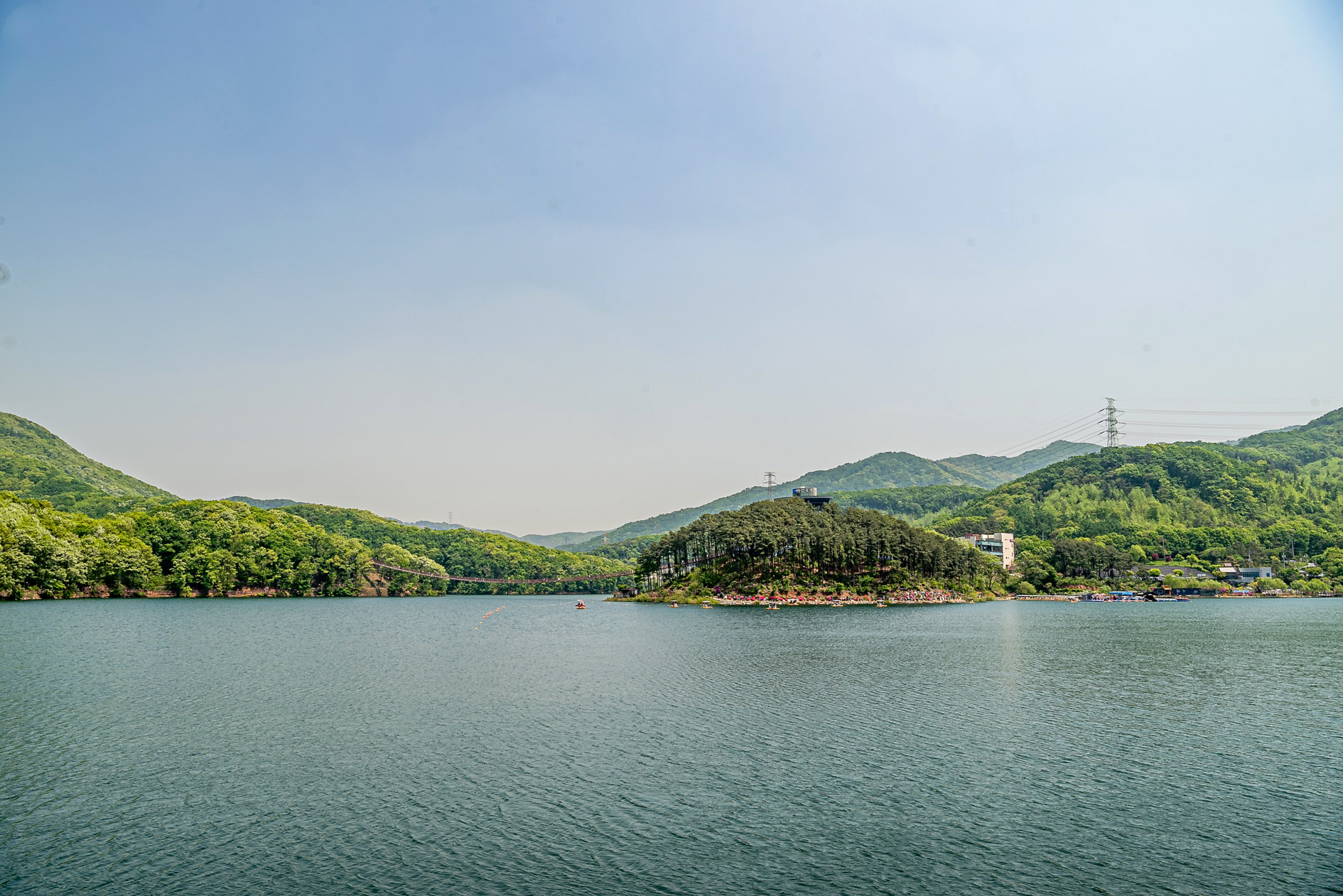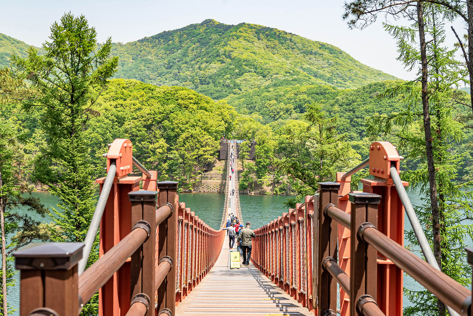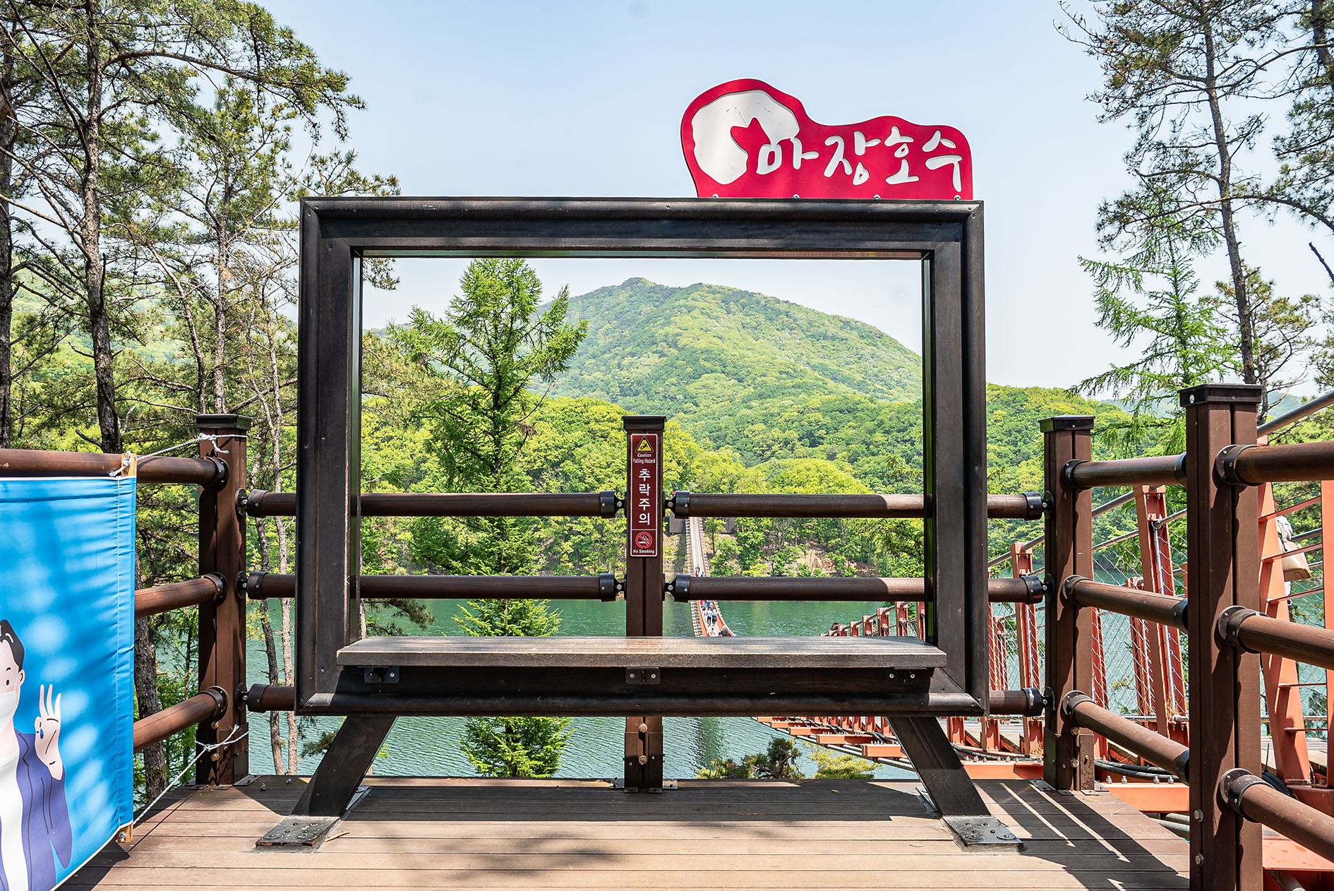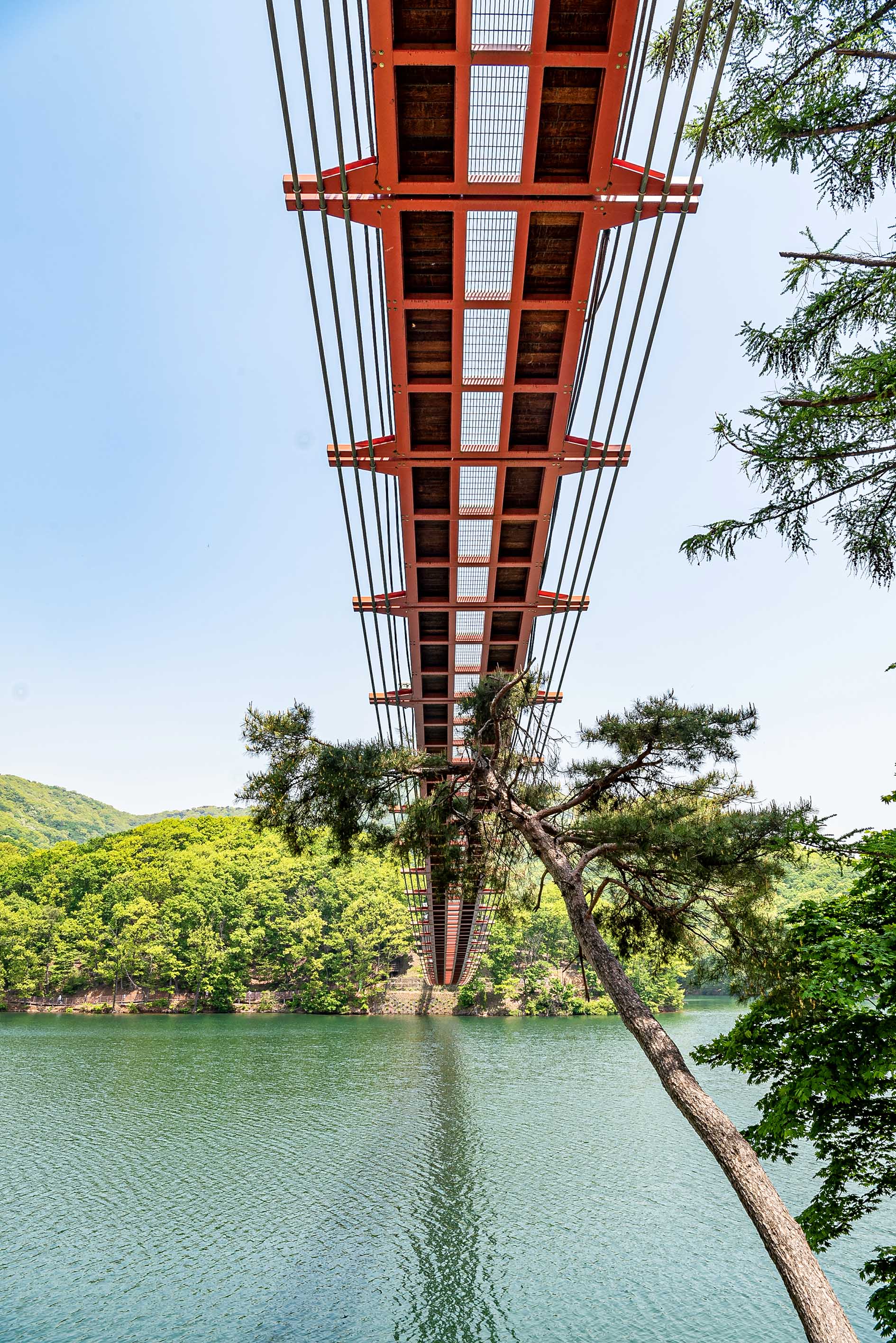 길이 220m, 폭 1.5m로 국내 최장 보도용 현수교인 마장호수 출렁다리.