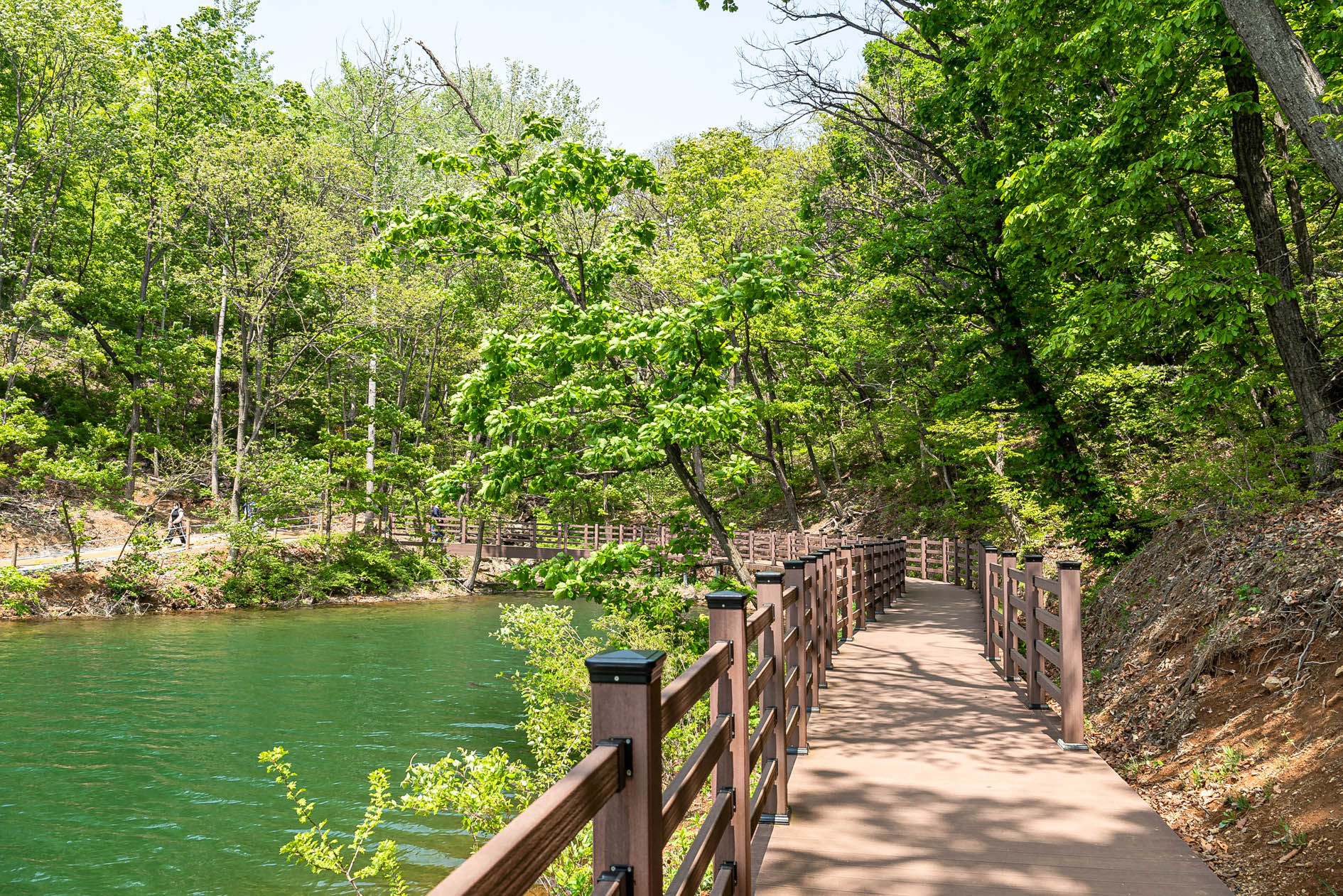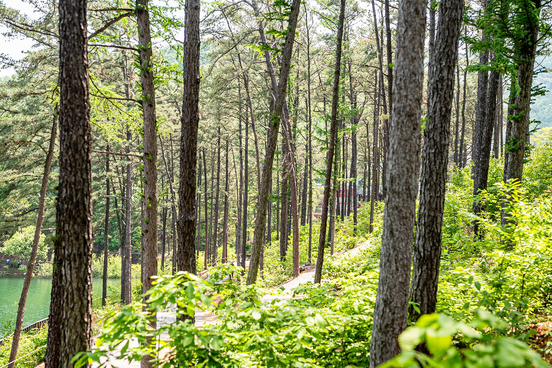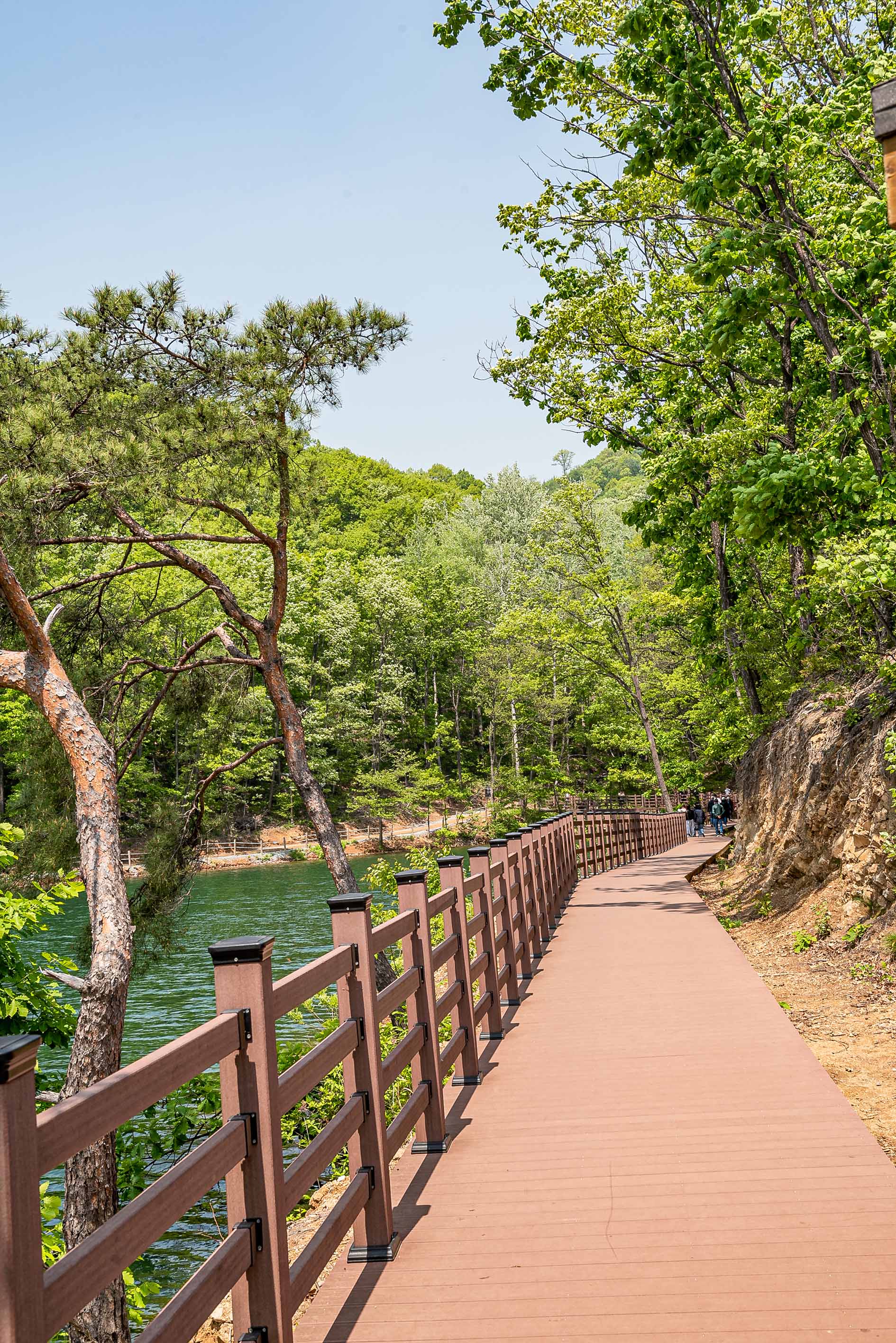 조망 덱 2곳, 3.3km 구간의 트래킹코스, 캠핑장, 물놀이 체험시설, 카페 등을