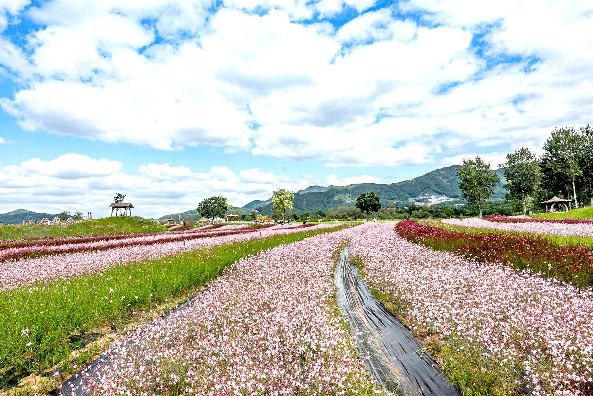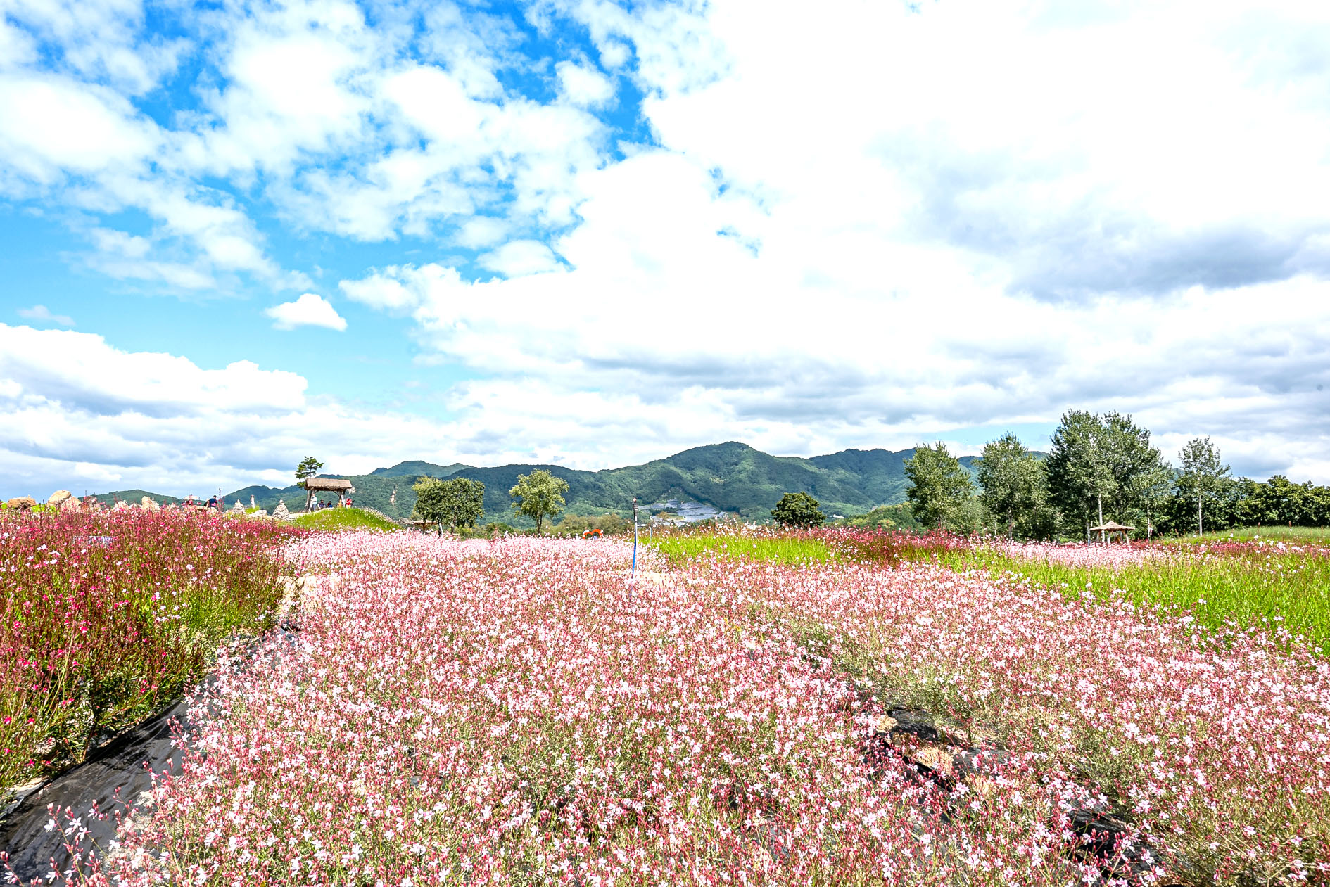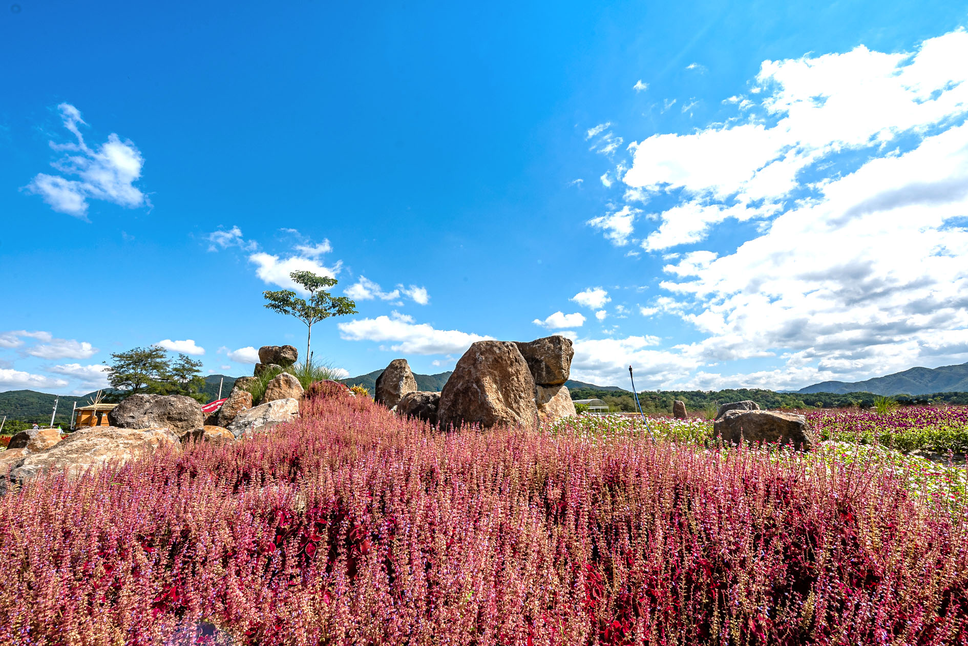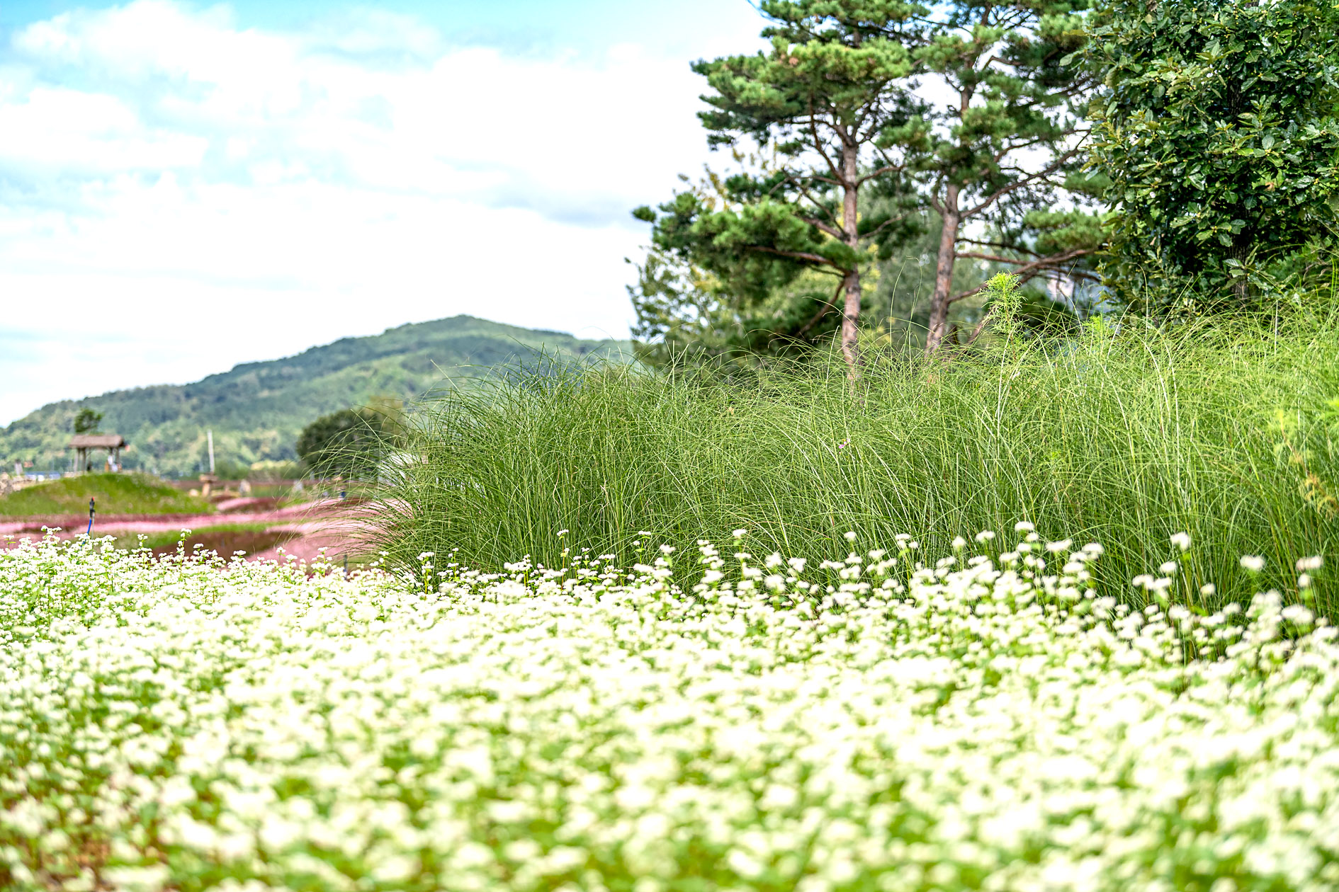 10월로 넘어가면 붉게 물든 댑싸리를 시작으로 드넓은 들판에 연분홍빛의 핑크 뮬리가