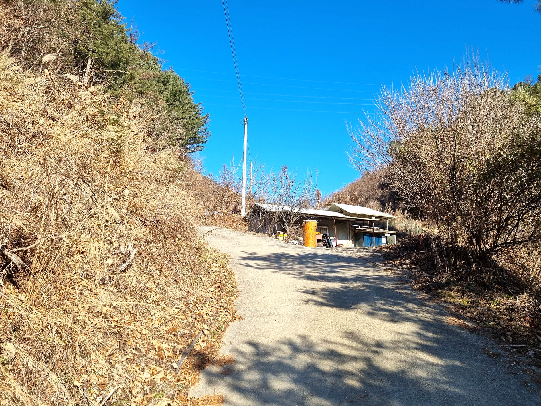 도로의 마지막에 비닐하우스 창고가 있으며 좌측으로 오르는 길이 있다.(이정표는 없음)