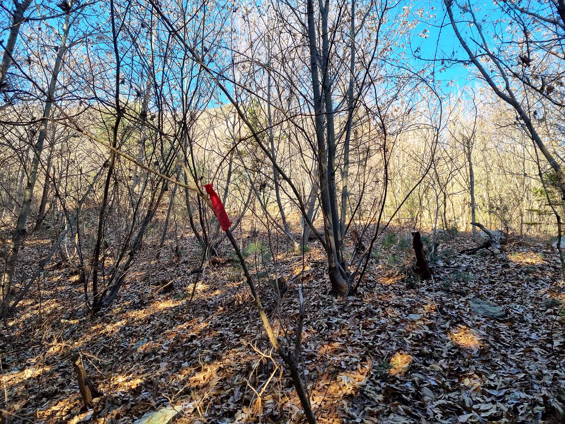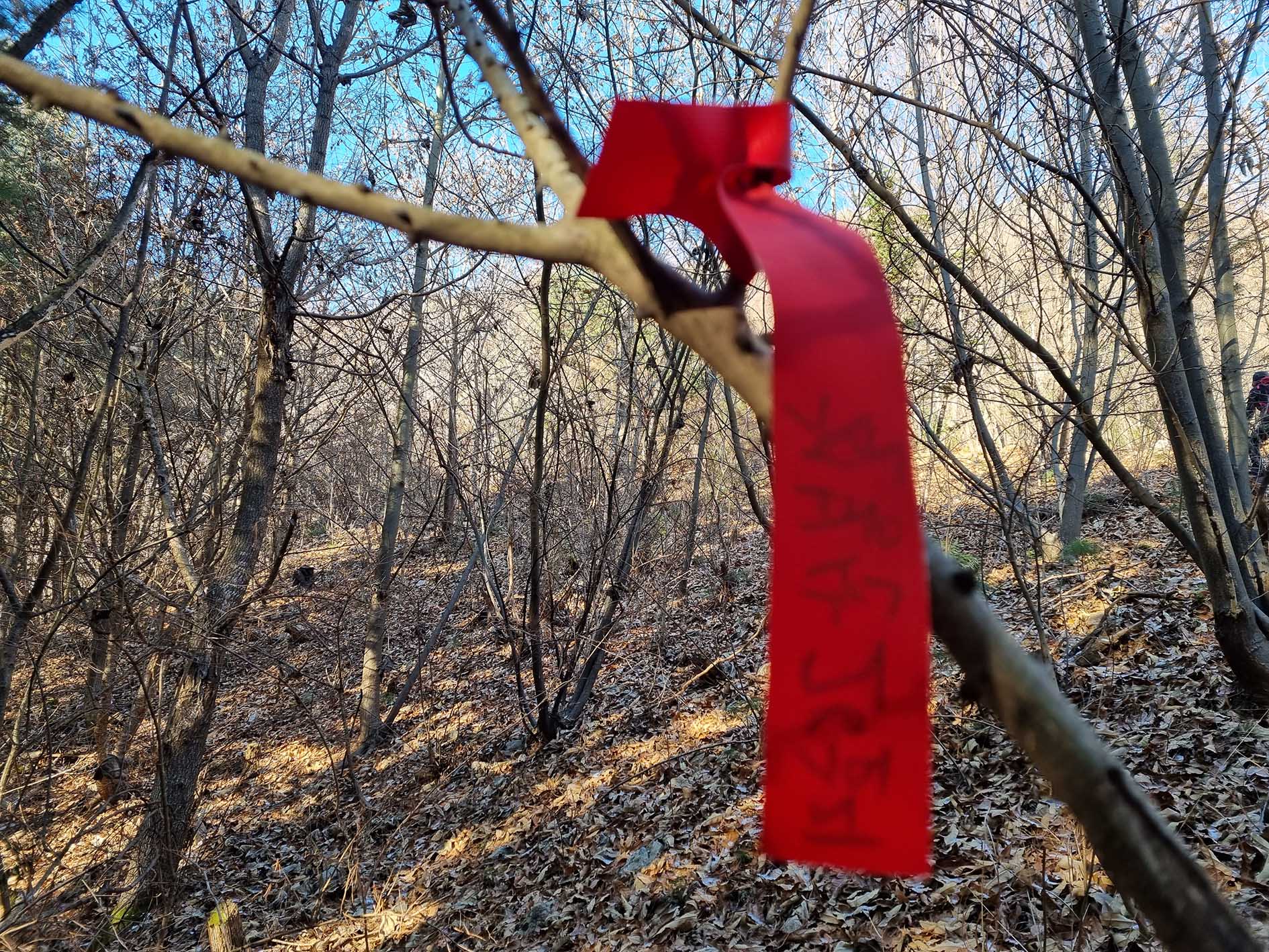 잣나무를 나와 잡목 사이로 들어서는 곳이다.(필자가 빨간 시그널을 달아 놓았음)