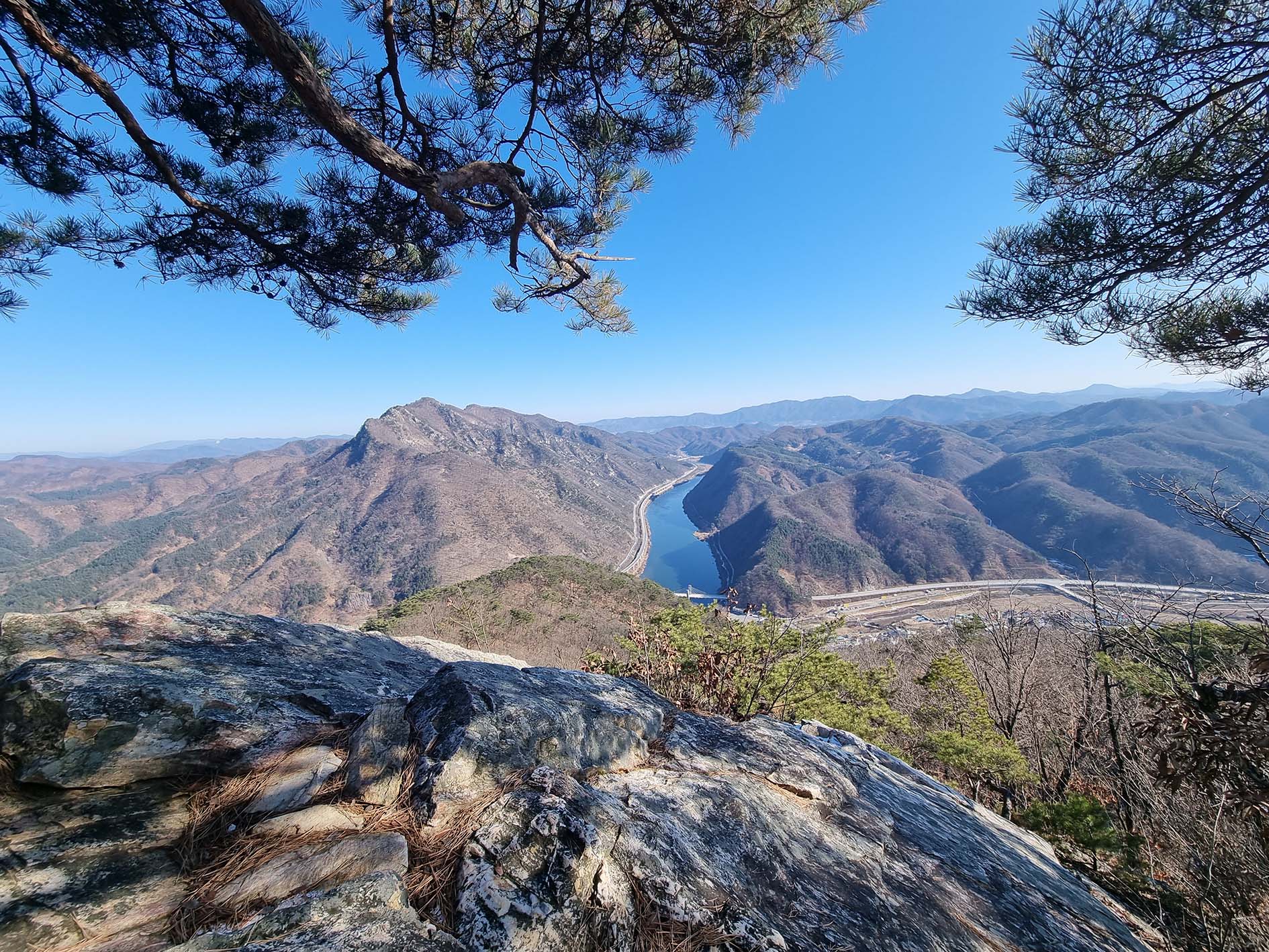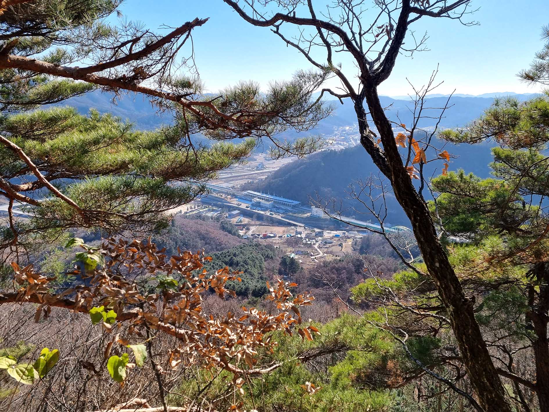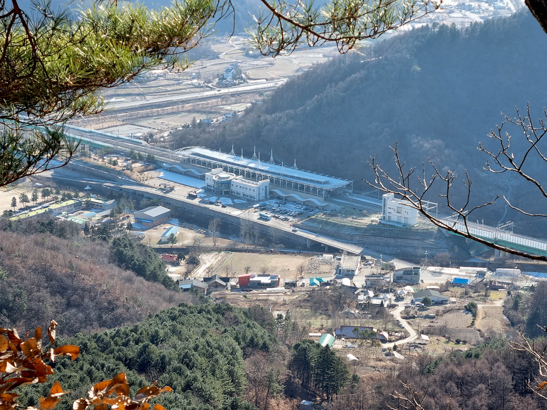 소나무 사이로 강촌역과 올라온 도로가 보인다.