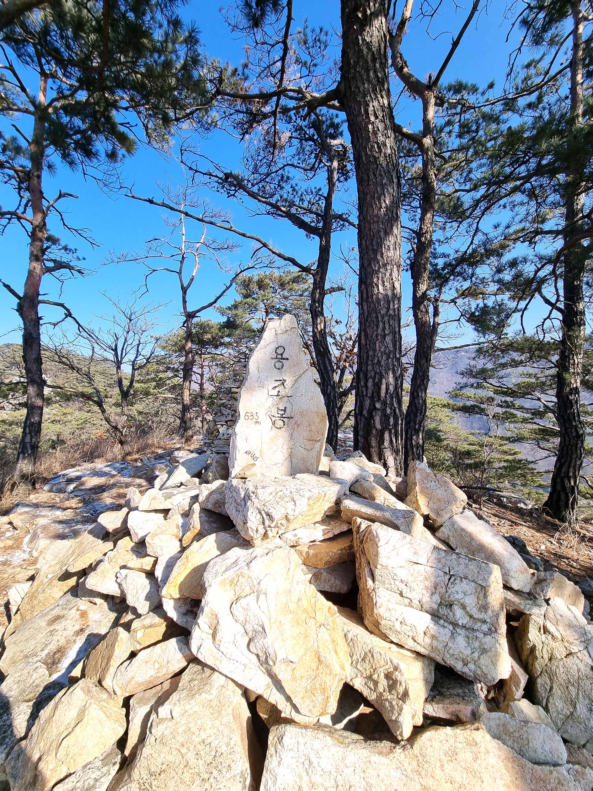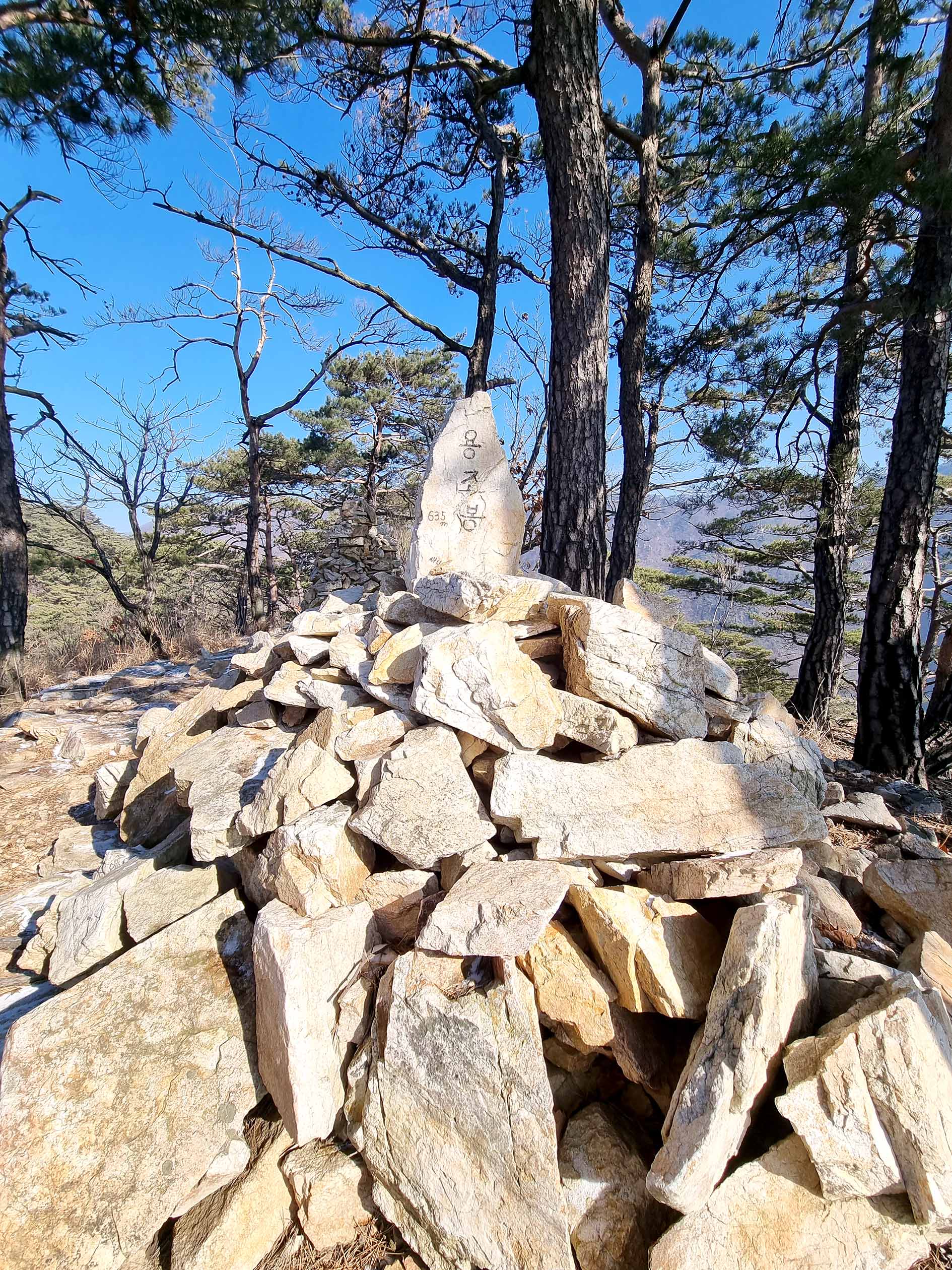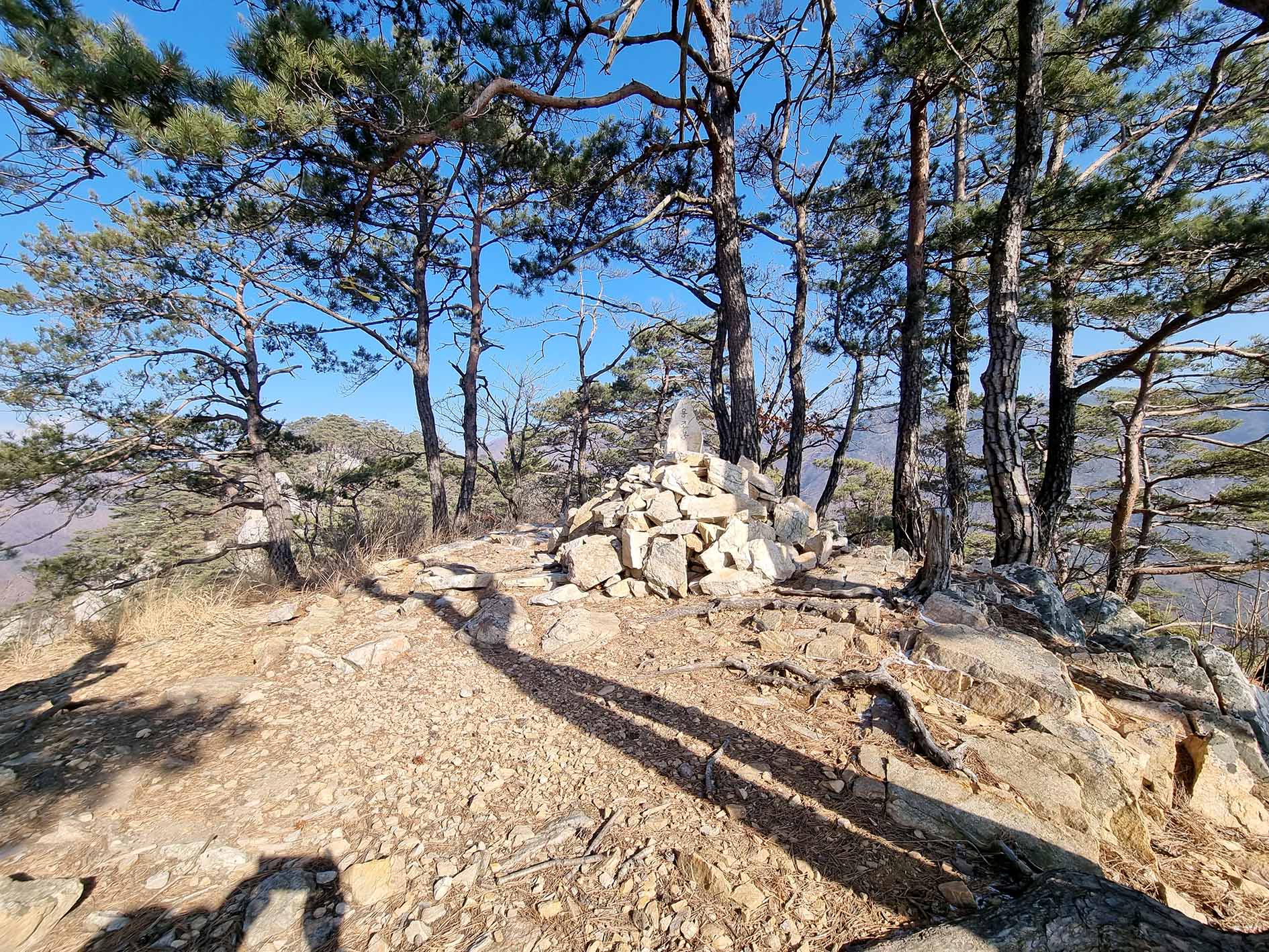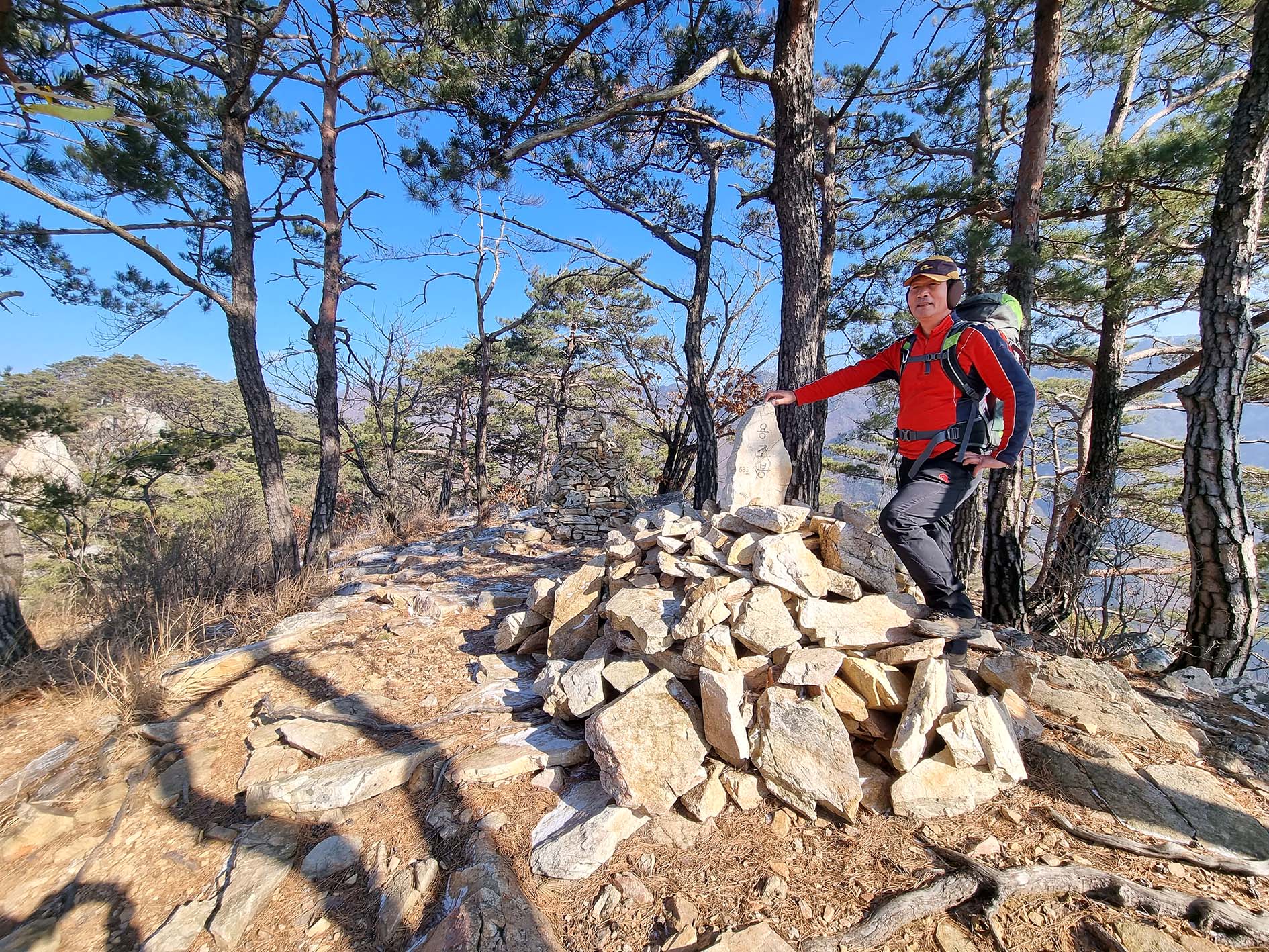 정상석 뒤로 돌탑이 있다.