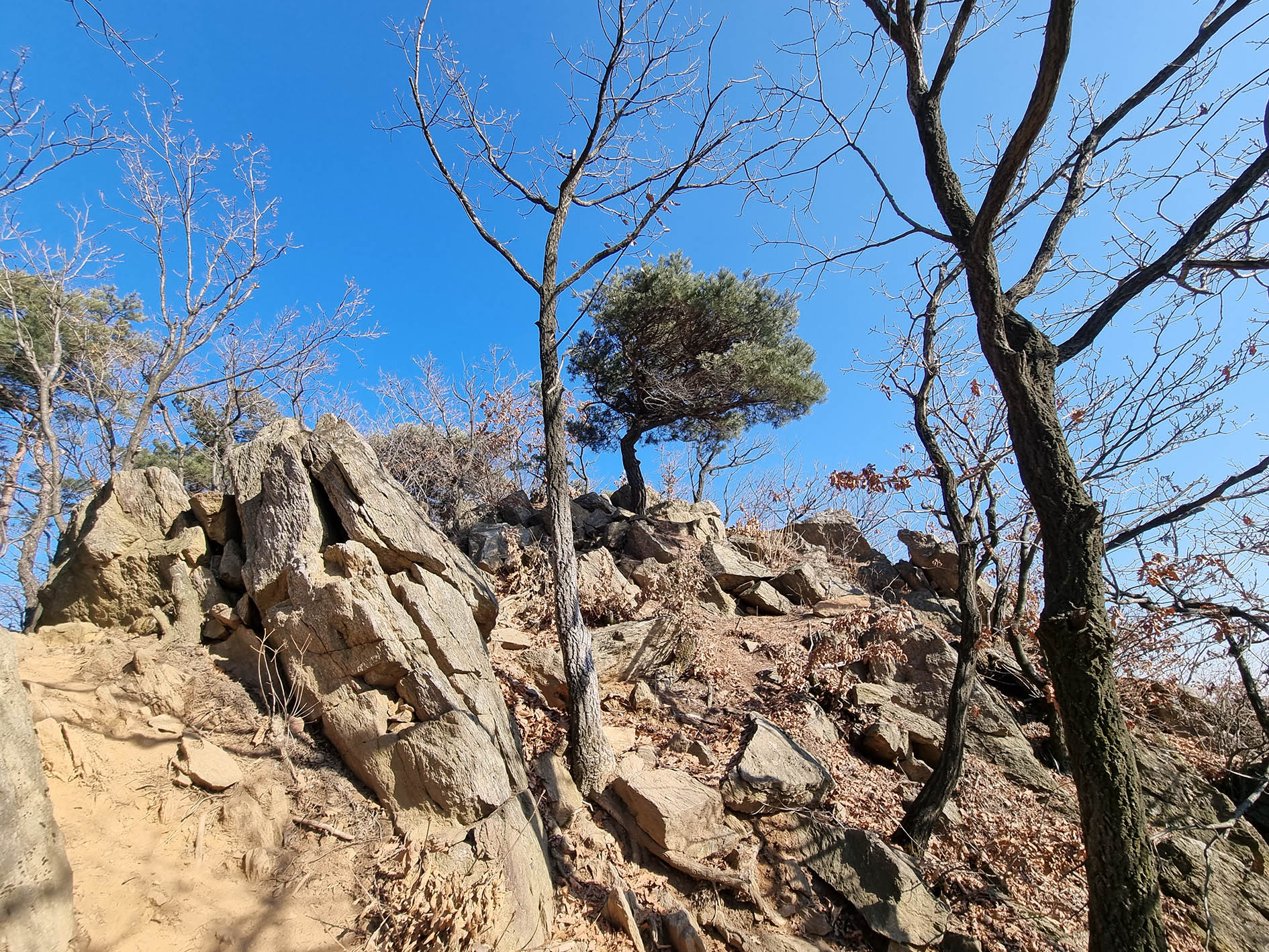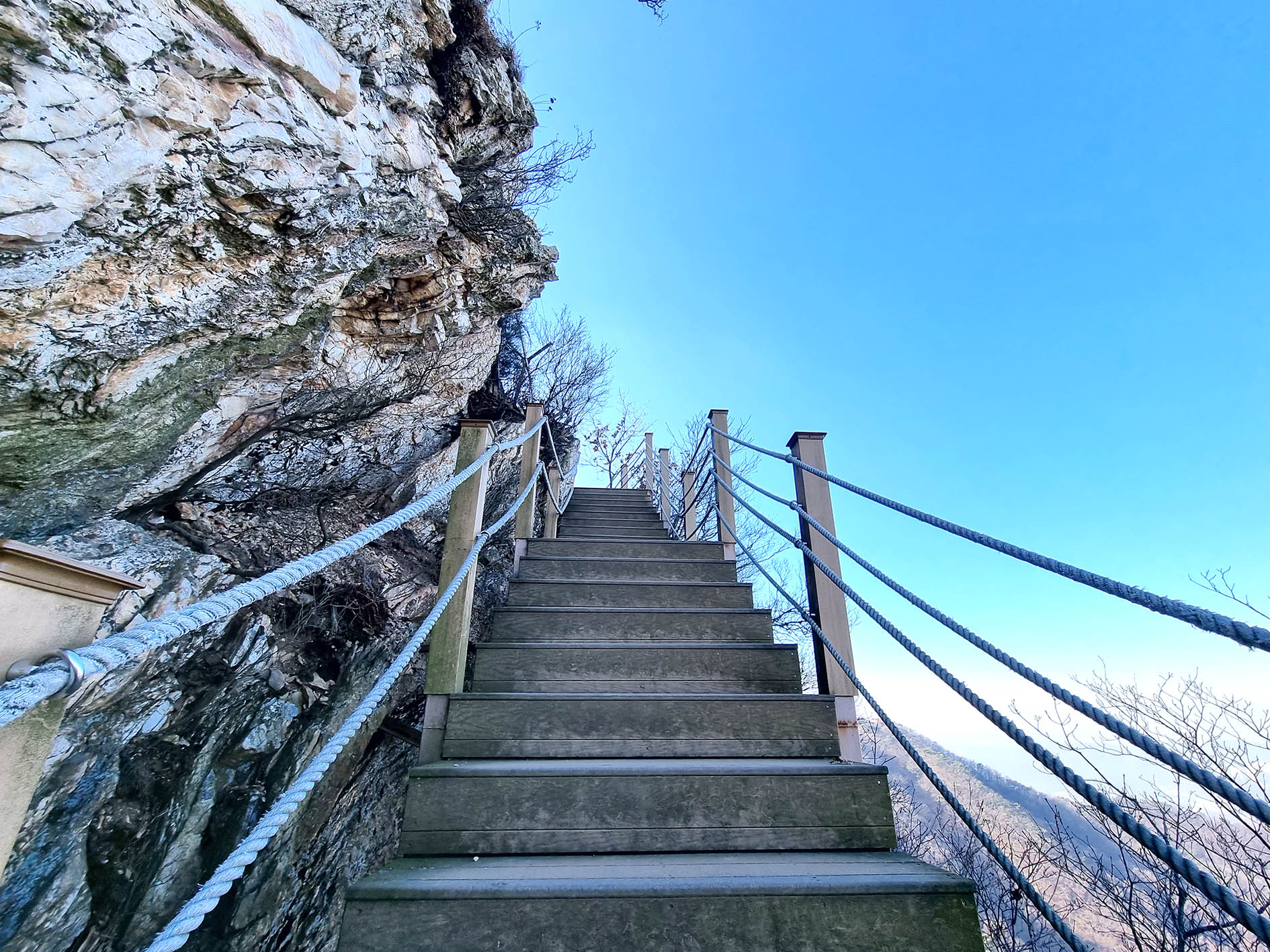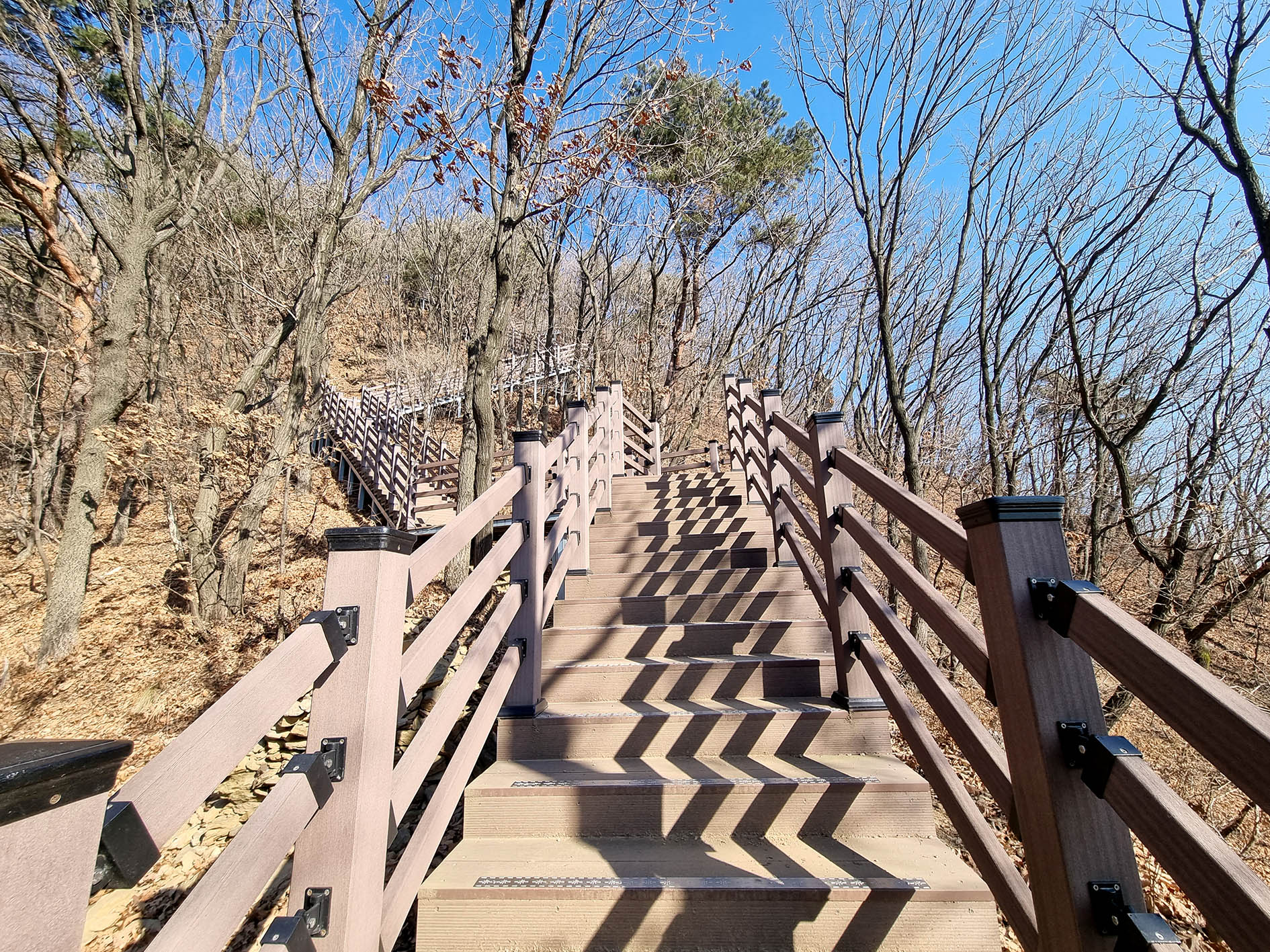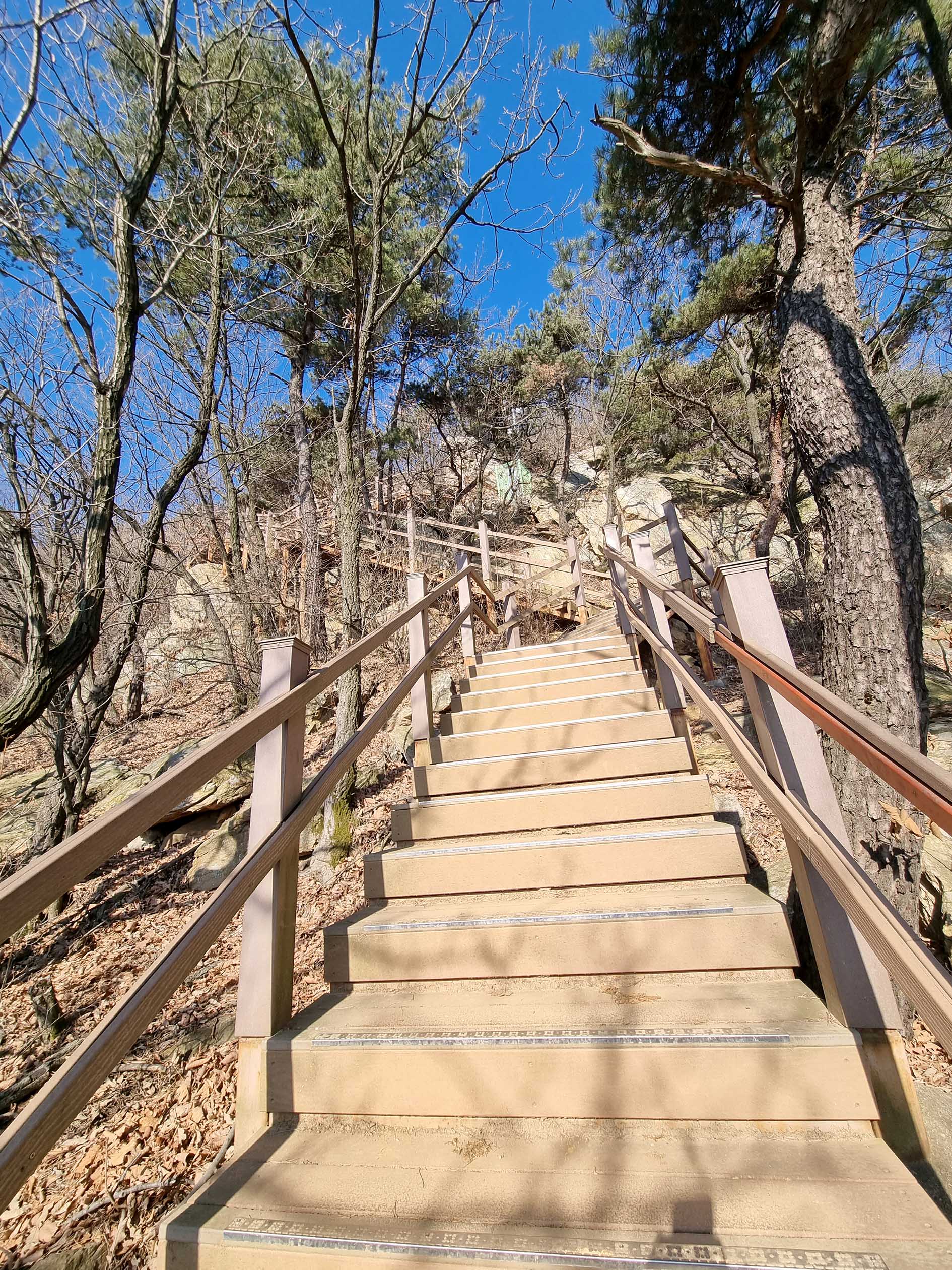 계단을 올라서 100미터 정도 가면 좌측으로 올라가는 철계단이 나오고 완만한 등산로를