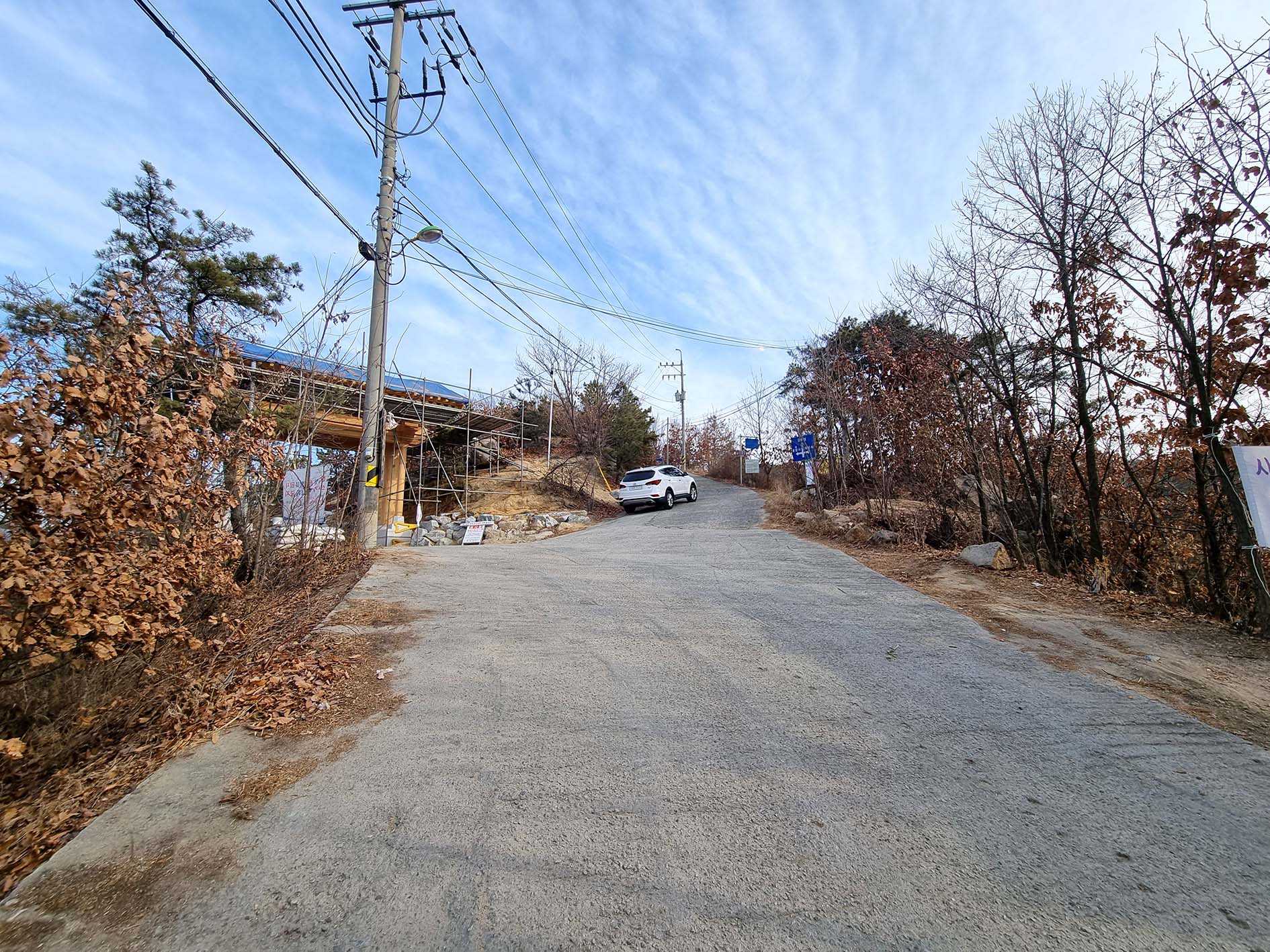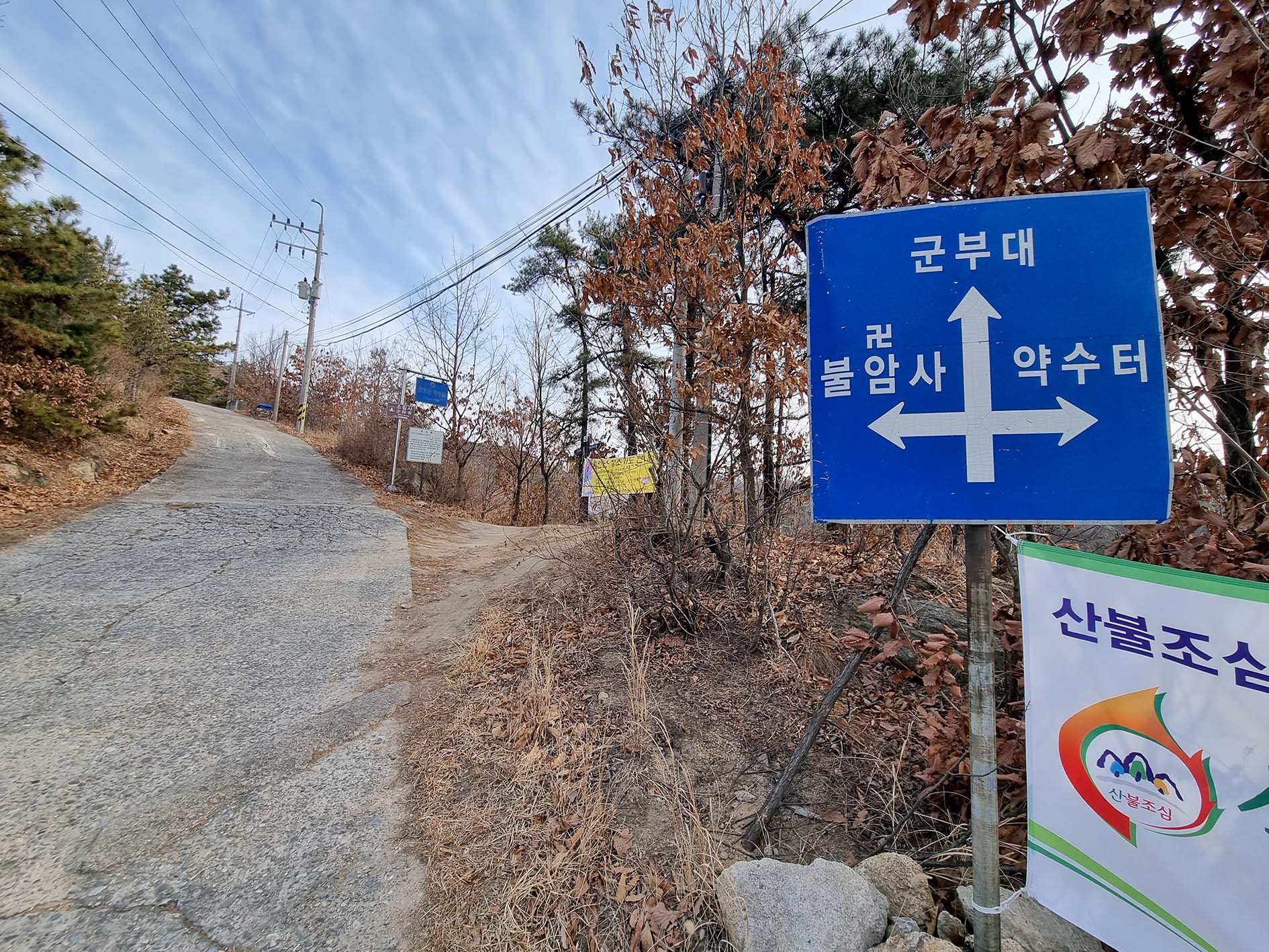 가능동에서 올라오는 도로에 있는 봉화정사 입구 삼거리 이정표.