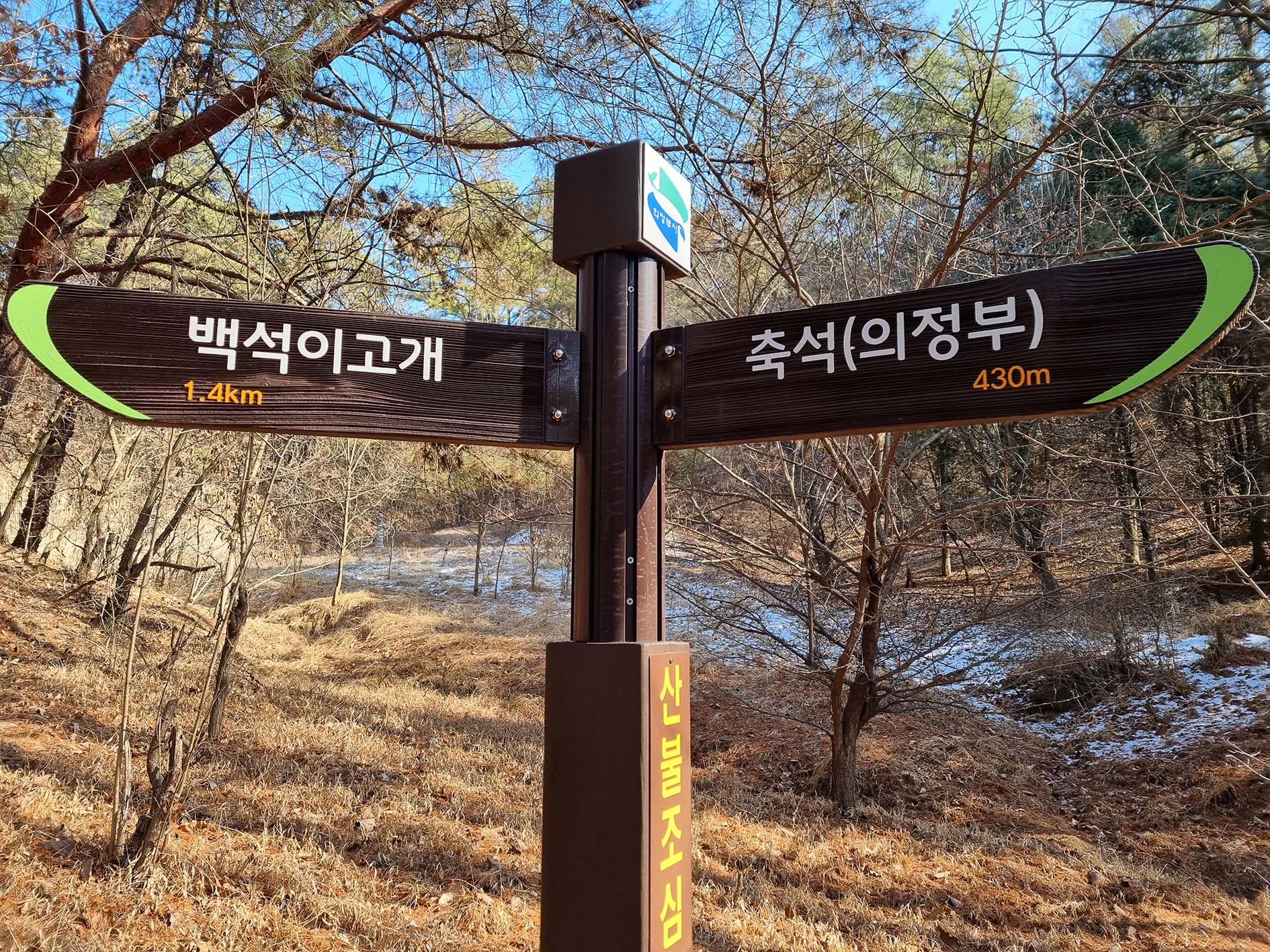 오늘은 이곳에서 축석(축석고개 밑 정류장)으로 하산해 대중교통을 이용하기로 한다.