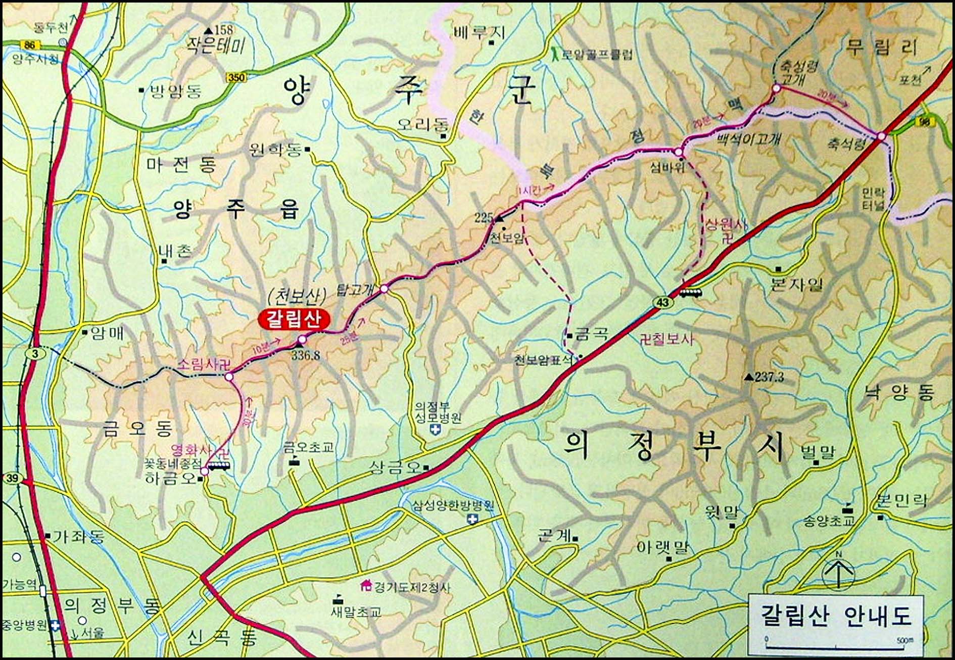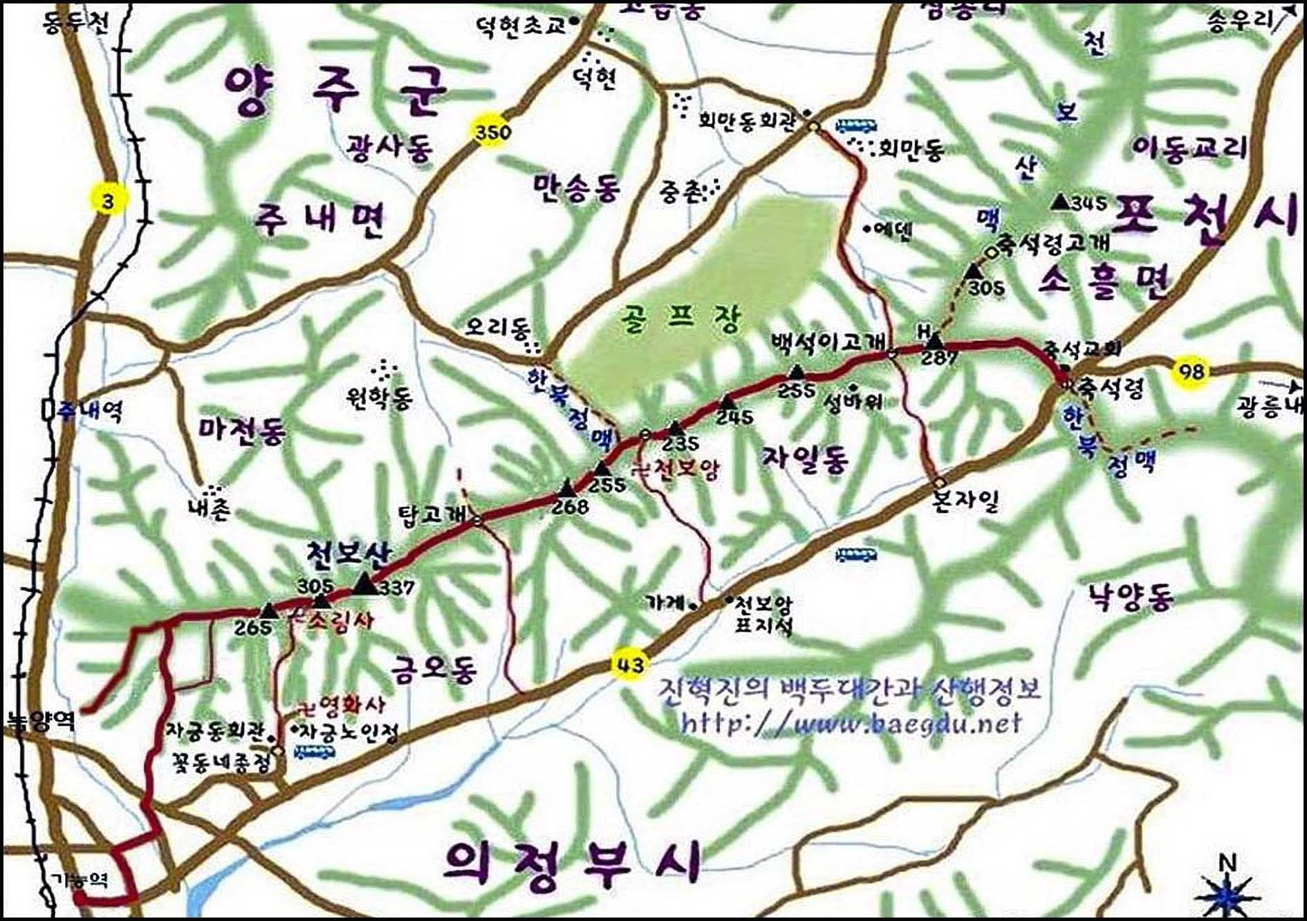 대중교통: 1호선 전철 이용 녹양역 2번 출구로 나와 하동교를 건너면 산행 들머리.